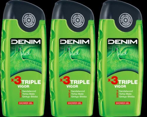 DENIM Musk *3Triple Vigor Duschgel Showergel 3 x 250ml New Denim Musk Duschgel hält die Haut den ganzen Tag über geschmeidig und hydratisiert. Seine Formel ist mit Inhaltsstoffen mit energetisierenden Eigenschaften angereichert. DERMATOLOGISCH GETESTET AUFBAUENDE UND BELEBENDE DUSCHE, DIE UNVERKENNB