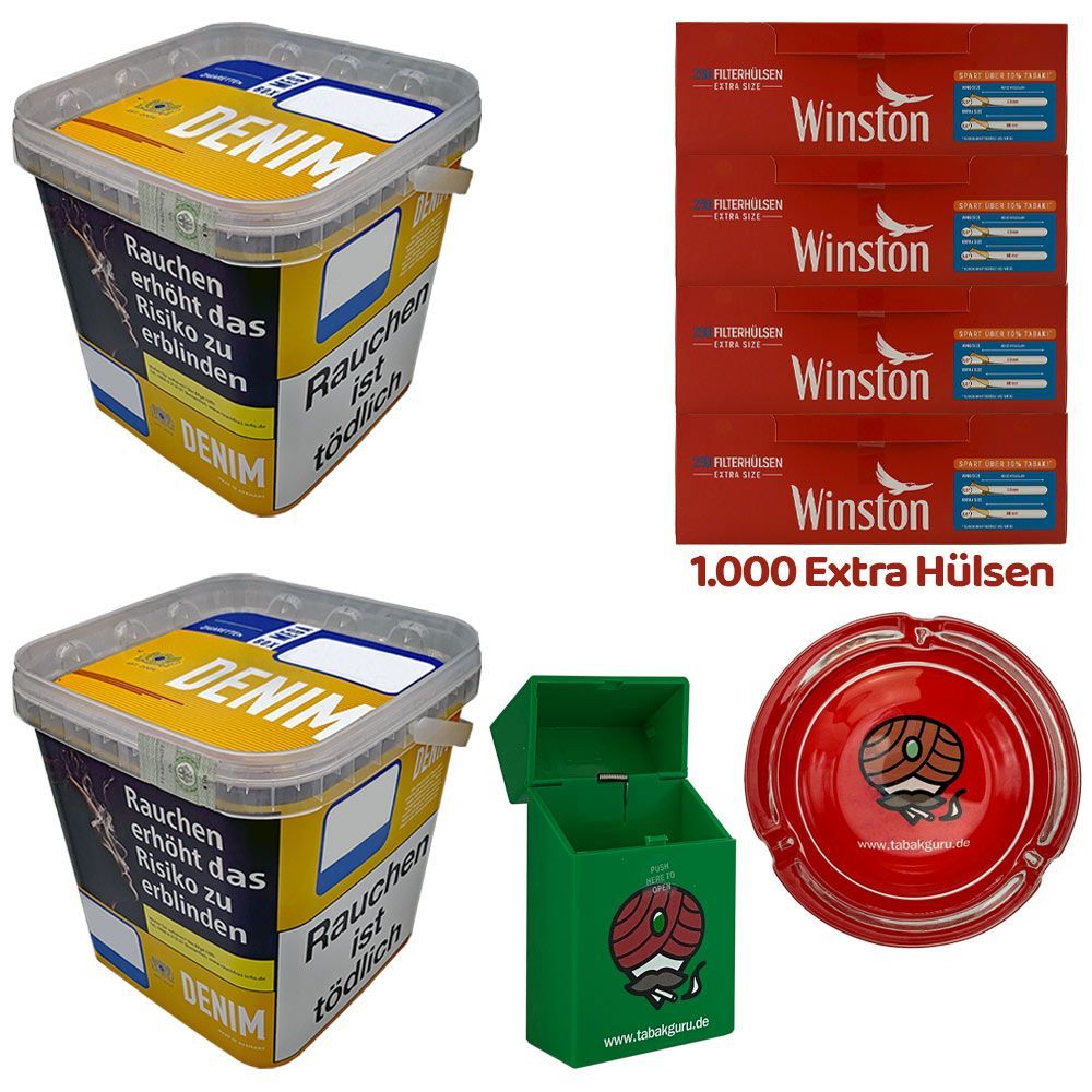Denim Volumentabak Mega Box 2x 220g, 1000 Winston Extra Hülsen, Glasascher, Box