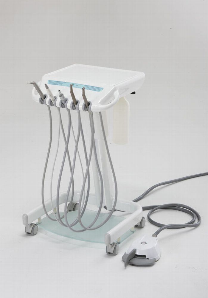 Aircart, die mobile Behandlungseinheit von Denteurope! Er ist ausgestattet mit Luftanschluss, Wasseranschluss, Stecker für nachrüstbaren Stromanschluß, Mehrfunktionsspritze, 2 Midwestschläuchen für Turbine und Mikromotor, Wasserspeicher und Fußschalter. Modulare Aufrüstmöglichkeiten ermöglichen die Verwendung eines NSK Micromotors, piezonelektrischem ZEG oder Turbinen mit oder ohne Licht.