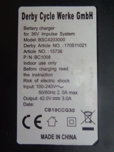 Derby Cycle 36V Impulse Ladegerät BSC 4203000 Stecker XLR 4-polig Privatauktion- Ohne Gewährleistung. Fragen werden beantwortet.