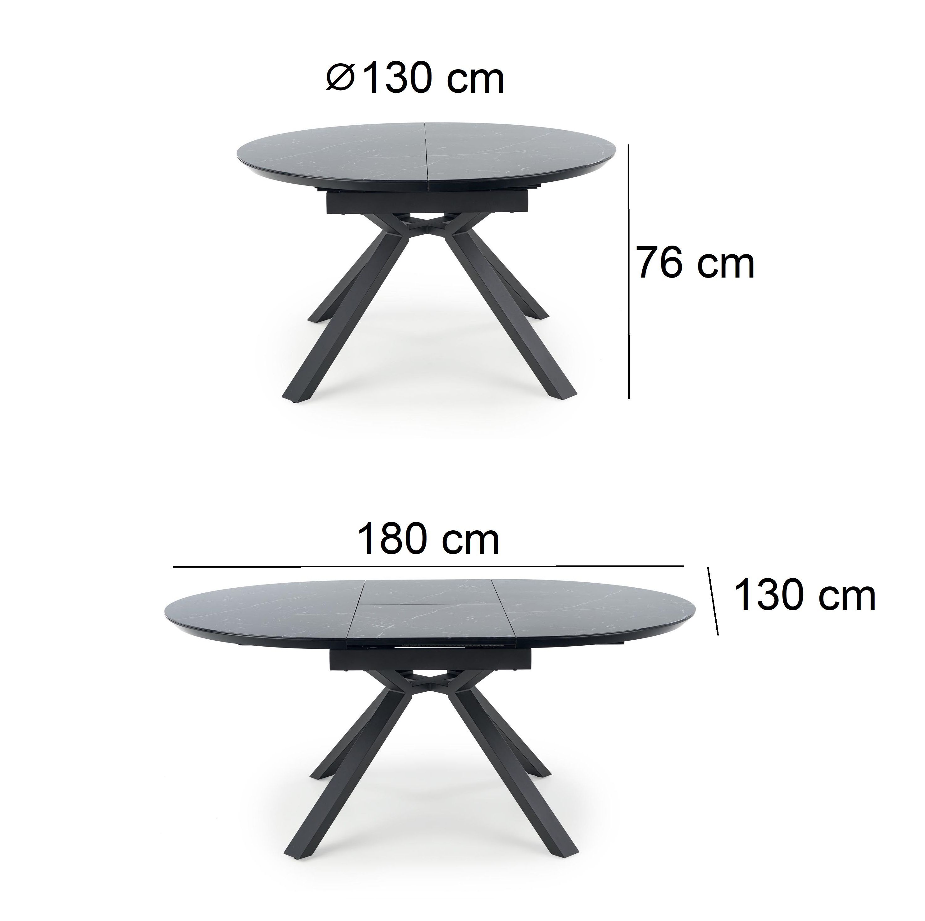 Design Esstisch rund HA-500 Glasplatte Marmor Schwarz ausziehbar Glas (Stühle und Dekoration nicht im Lieferumfang enthalten) MATERIAL: Oberfläche: Glasplatte mit Marmoroptik Gestell: Metall (Schwarz pulverbeschichtet) MAßE (ca.): - Breite: 130 - 180 cm (ausziehbar) - Höhe: 76 cm - Tiefe: 130 cm - G