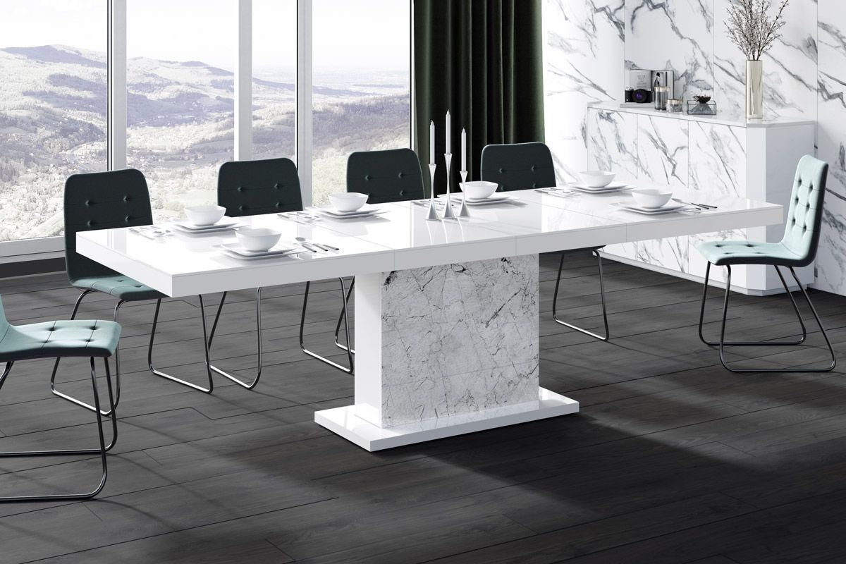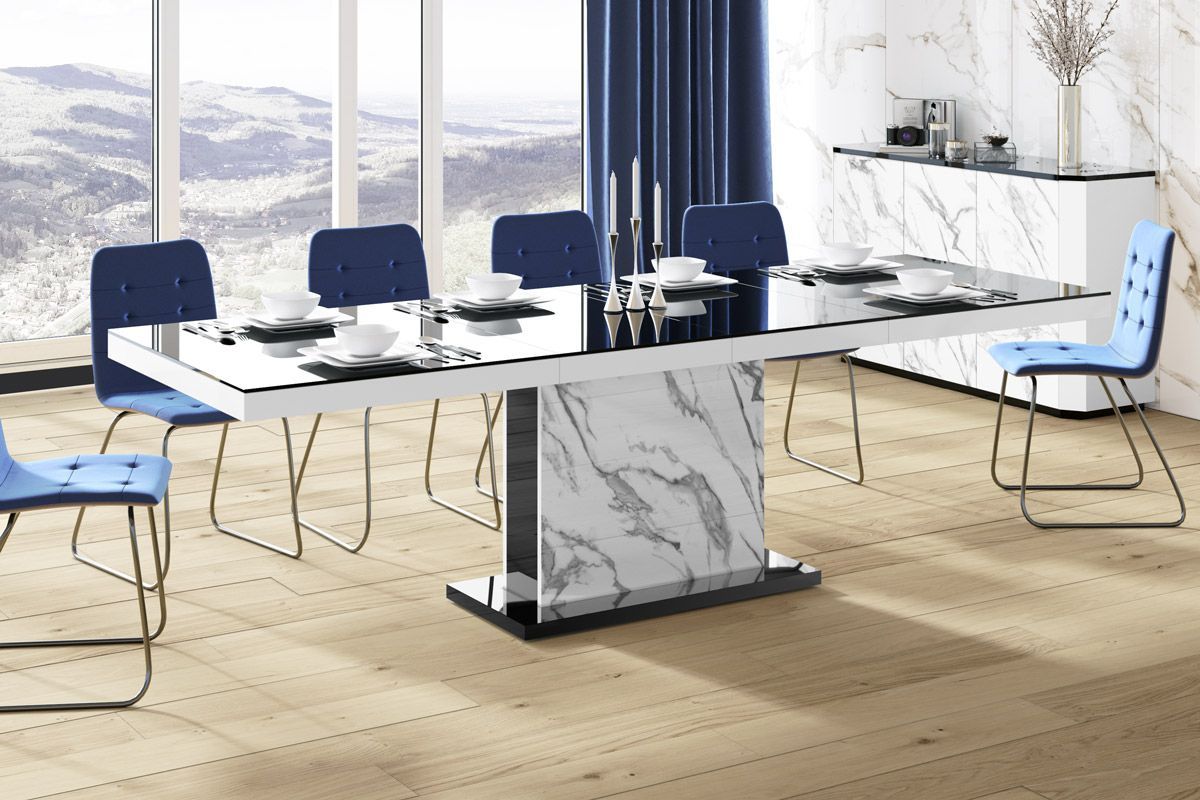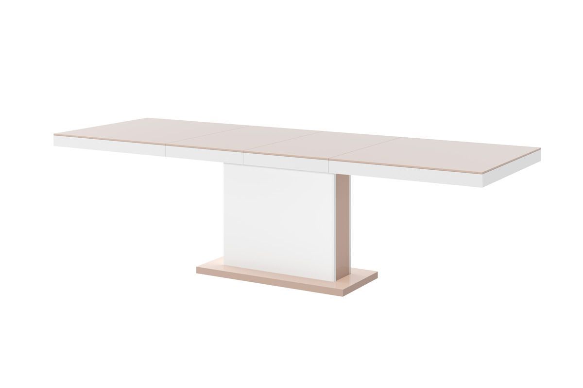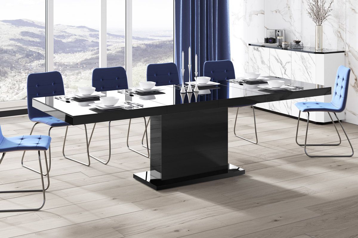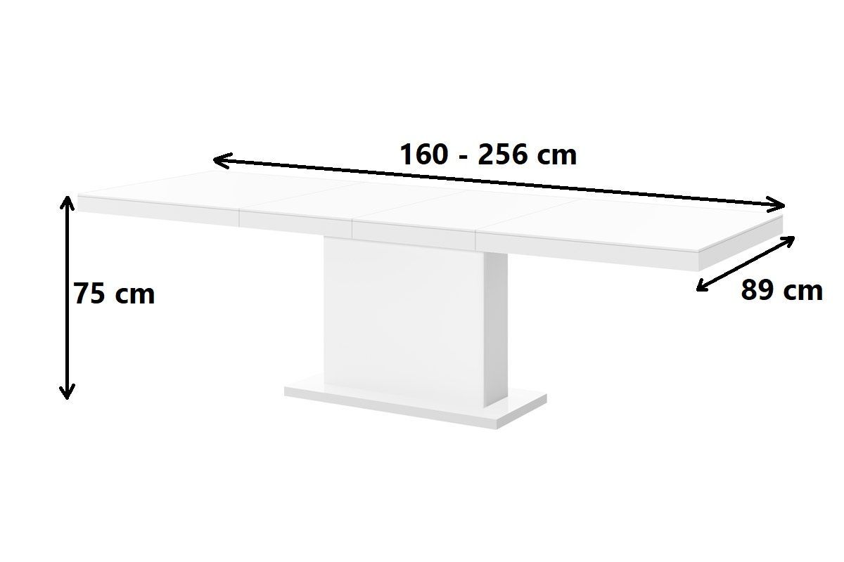 (Stühle und Dekoration nicht im Lieferumfang enthalten) MATERIAL: - MDF beschichtet mit einer hochglanz Acryl-Folie (Highgloss) - abgeschlossen mit ABS-Kanten MAßE: - Breite (ausziehbar): 160 bis 256 cm - Höhe: 75 cm - Tiefe: 89 cm - Gewicht 90 kg (2 Verlängerungsplatten werden bequem und nicht sich