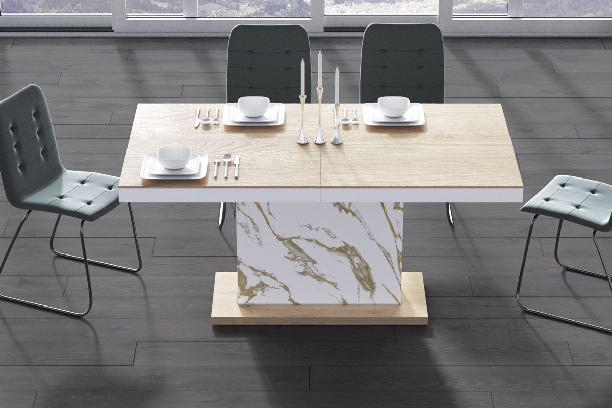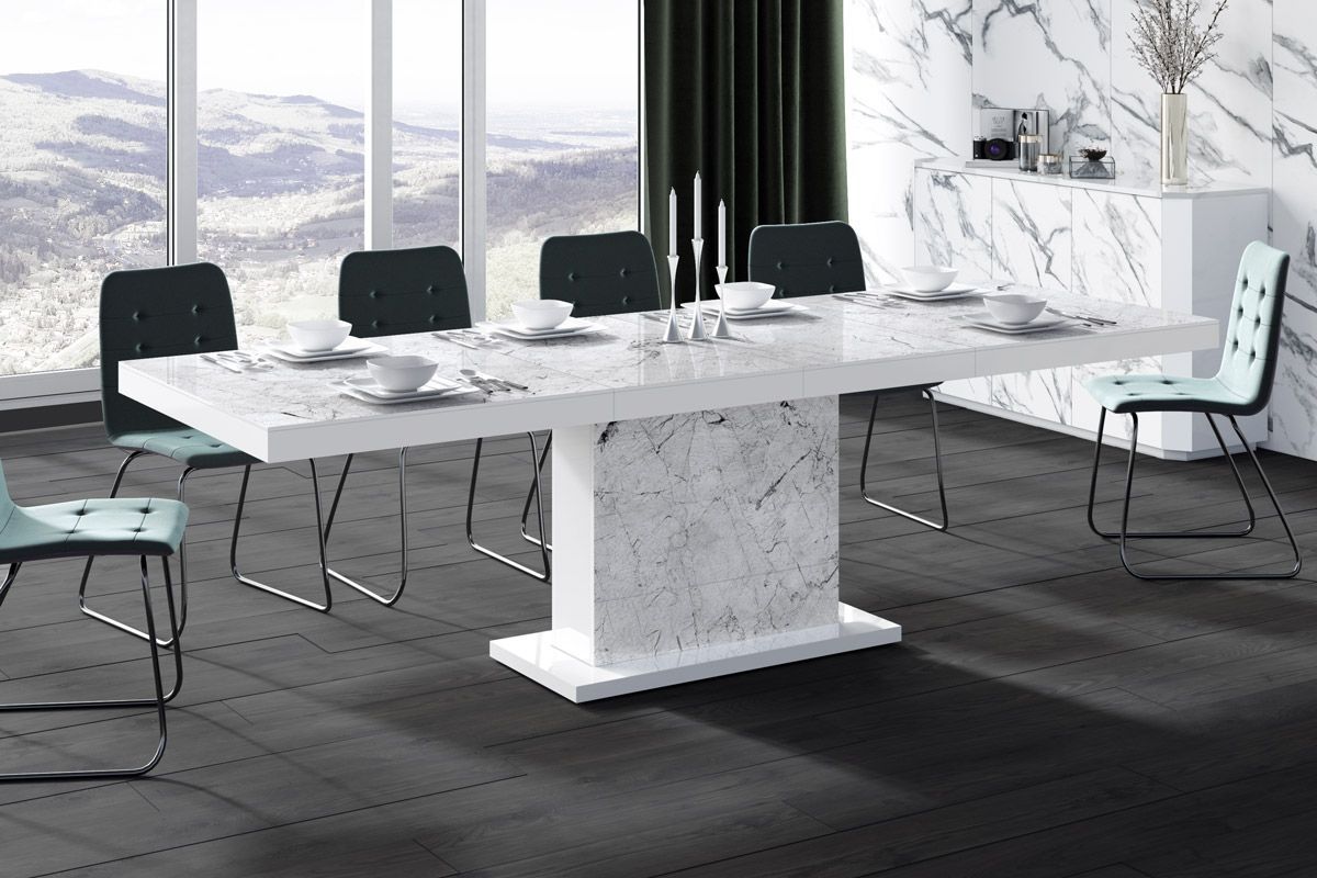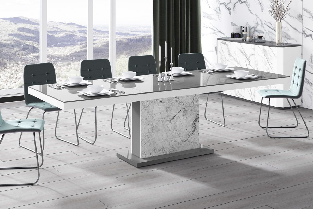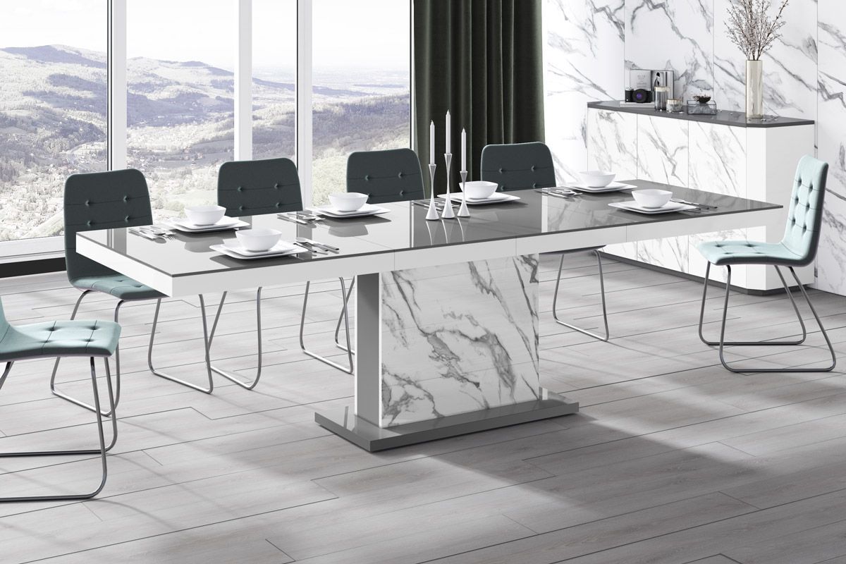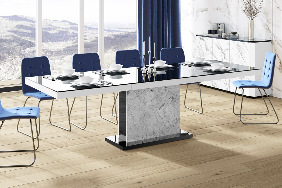(Stühle und Dekoration nicht im Lieferumfang enthalten) MATERIAL: - MDF beschichtet mit einer hochglanz Acryl-Folie (Highgloss) - abgeschlossen mit ABS-Kanten MAßE: - Breite (ausziehbar): 160 bis 256 cm - Höhe: 75 cm - Tiefe: 89 cm - Gewicht 90 kg (2 Verlängerungsplatten werden bequem und nicht sich