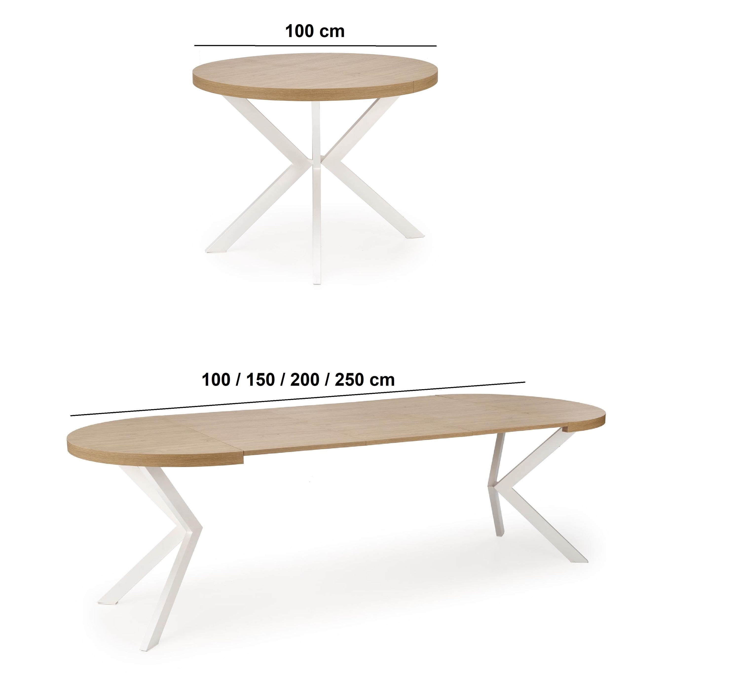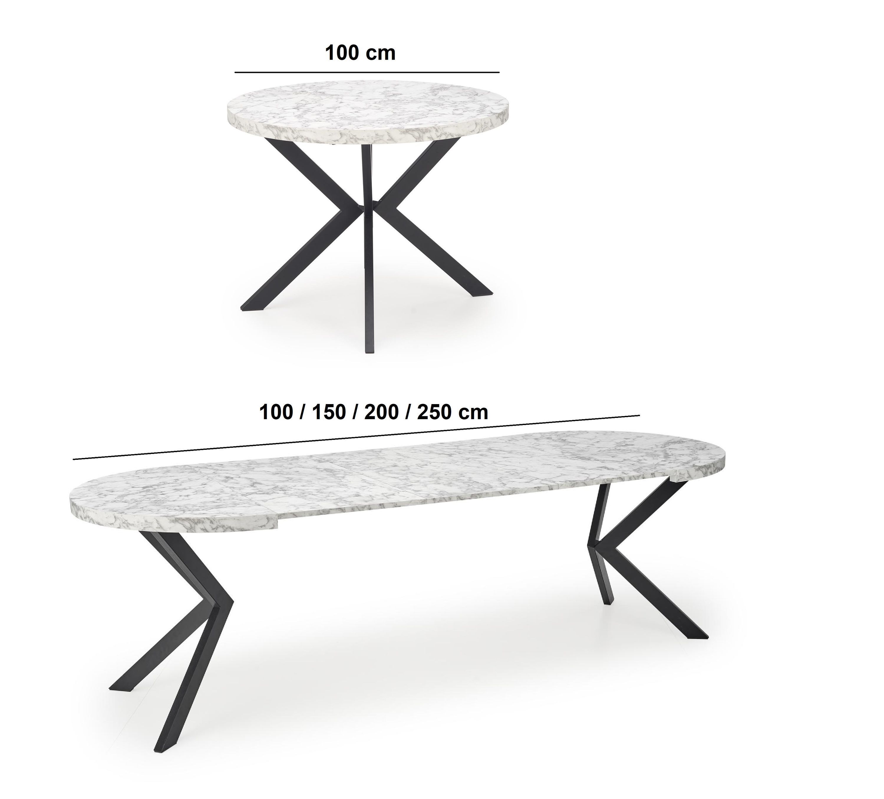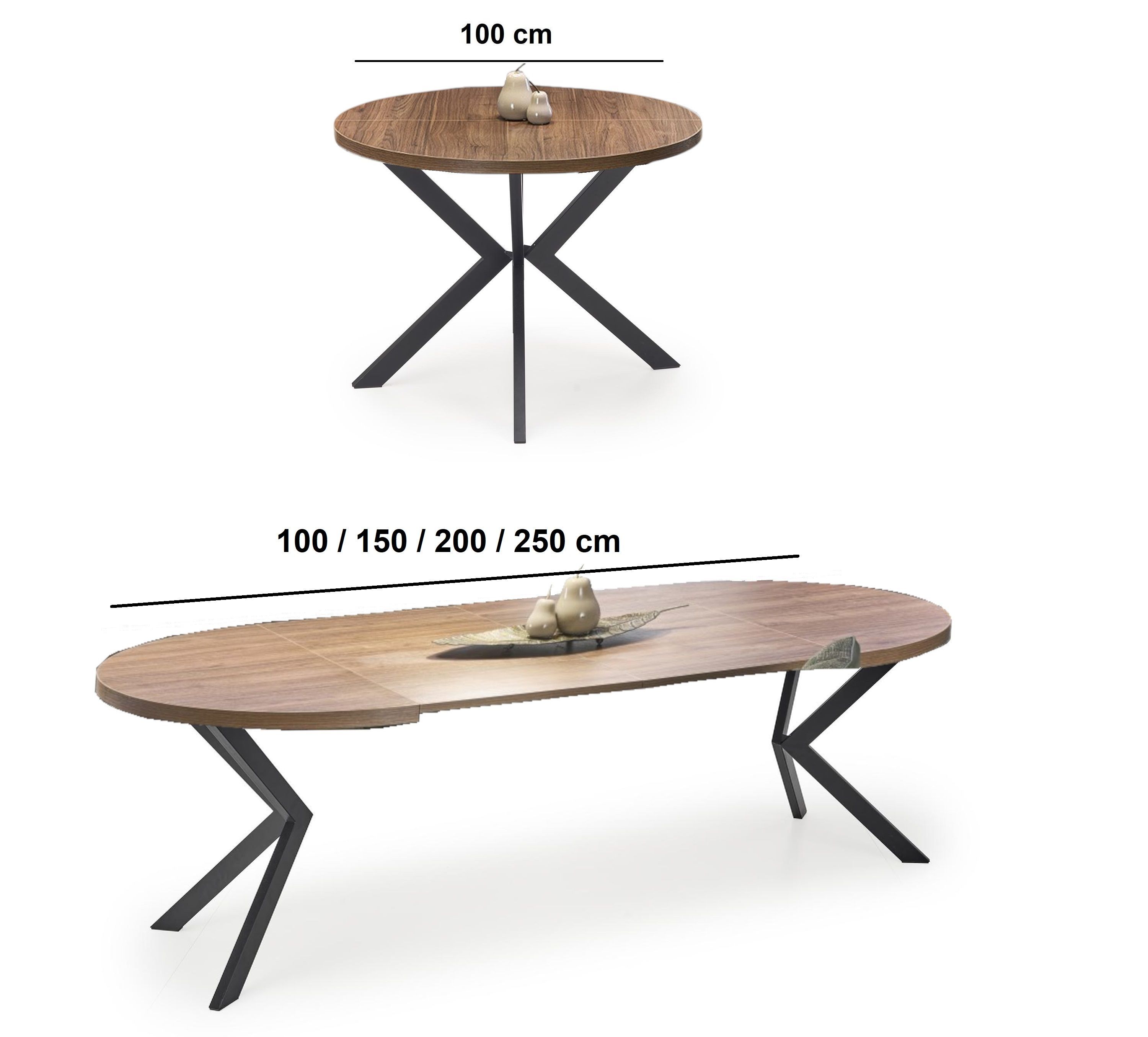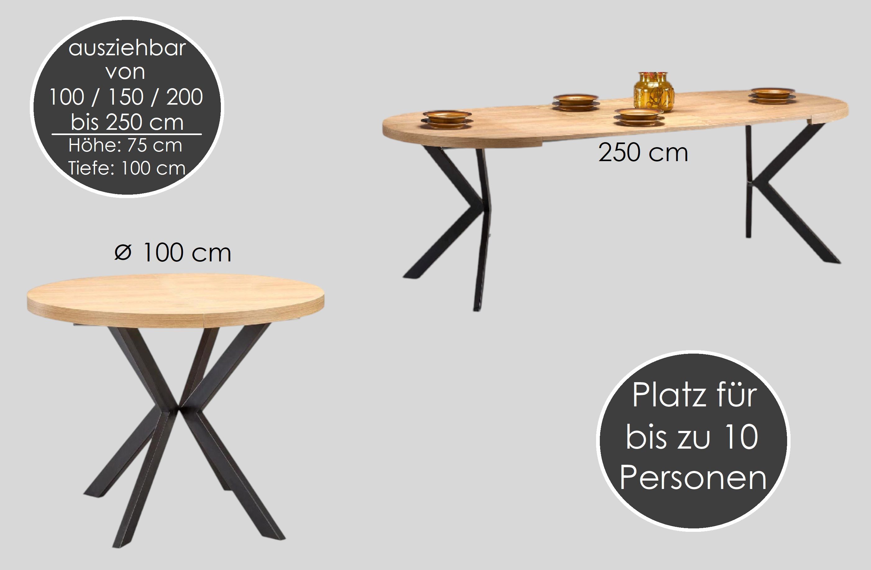 Design Esstisch Tisch rund HA-222 ausziehbar 100 - 250 cm (Stühle und Dekoration nicht im Lieferumfang enthalten) MATERIAL: - Gestell: pulverbeschichtetes Metall MAßE: - Breite: 100 150 200 250 cm (3 Verlängerungsplatten je 50cm Breite) - Höhe: 75 cm - Tiefe: 100 cm WICHTIGE VERSANDINFORMATIONEN: -