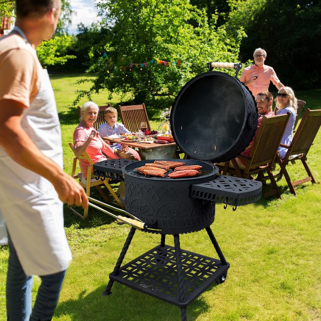 • Sicherheitshinweise: Grill nur im Freien aufstellen – auf stabilem, ebenem und hitzebeständigem Untergrund. Mindestabstand von 1,5?m zu brennbaren Materialien einhalten. Nur mit Holzkohle, Briketts oder geeigneter Grillkohle betreiben. Keine brennbaren Flüssigkeiten wie Benzin oder Spiritus verwenden. Achtung: Bei Verwendung in geschlossenen Räumen besteht Erstickungsgefahr durch Kohlenmonoxid.