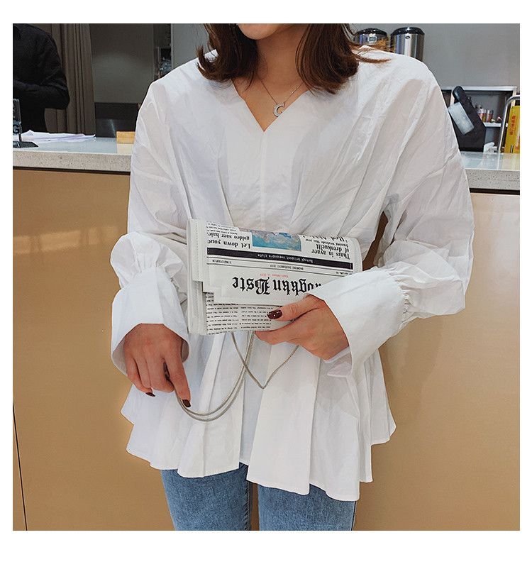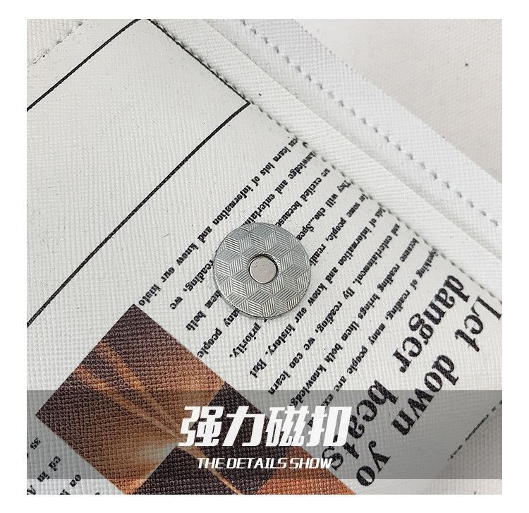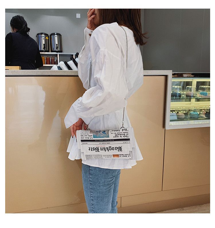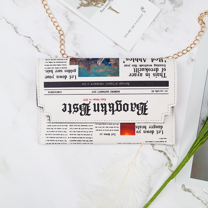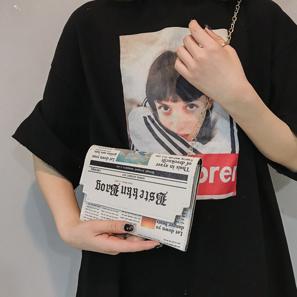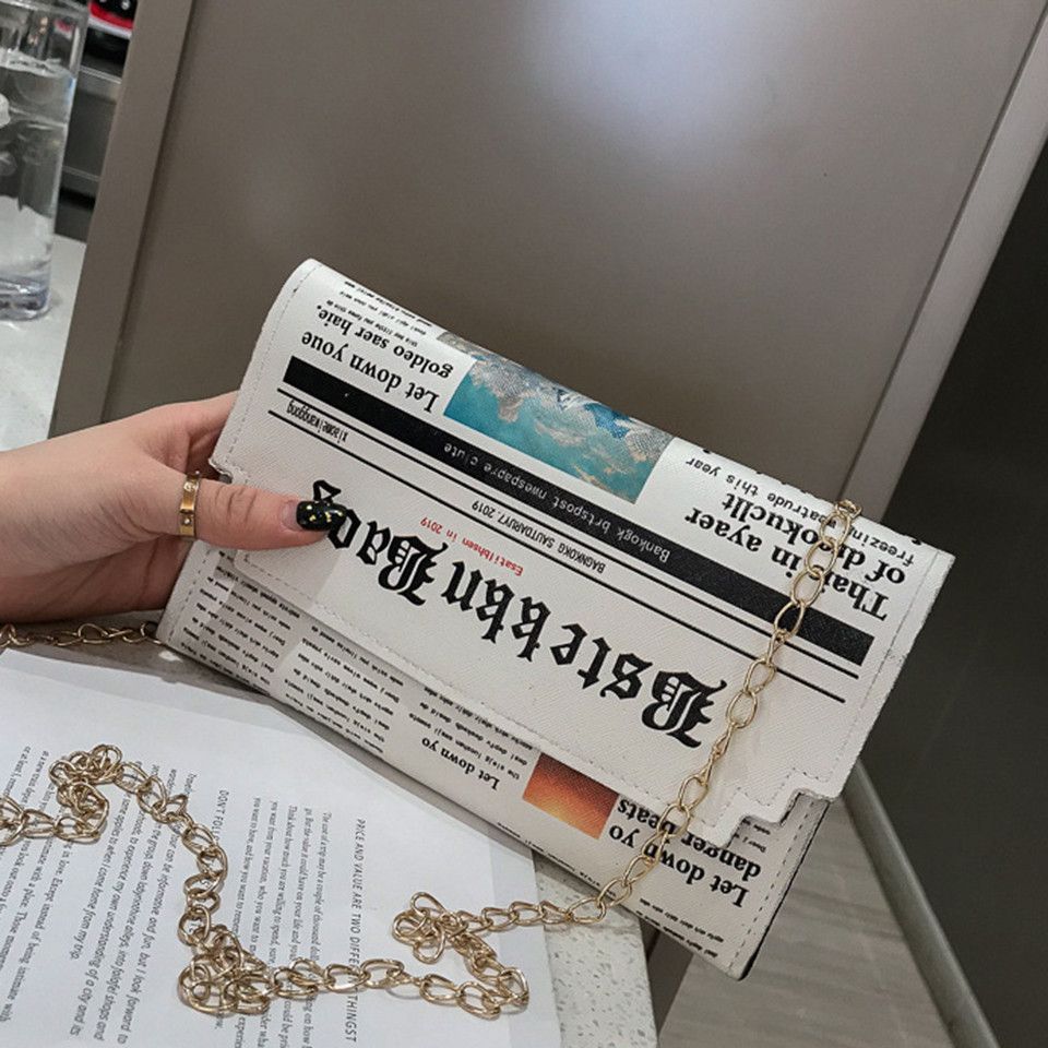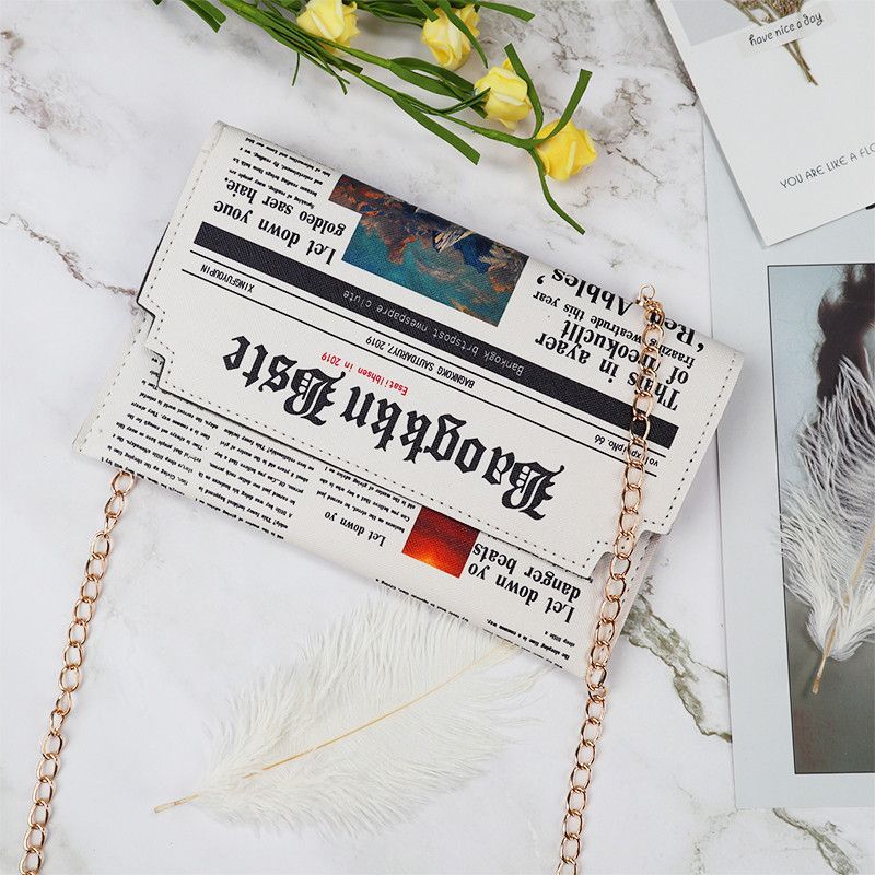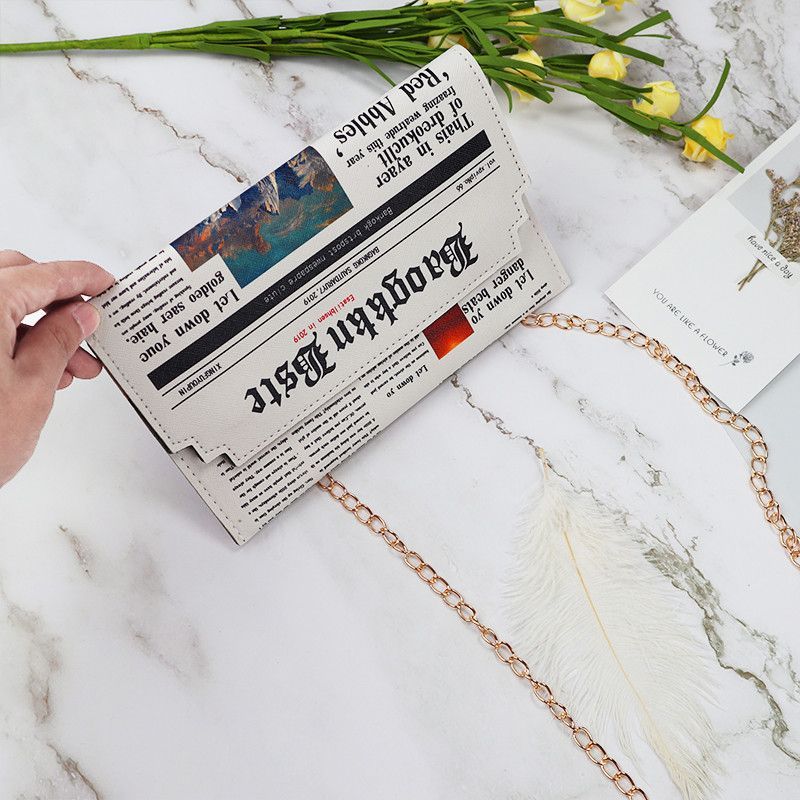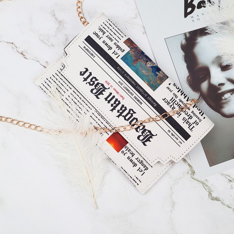 Eine kleine Damenhandtasche in Zeitungsoptik . Sie ist sehr gut verarbeitet , variiert etwas in der Kette zum tragen . Besteht aus Kunstleder , Schließmechanismus besteht aus Druckknöpfen .