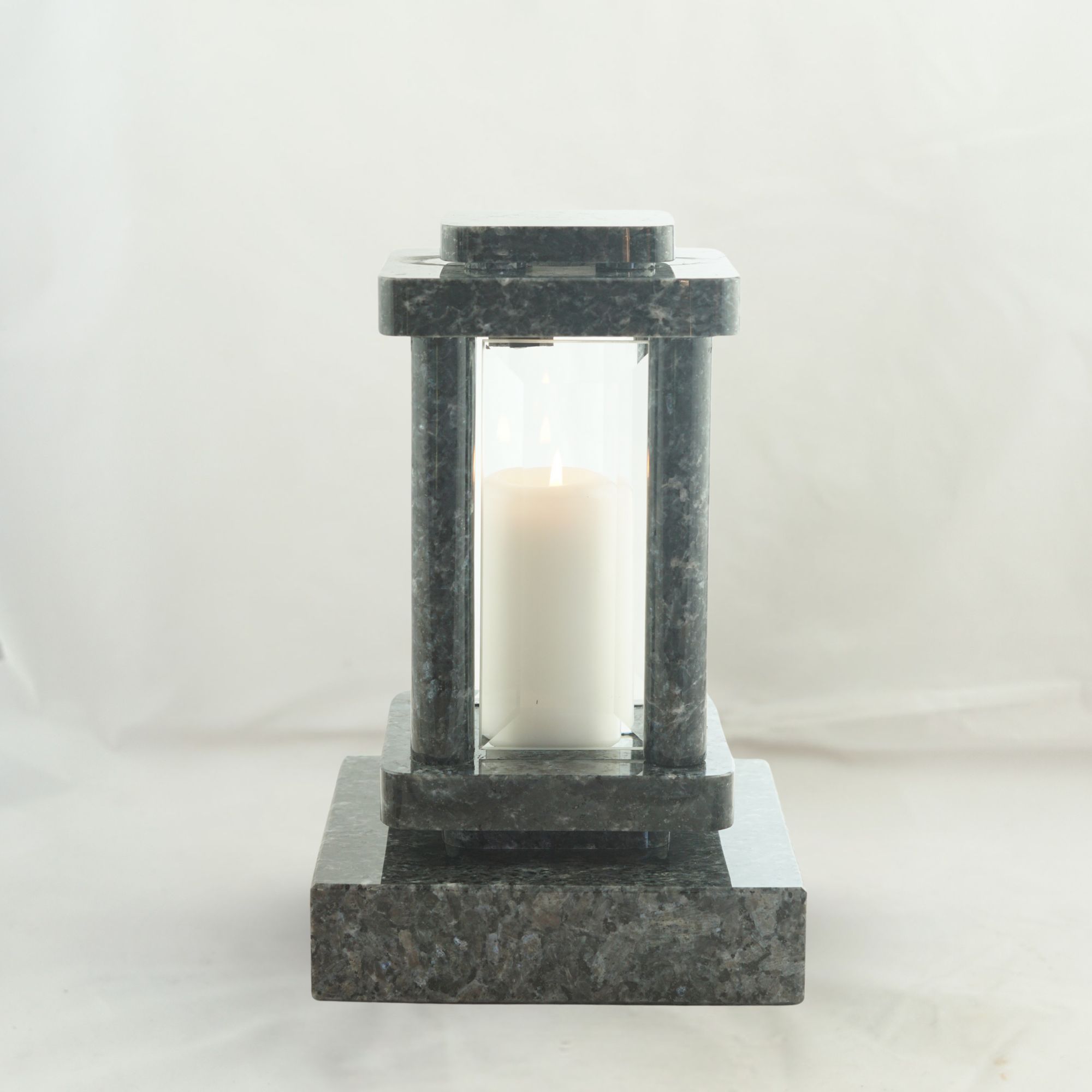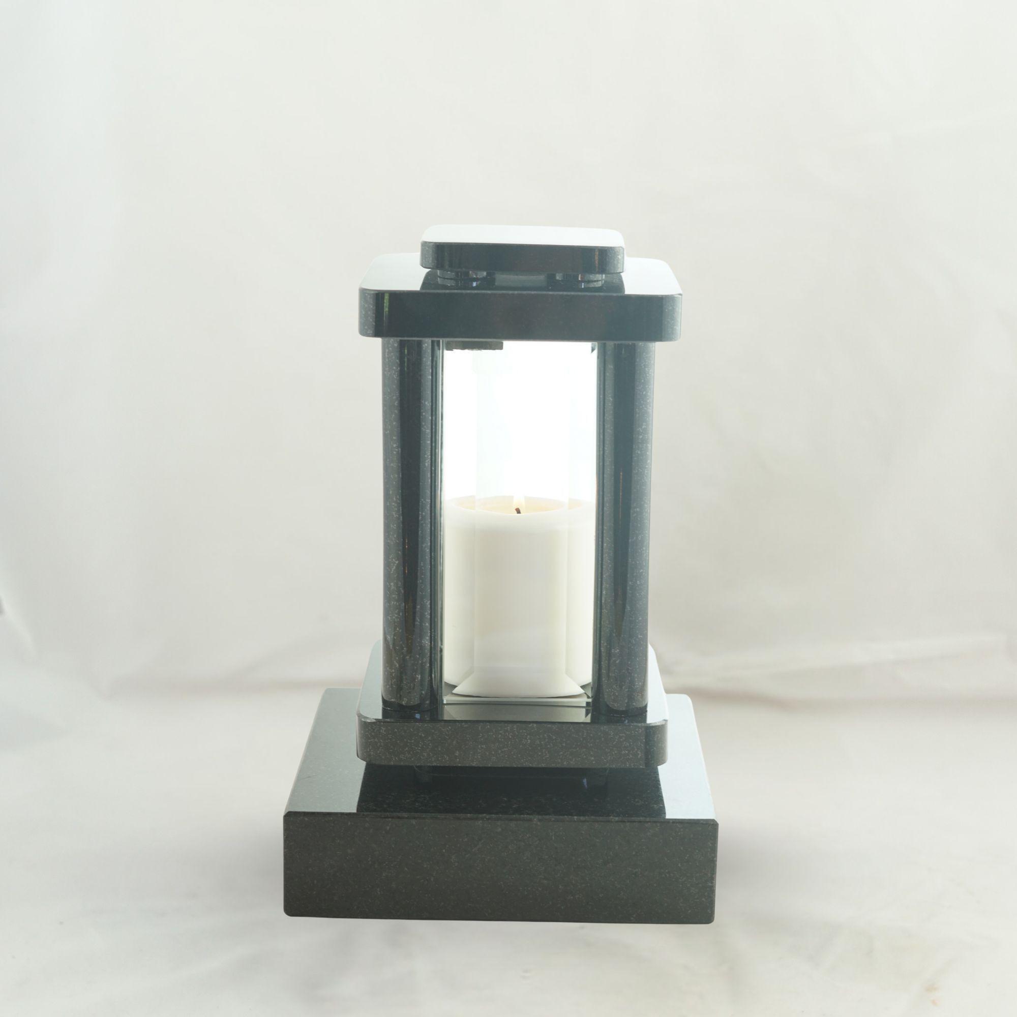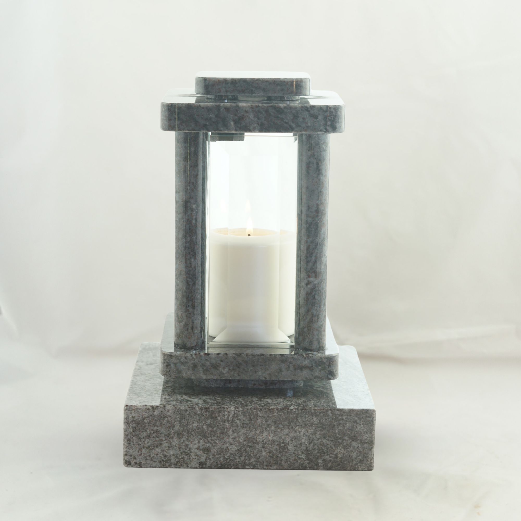 Diese Grablampe „Modern“ mit klaren Glasflächen, verstecktem Drehmechanismus und geradlinigem Design (14,5×14,5 cm Grundfläche, ca. 25 cm Höhe) steht auf einem Sockel in verschiedenen Granitfarben, der nicht vorgebohrt ist. Die Lampe ist aus hochwertigem, wetterfestem Granit, poliert, witterungsbest