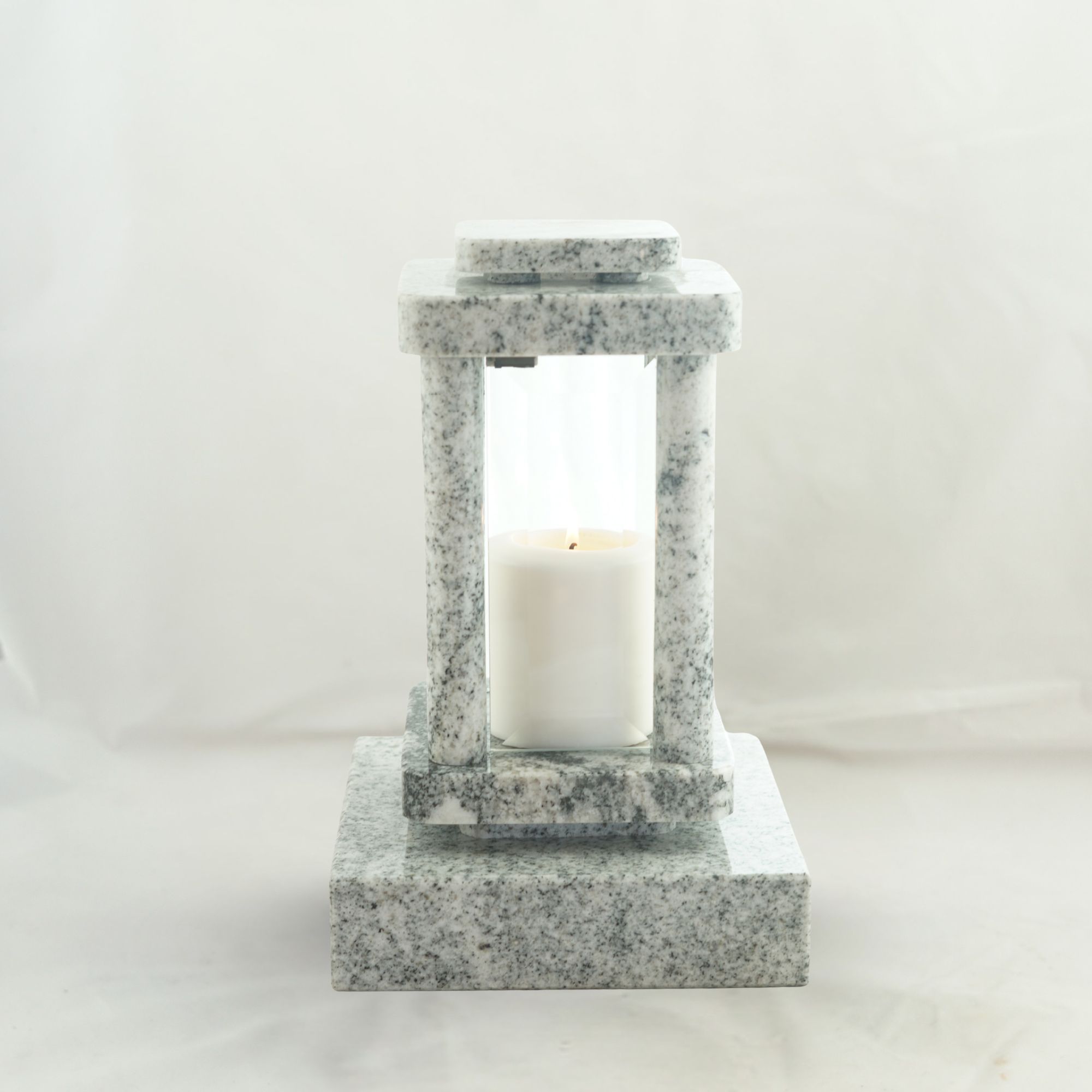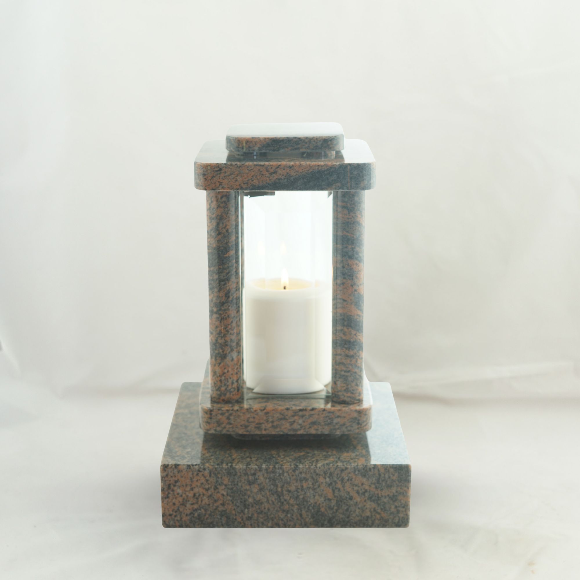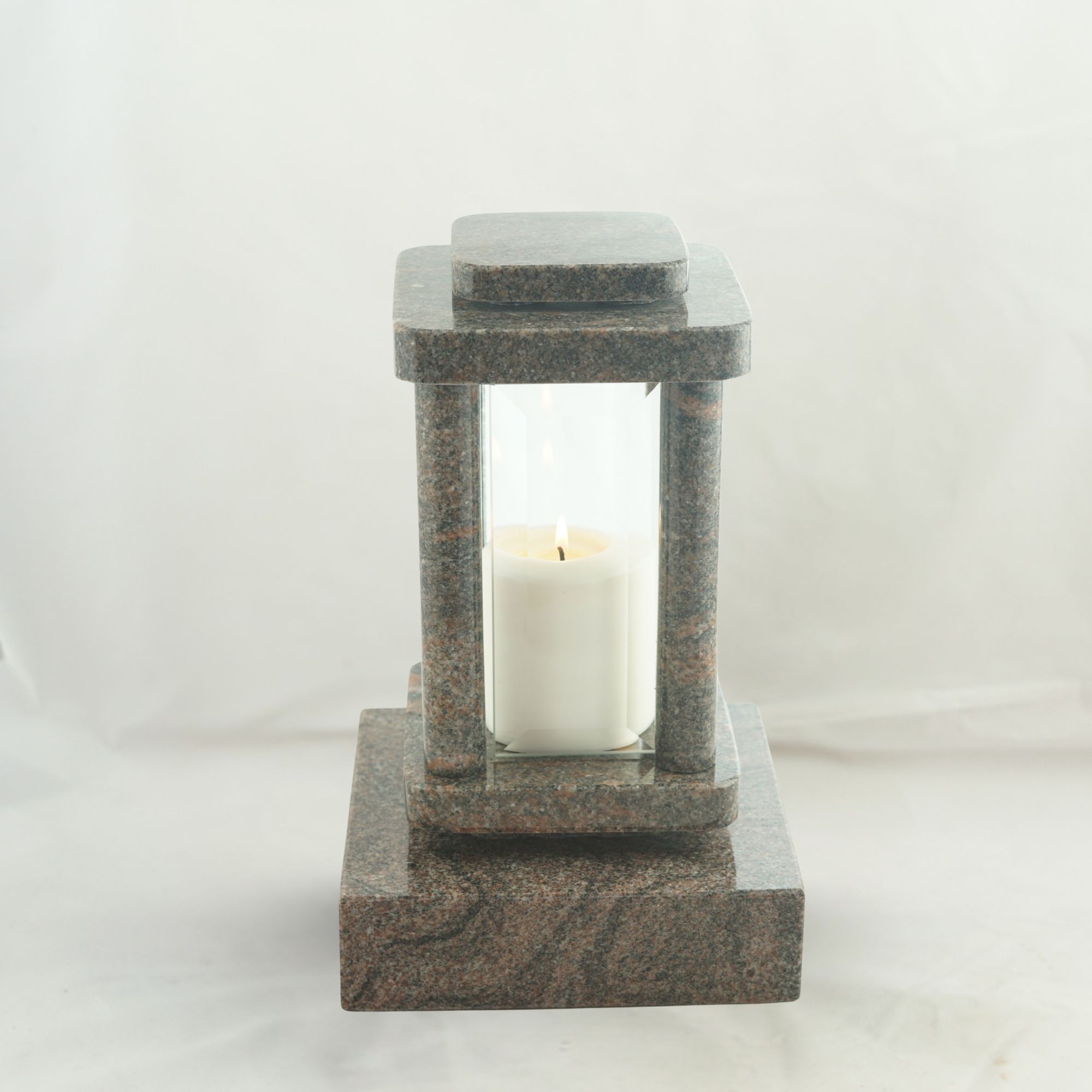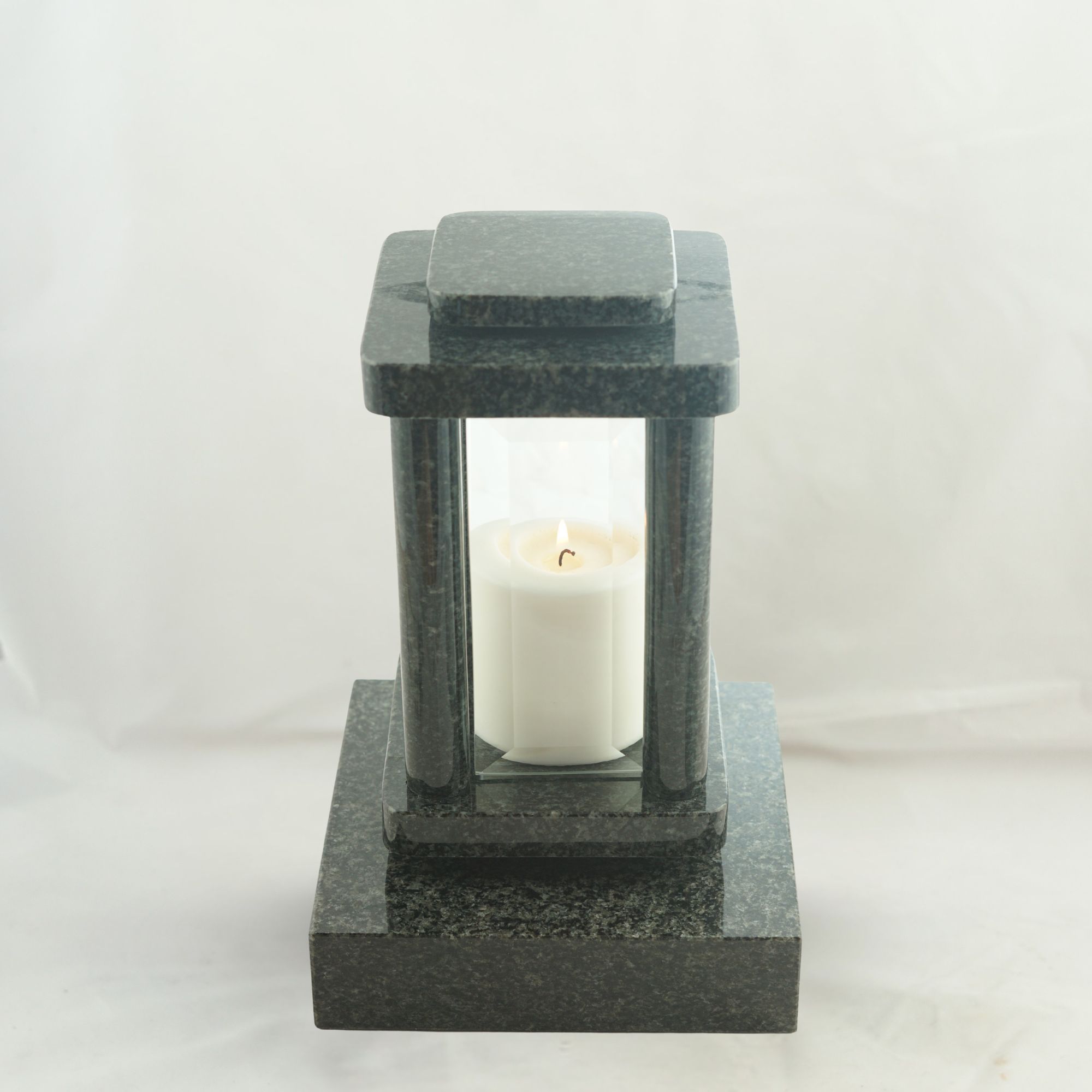 Diese Grablampe „Modern“ mit klaren Glasflächen, verstecktem Drehmechanismus und geradlinigem Design (14,5×14,5 cm Grundfläche, ca. 25 cm Höhe) steht auf einem Sockel in verschiedenen Granitfarben, der nicht vorgebohrt ist. Die Lampe ist aus hochwertigem, wetterfestem Granit, poliert, witterungsbest