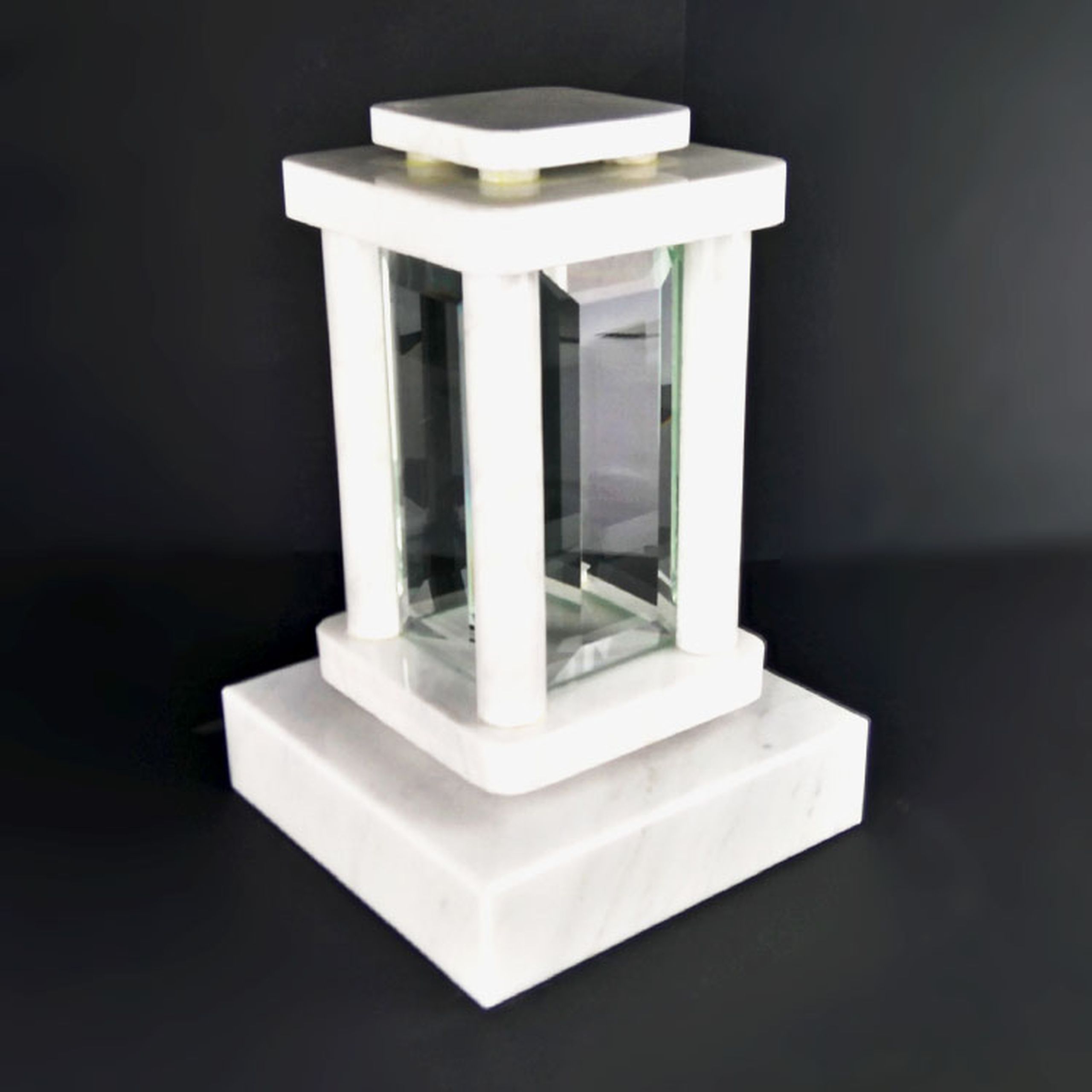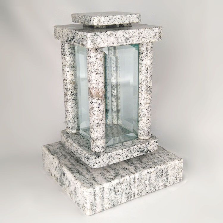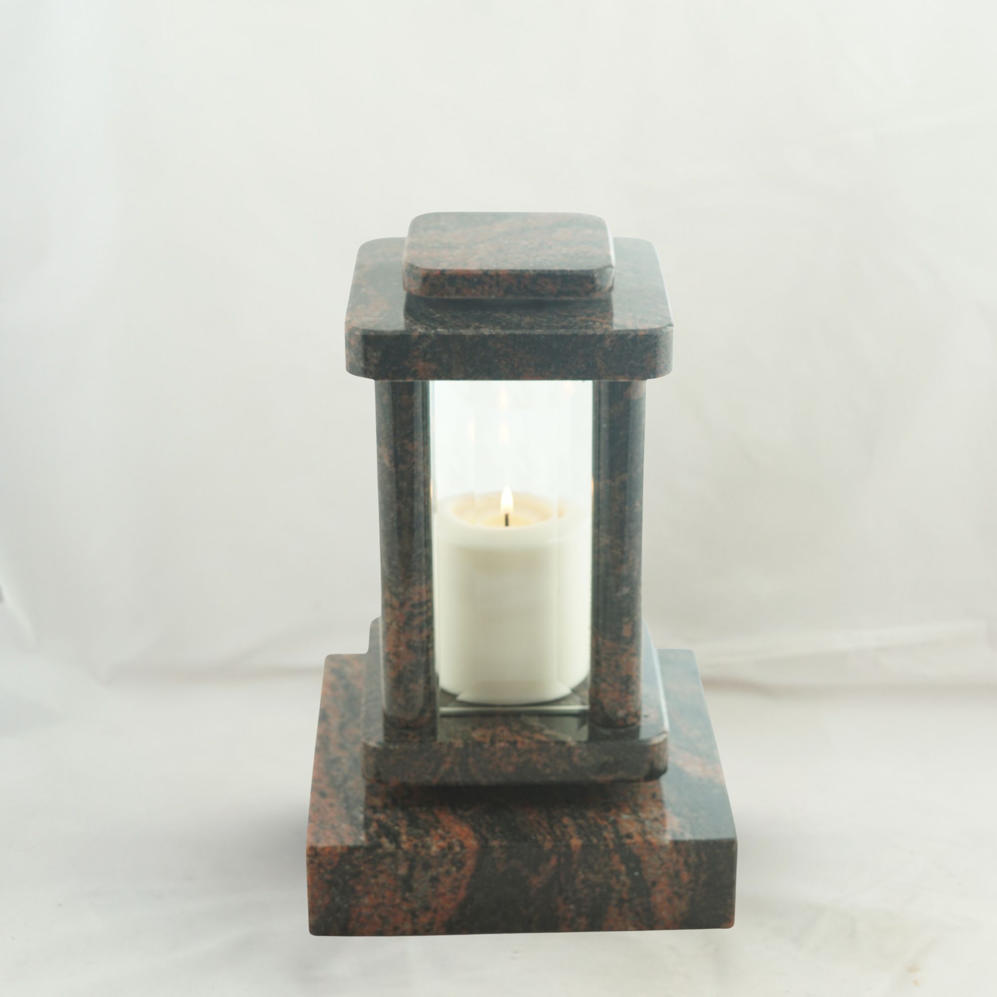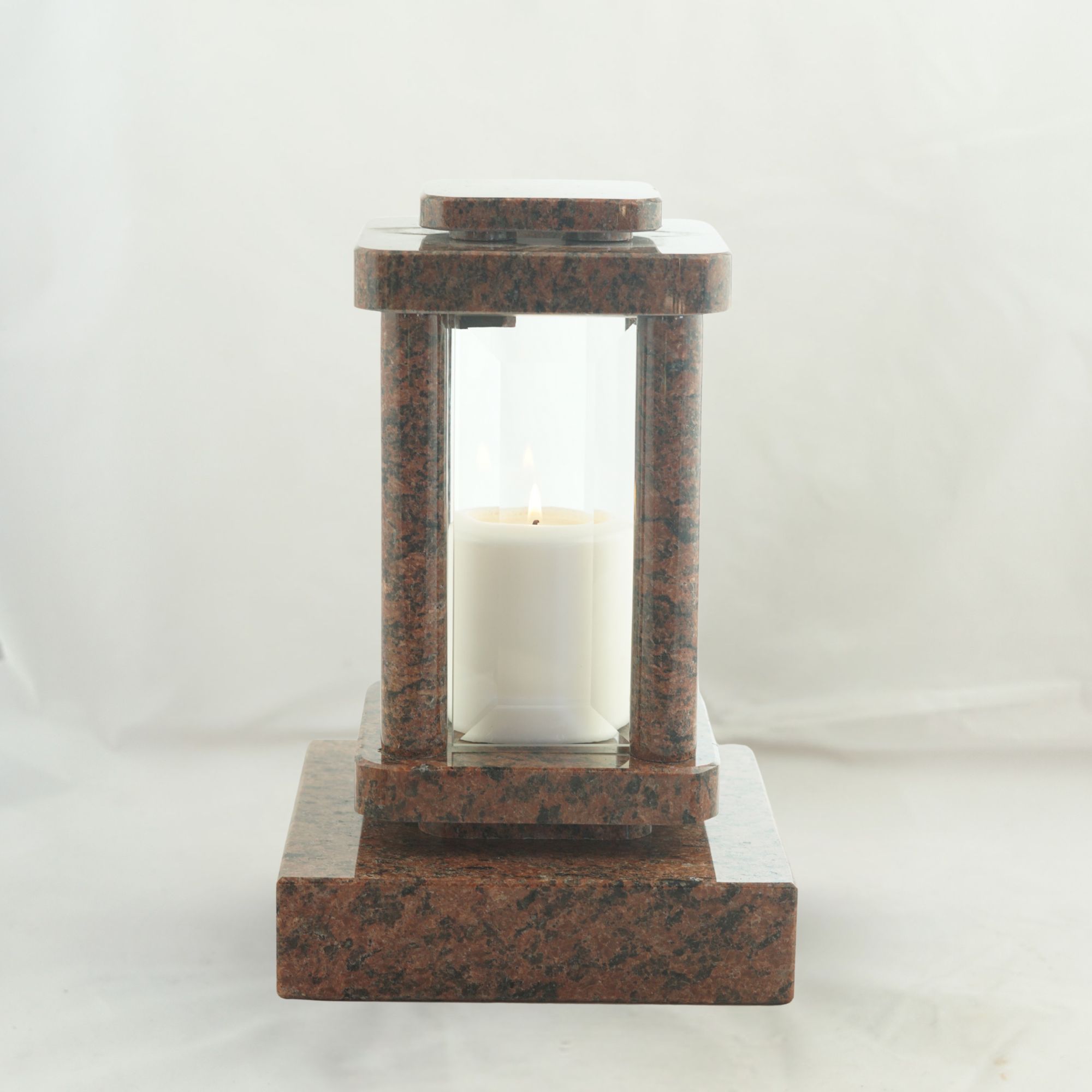 Diese Grablampe „Modern“ mit klaren Glasflächen, verstecktem Drehmechanismus und geradlinigem Design (14,5×14,5 cm Grundfläche, ca. 25 cm Höhe) steht auf einem Sockel in verschiedenen Granitfarben, der nicht vorgebohrt ist. Die Lampe ist aus hochwertigem, wetterfestem Granit, poliert, witterungsbest