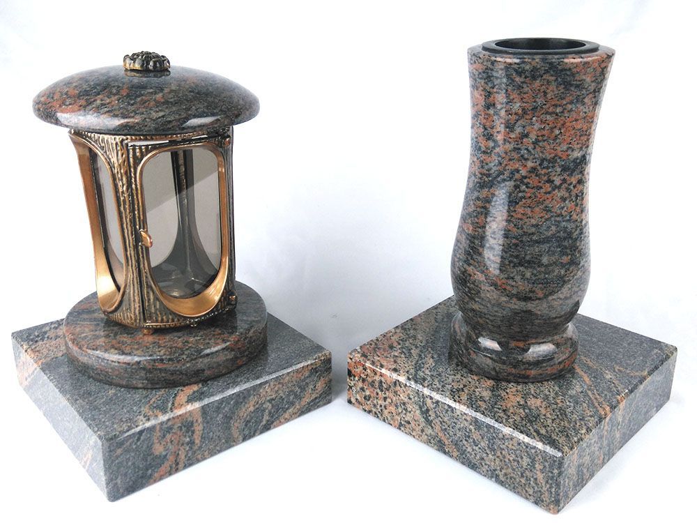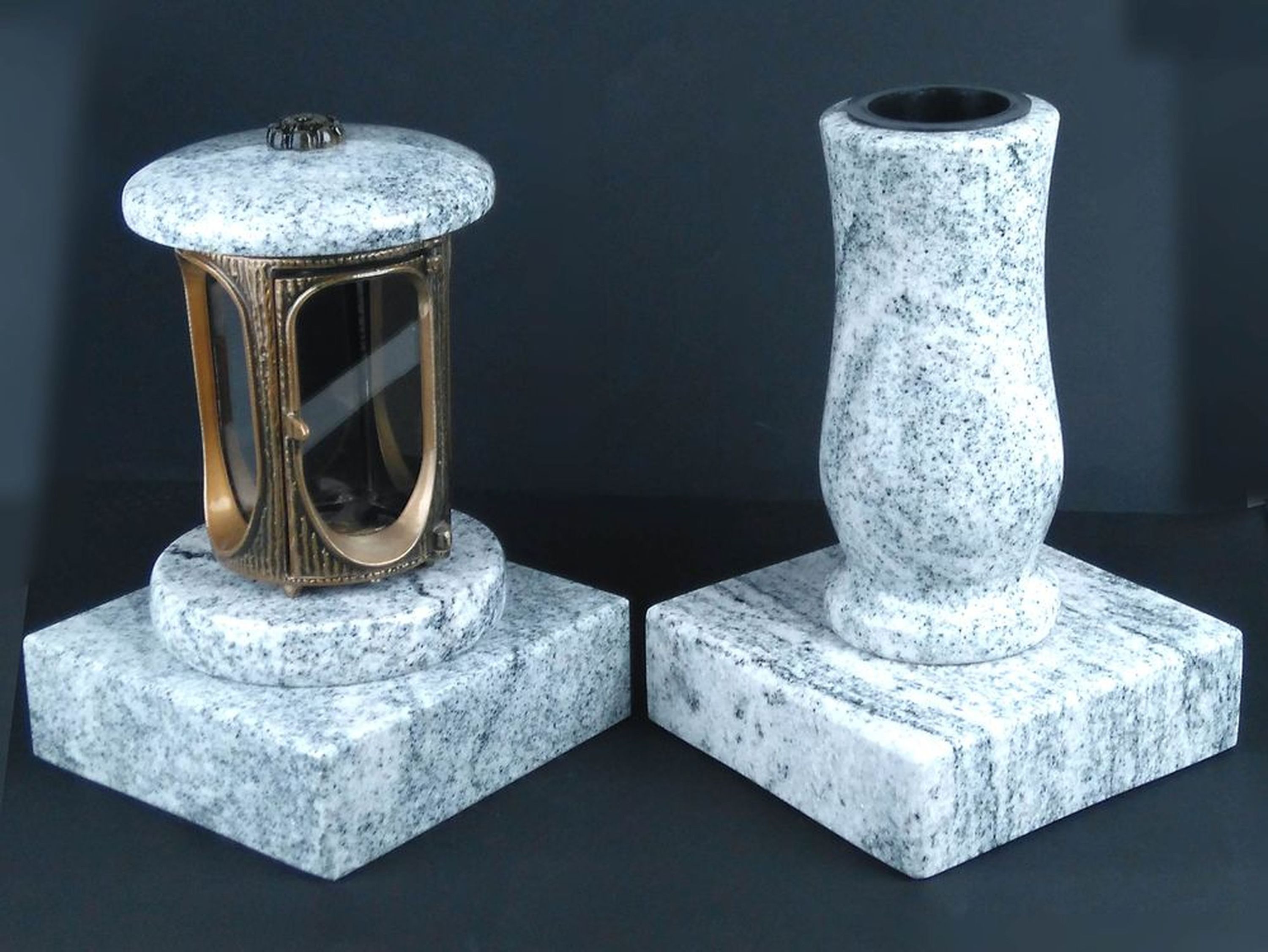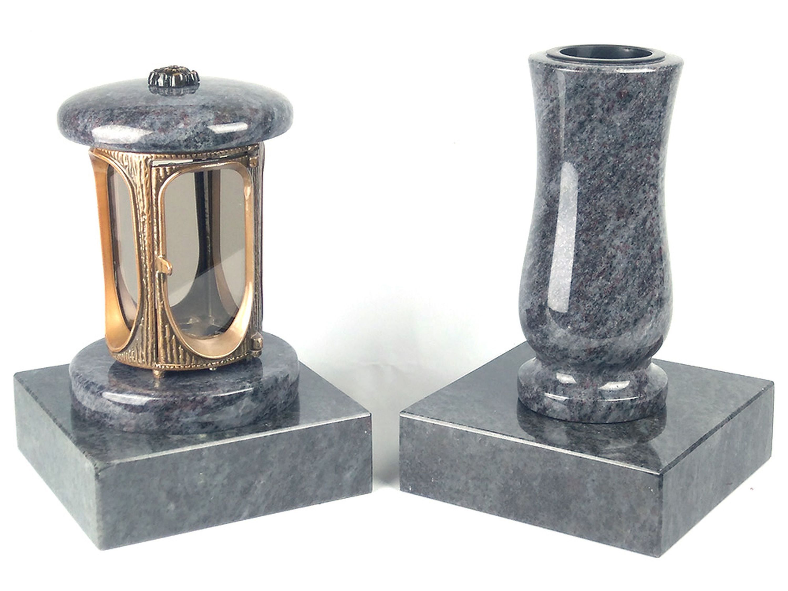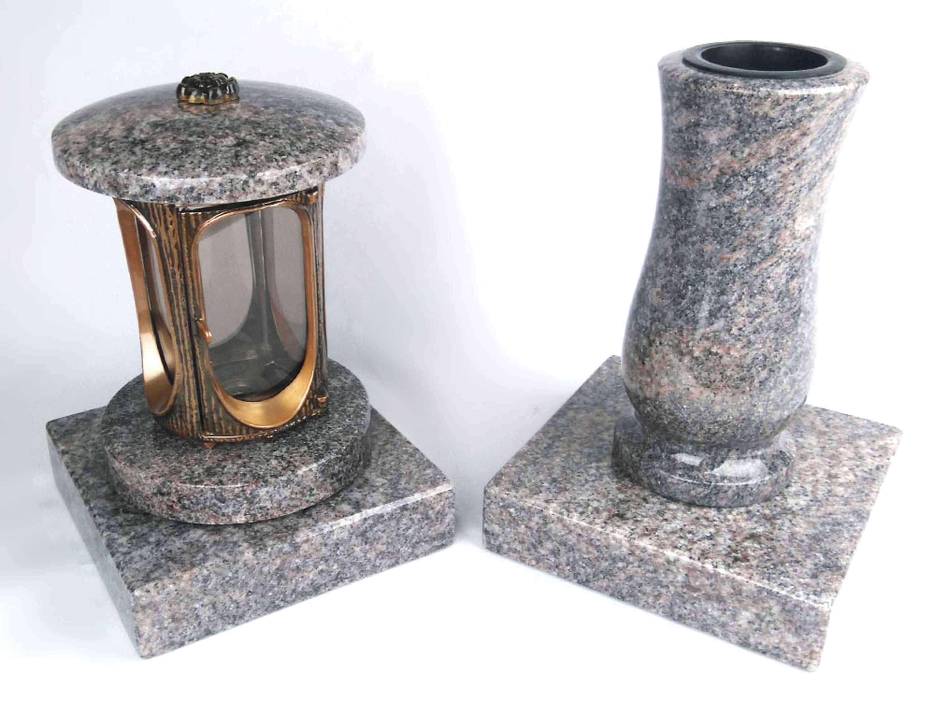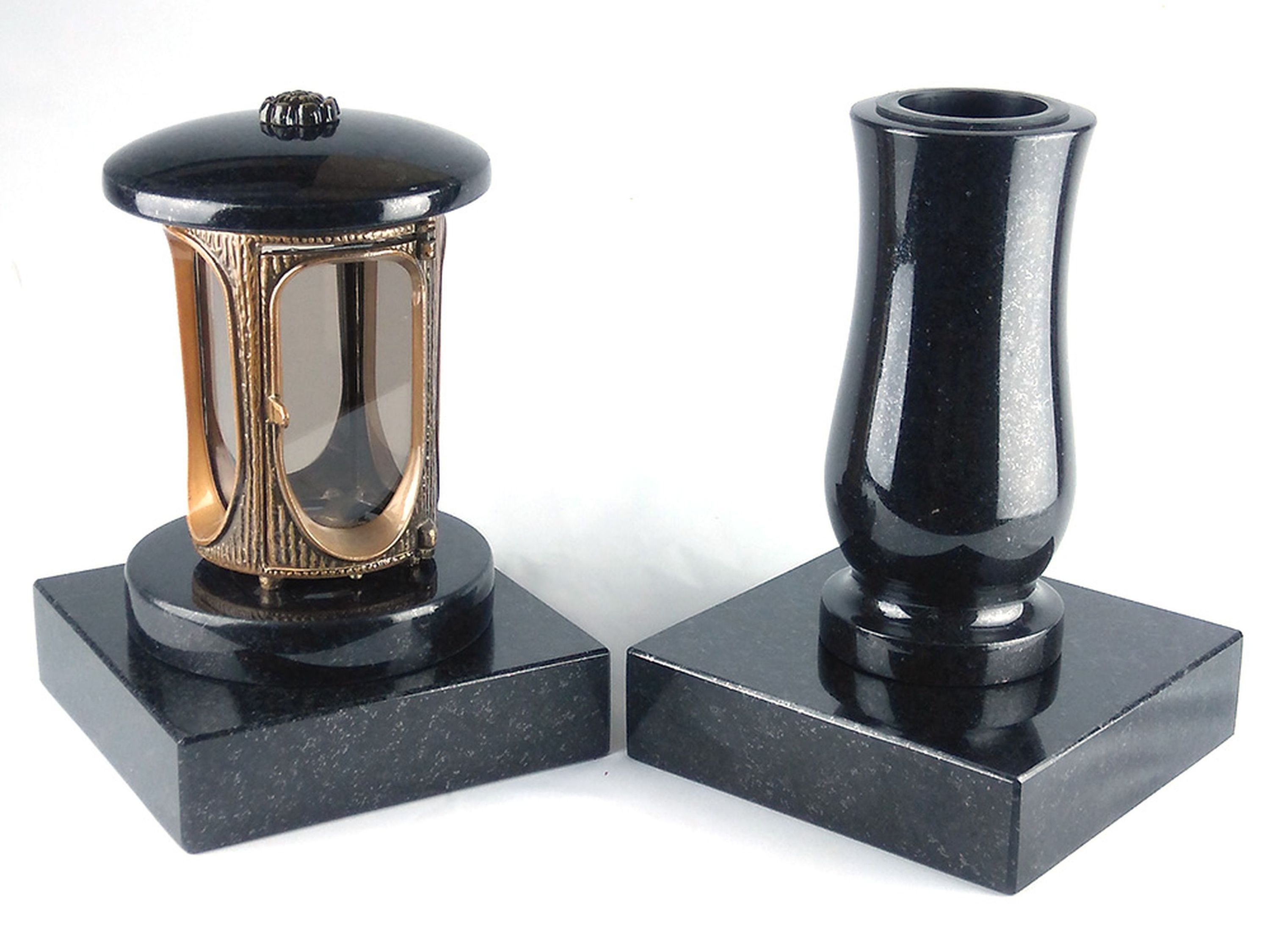 Dieses vierteilige Set in verschiedenen Granitfarben verbindet die runde Grablampe aus Messing, mit Rosette mit ornamentierten Fensterrahmen und großen Glaseinsätzen, mit der Vase „Taille-Small“ aus Granit. Lampe und Vase stehen auf nicht vorgebohrten Sockeln aus Granit, die die Montage erleichtern.