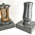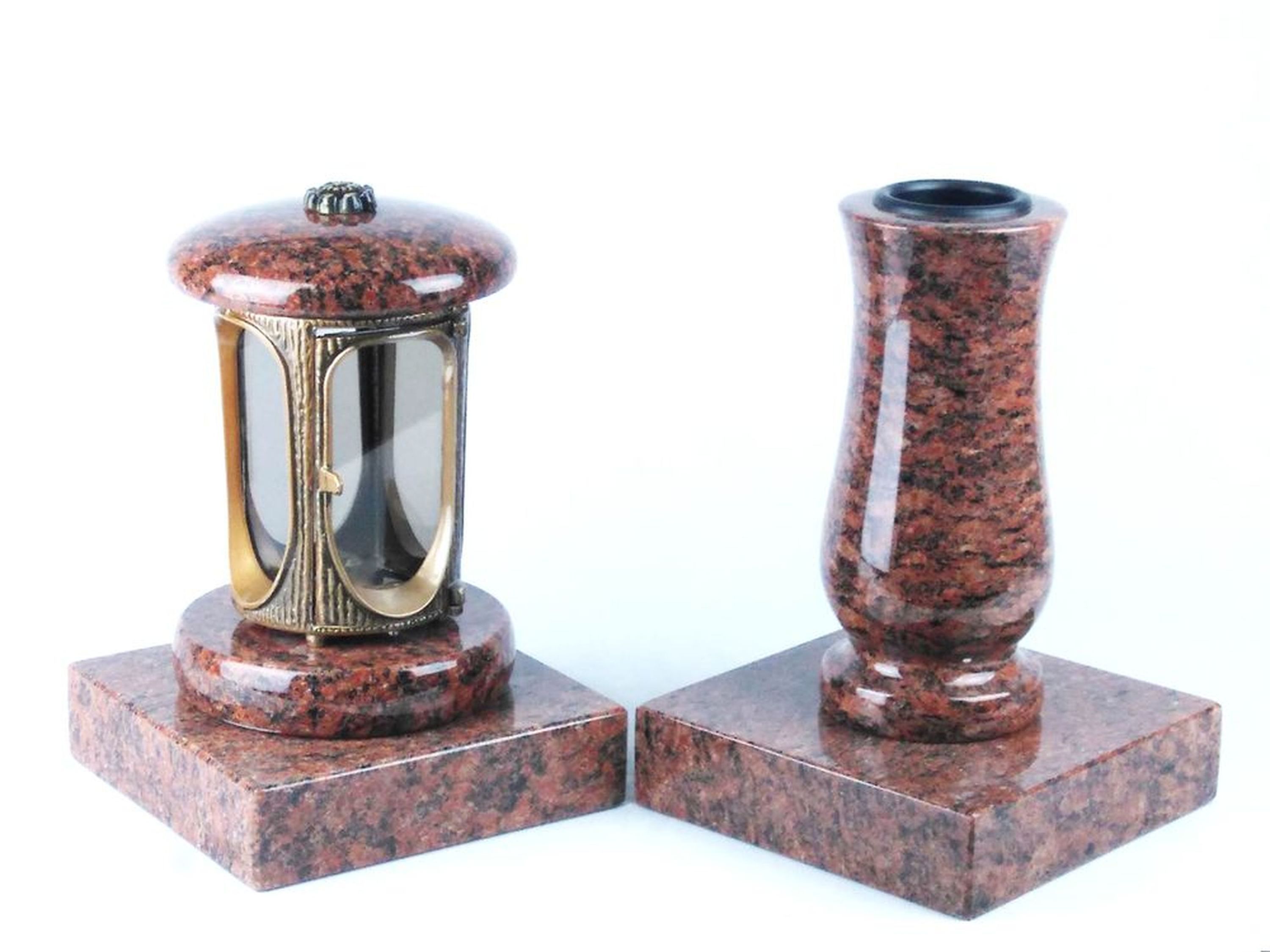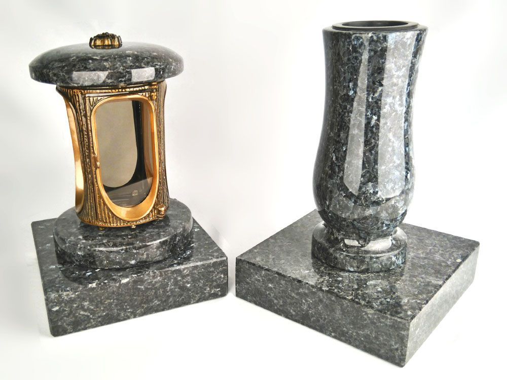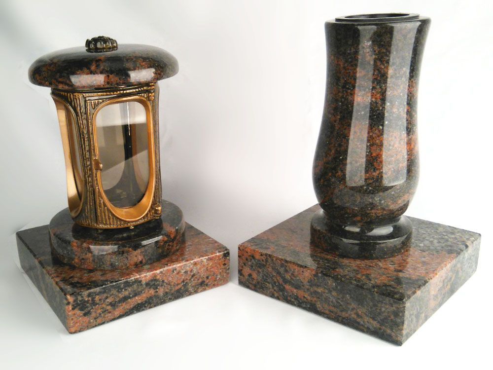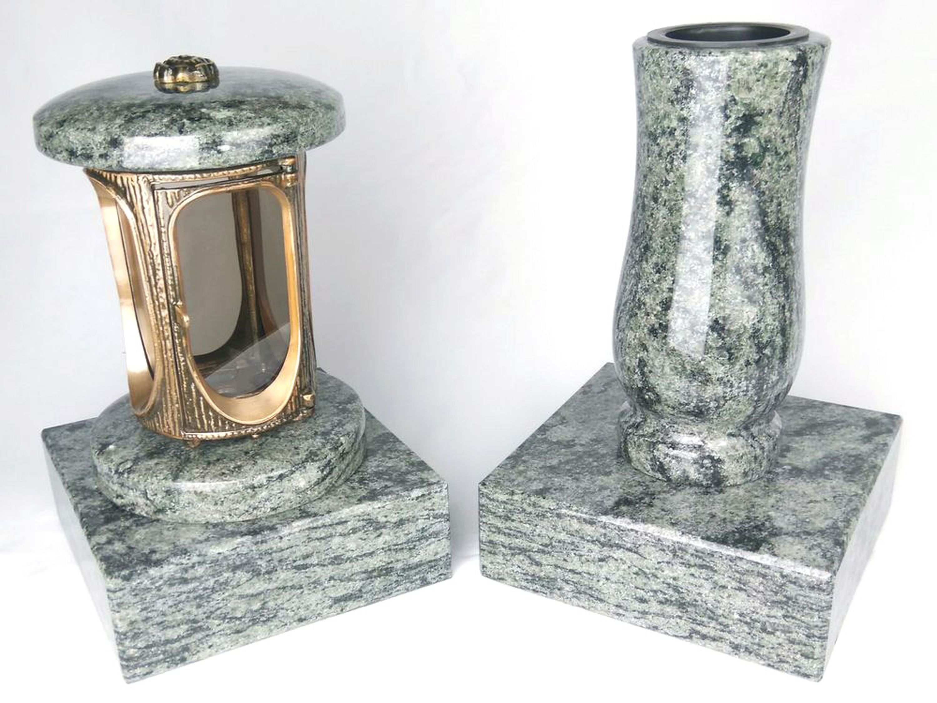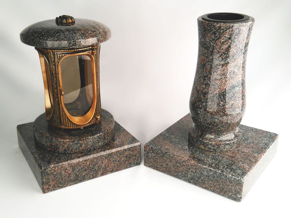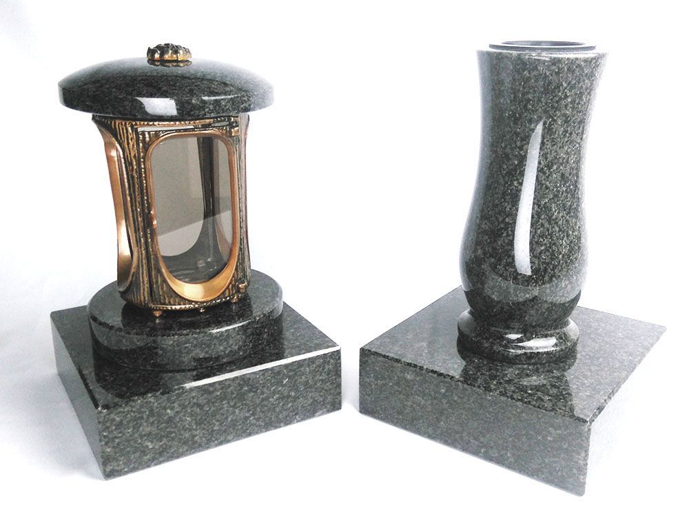 Dieses vierteilige Set in verschiedenen Granitfarben verbindet die runde Grablampe aus Messing, mit Rosette mit ornamentierten Fensterrahmen und großen Glaseinsätzen, mit der Vase „Taille-Small“ aus Granit. Lampe und Vase stehen auf nicht vorgebohrten Sockeln aus Granit, die die Montage erleichtern.