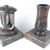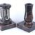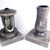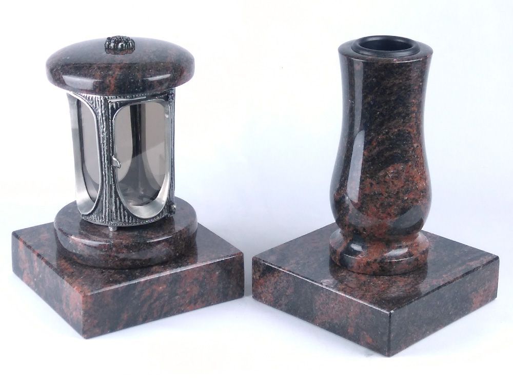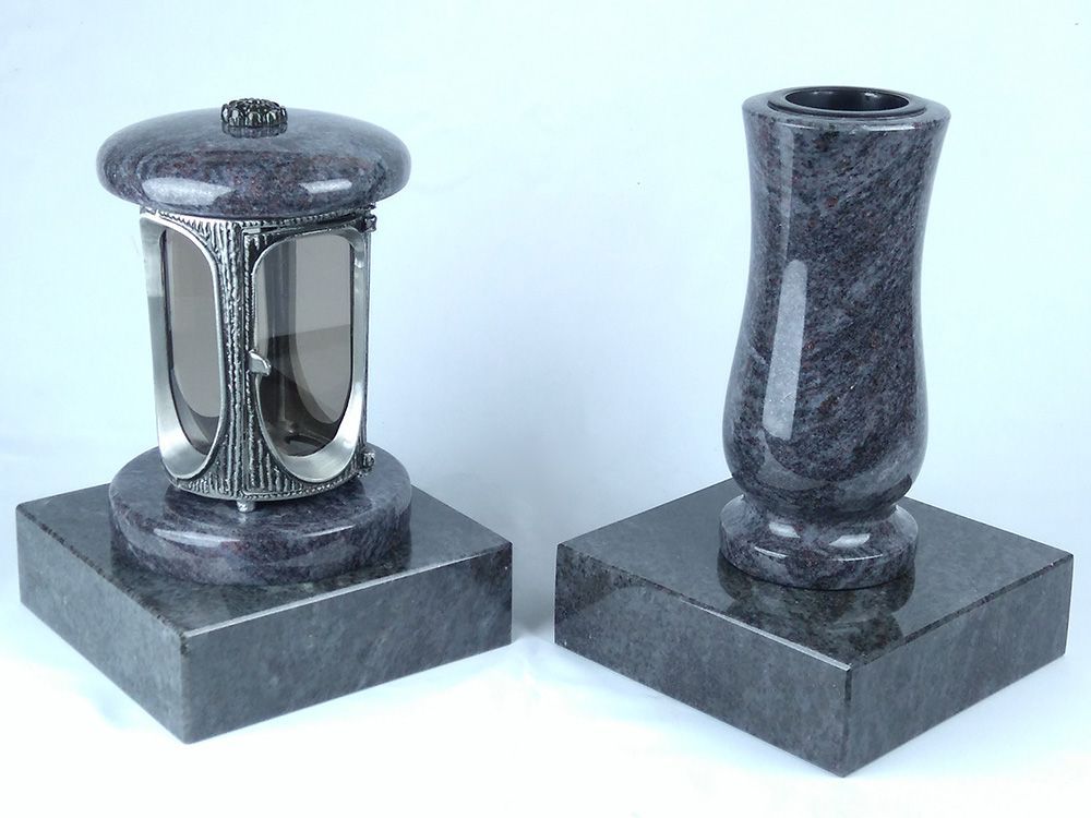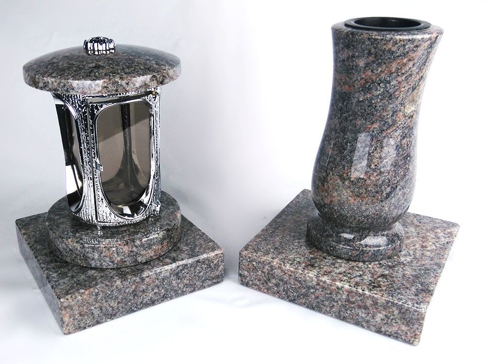 Dieses vierteilige Set in verschiedenen Granitfarben verbindet die runde Grablampe aus Aluminium, mit Rosette mit ornamentierten Fensterrahmen und großen Glaseinsätzen, mit der Vase „Taille-Small“ aus Granit. Lampe und Vase stehen auf handgefertigten Sockeln aus Granit, die die Montage erleichtern.