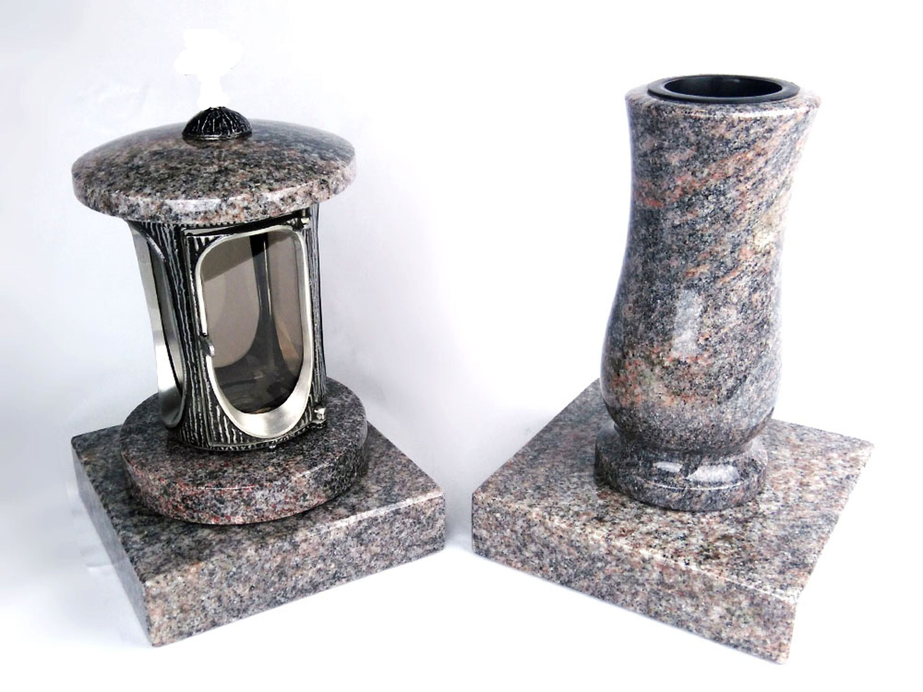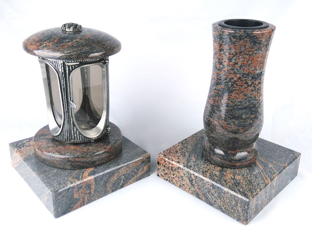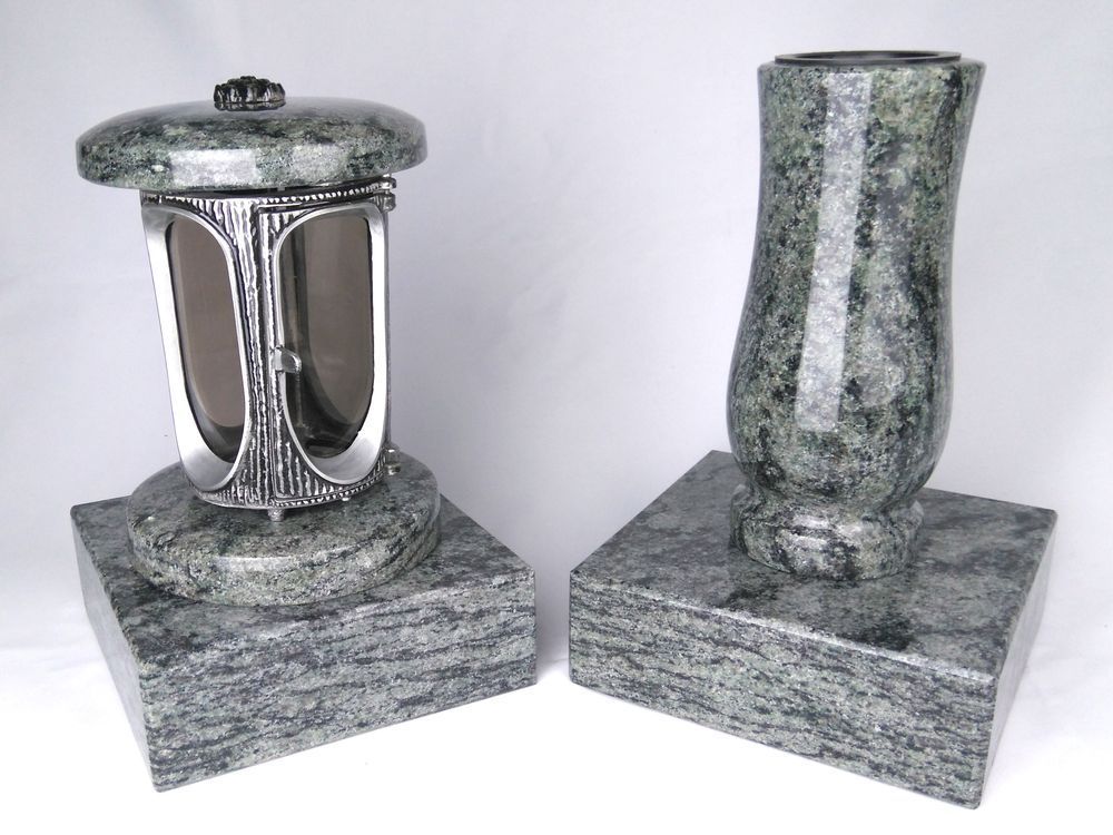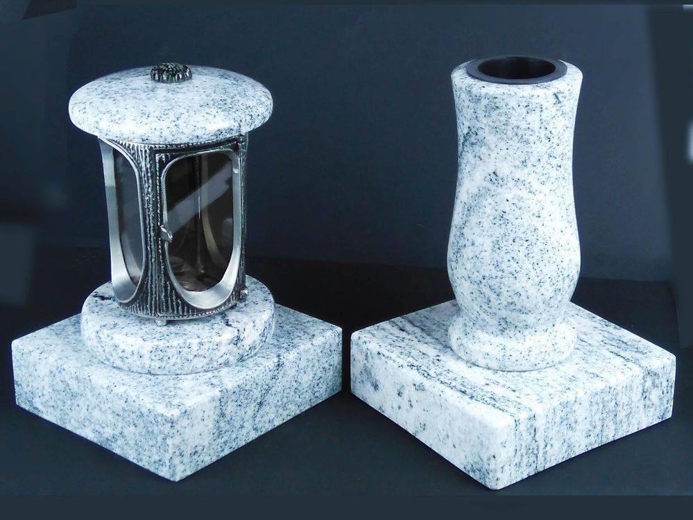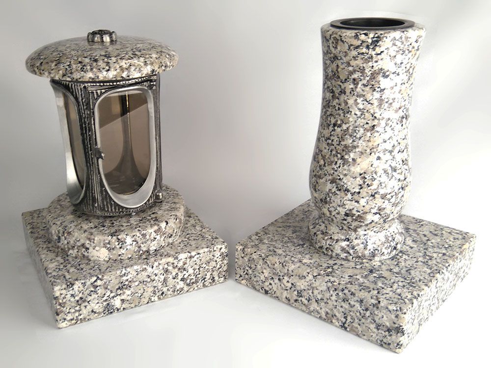 designgrab Runde Grablampe mit Rosette & Vase aus Granit im Set mit 2 Sockeln – handg