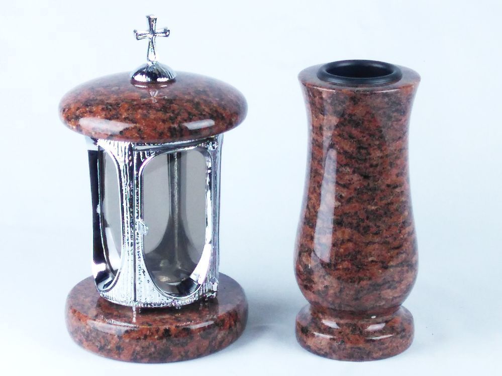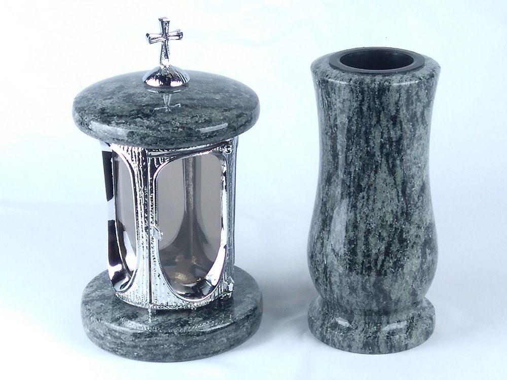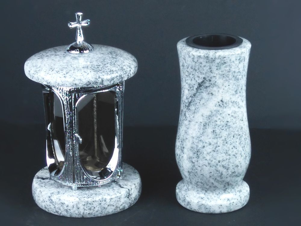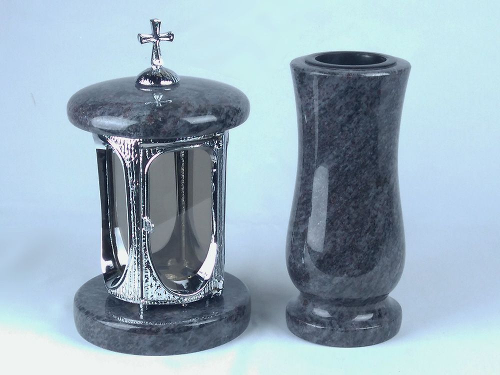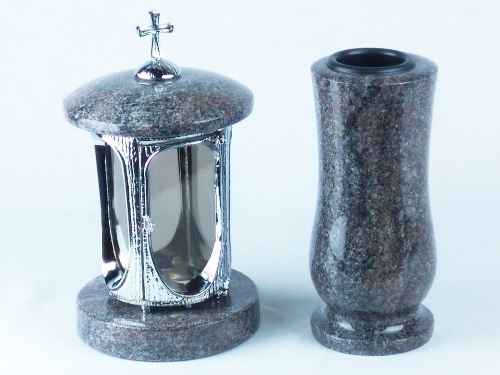 Dieses Set in verschiedenen Granitfarben kombiniert die runde Grablampe aus Chrom, mit Kreuz mit ornamentierten Fensterrahmen und großen Glaseinsätzen, und die Vase „Taille-Small“ aus Granit. Die Vase verfügt über einen herausnehmbaren Kunststoffeinsatz, der im Winter entfernt wird, damit Wasser abf