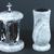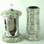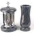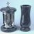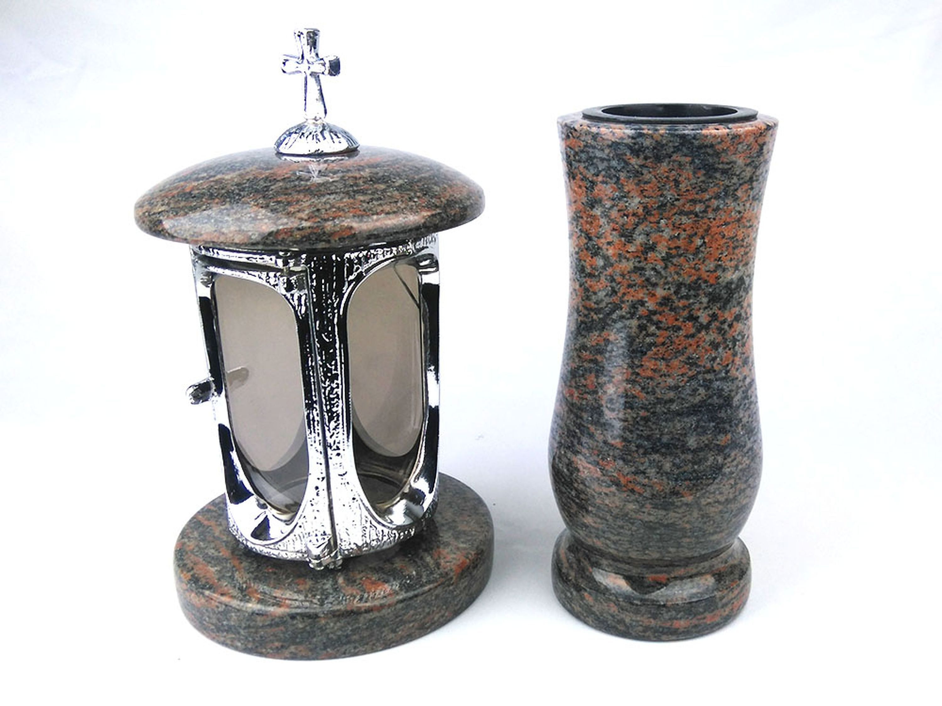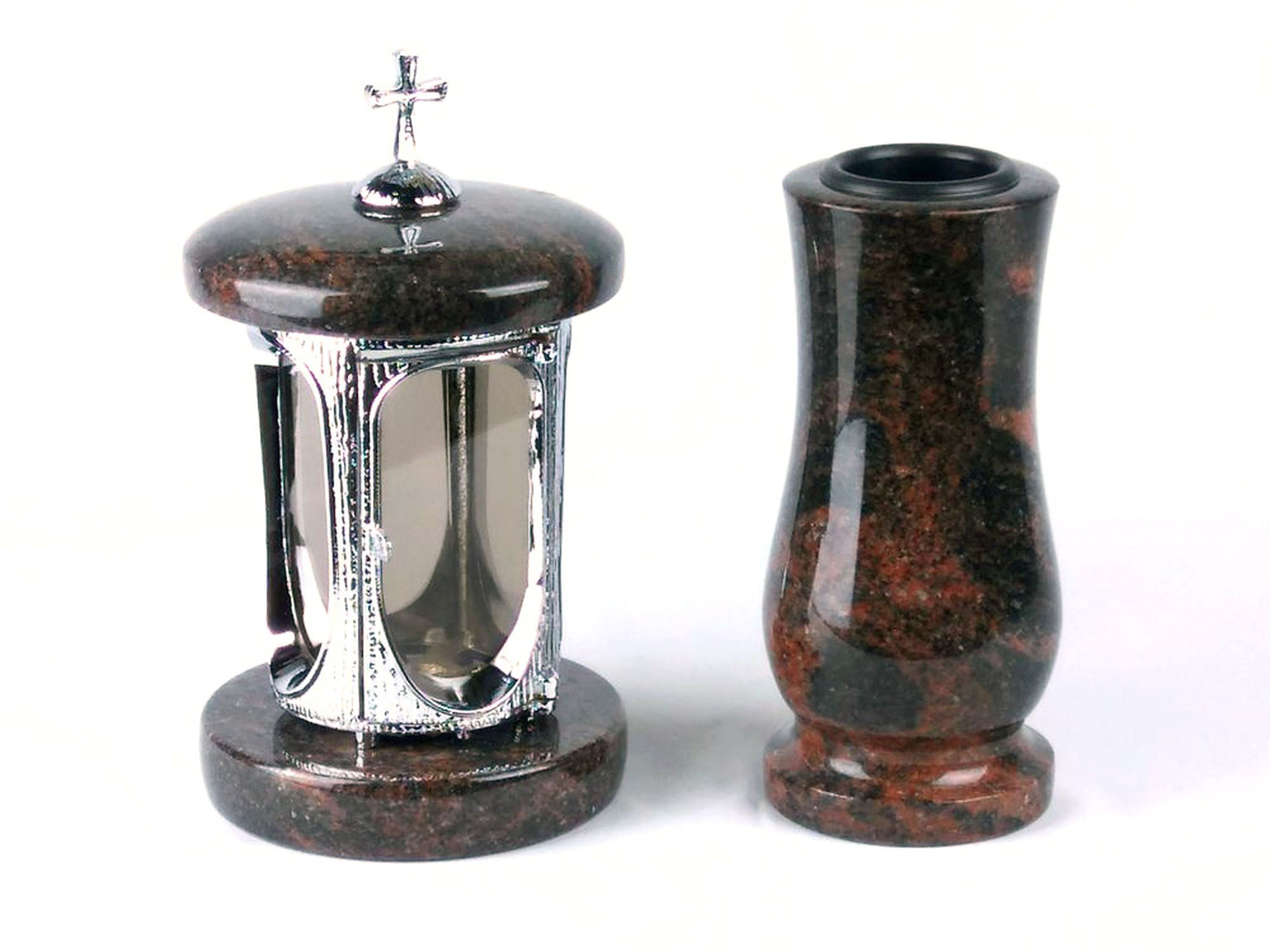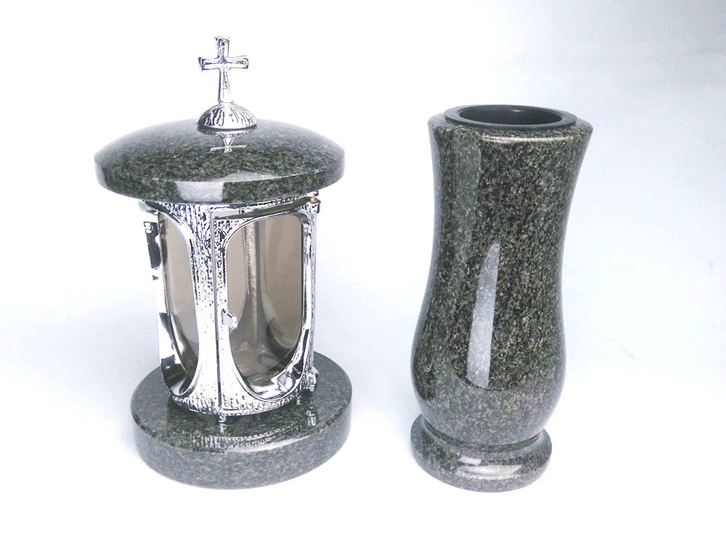 Dieses Set in verschiedenen Granitfarben kombiniert die runde Grablampe aus Chrom, mit Kreuz mit ornamentierten Fensterrahmen und großen Glaseinsätzen, und die Vase „Taille-Small“ aus Granit. Die Vase verfügt über einen herausnehmbaren Kunststoffeinsatz, der im Winter entfernt wird, damit Wasser abf