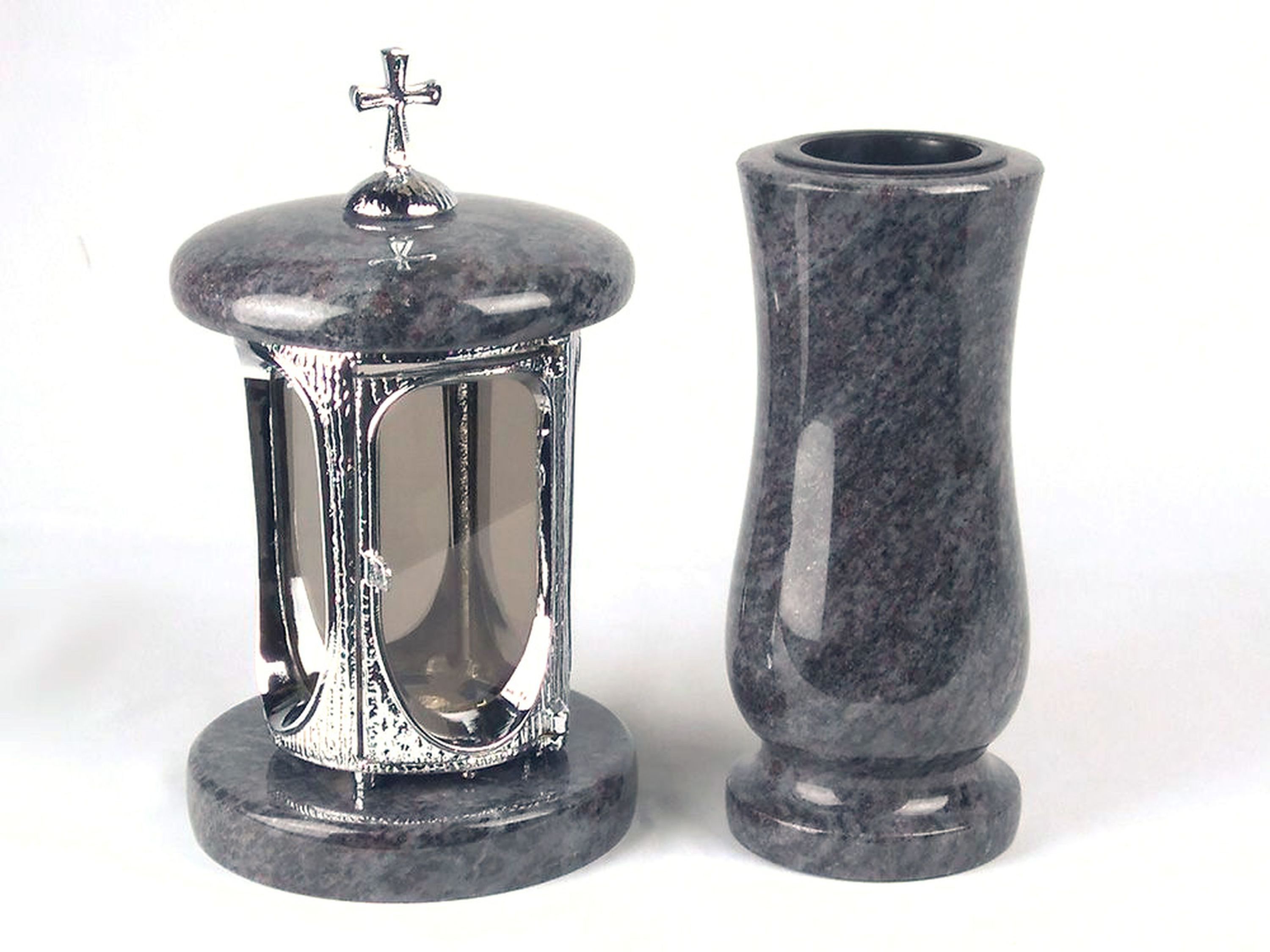 designgrab Runde Grablampe (verchromt) mit Kreuz & passender Granitvase – stilvolles