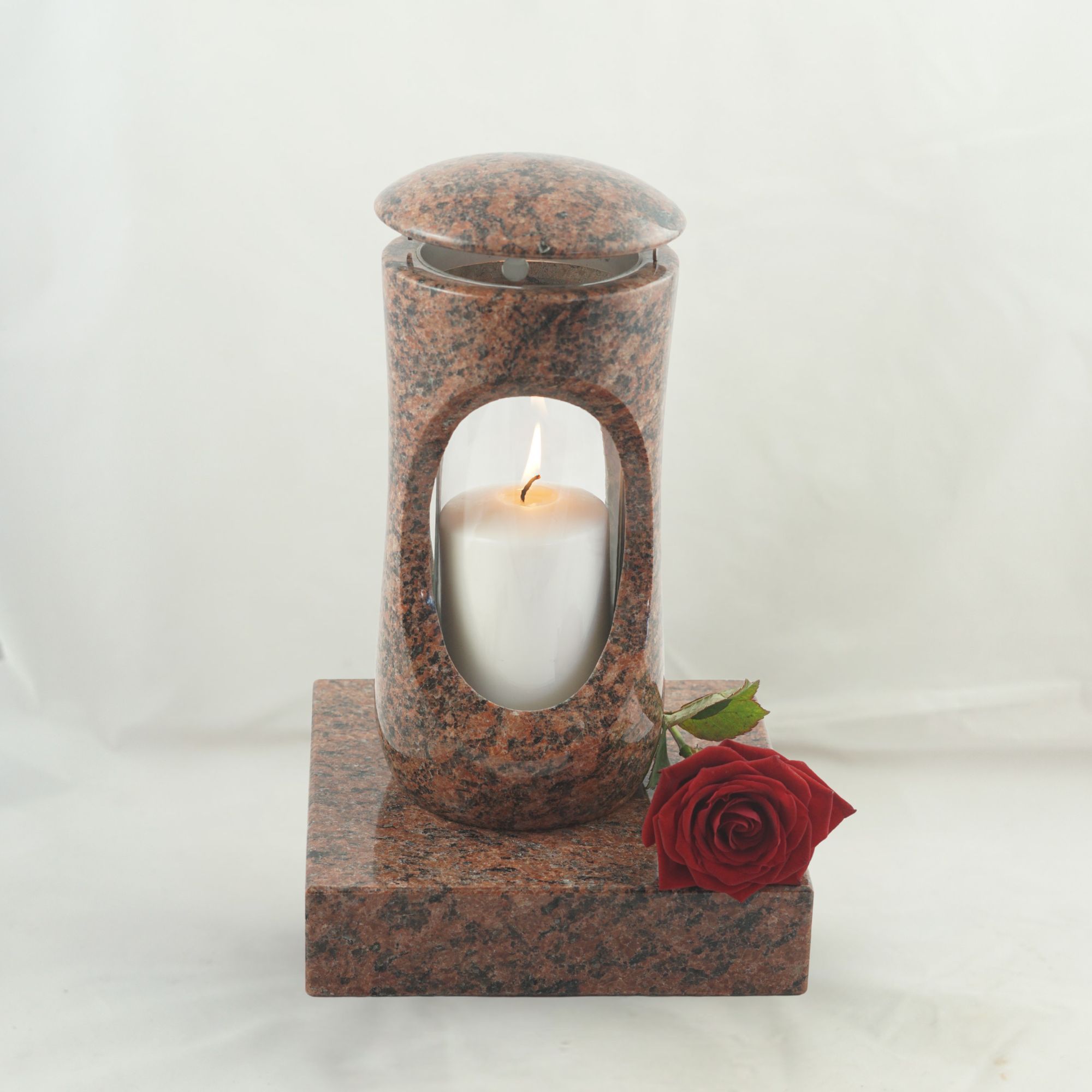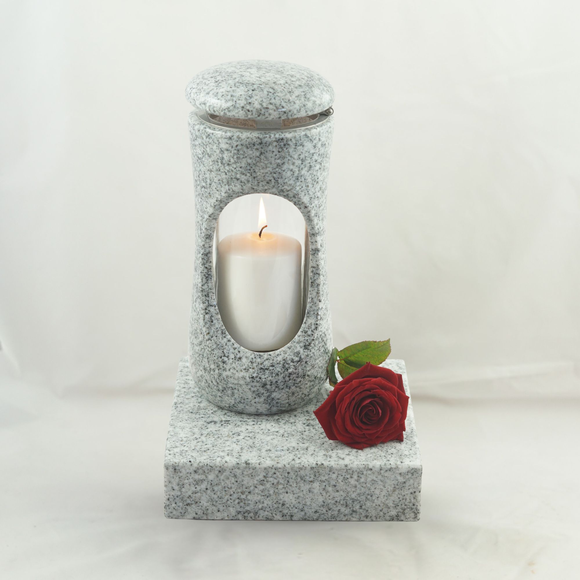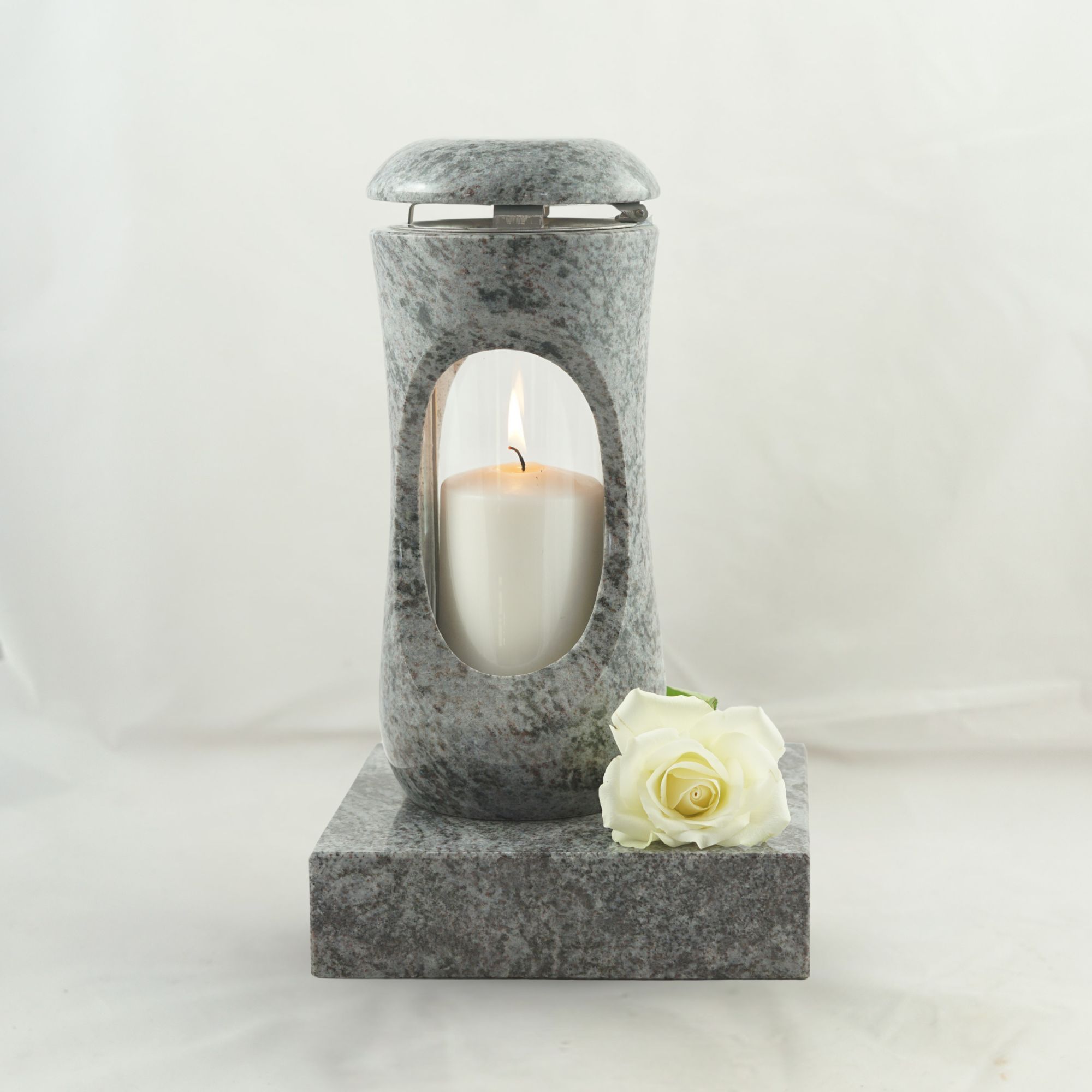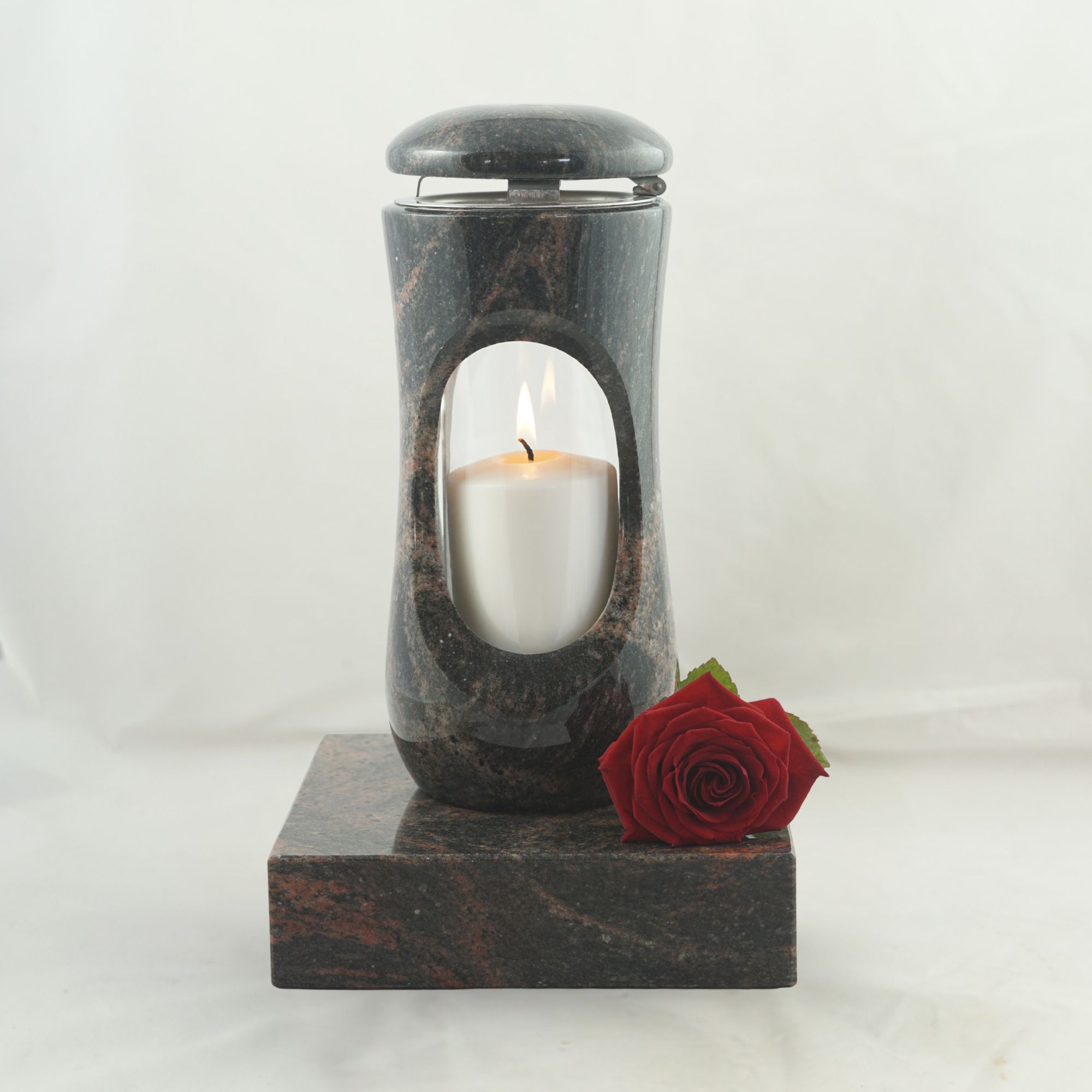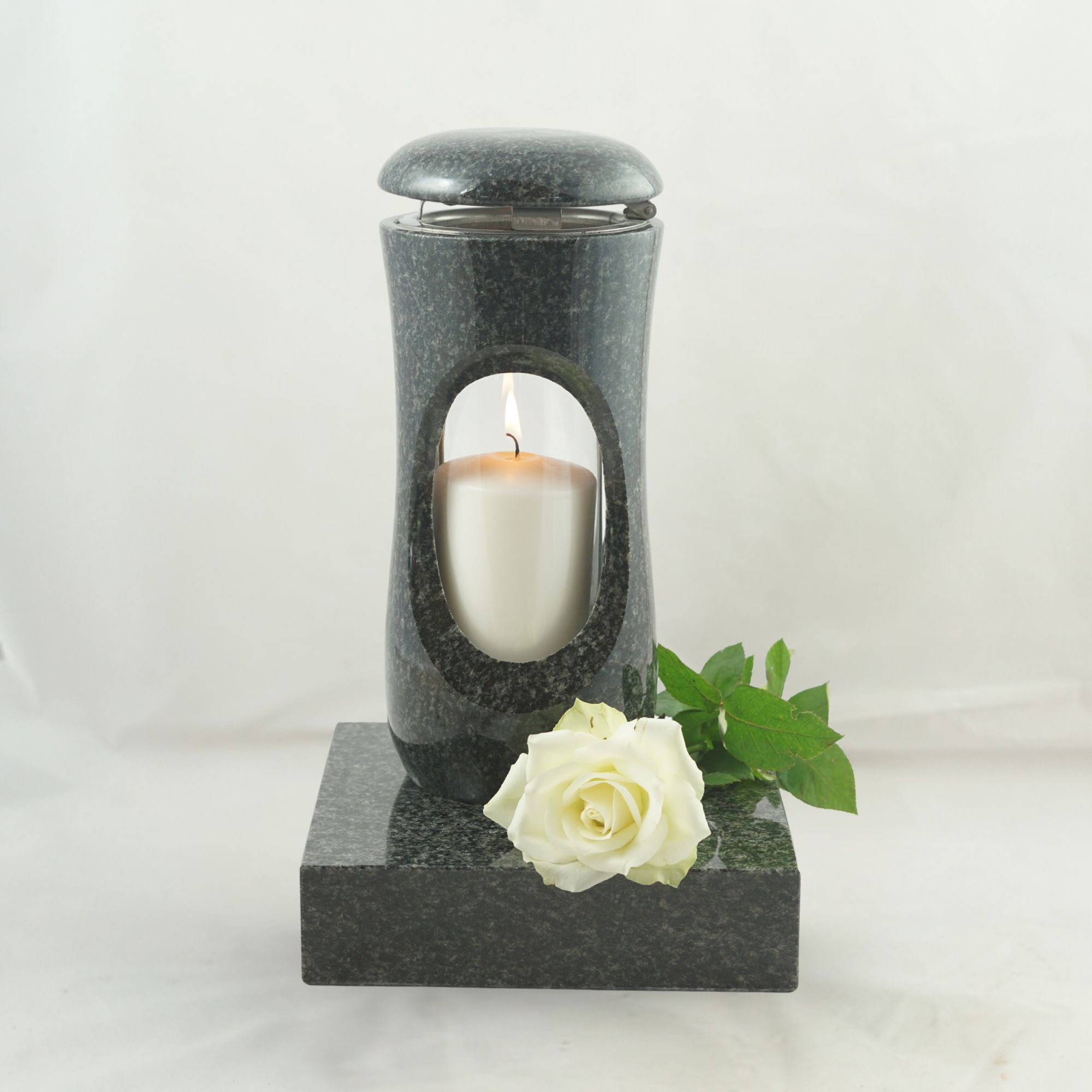 Dieses vierteilige Set in verschiedenen Granitfarben verbindet die kompakte Grablampe „Design-Small“ mit bauchigem Korpus und großzügiger Glasöffnung mit der Vase „Taille-Small“. Lampe und Vase stehen auf separaten Sockeln aus Granit, die nicht vorgebohrt sind. Wir empfehlen die Montage mittels Kleb