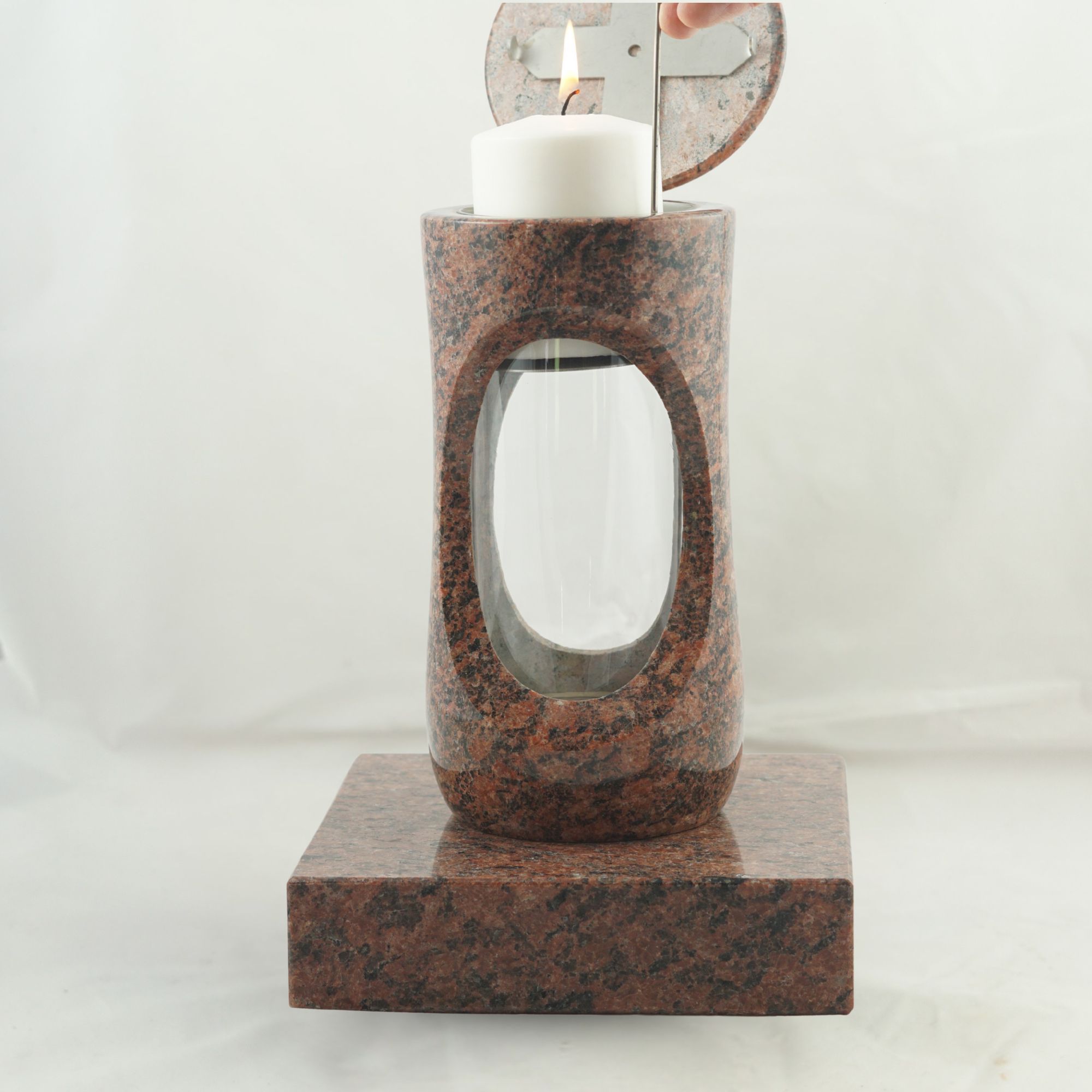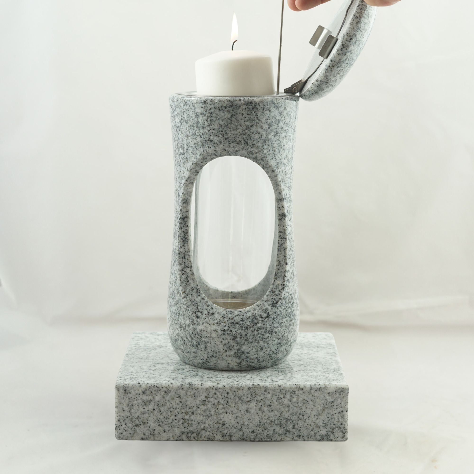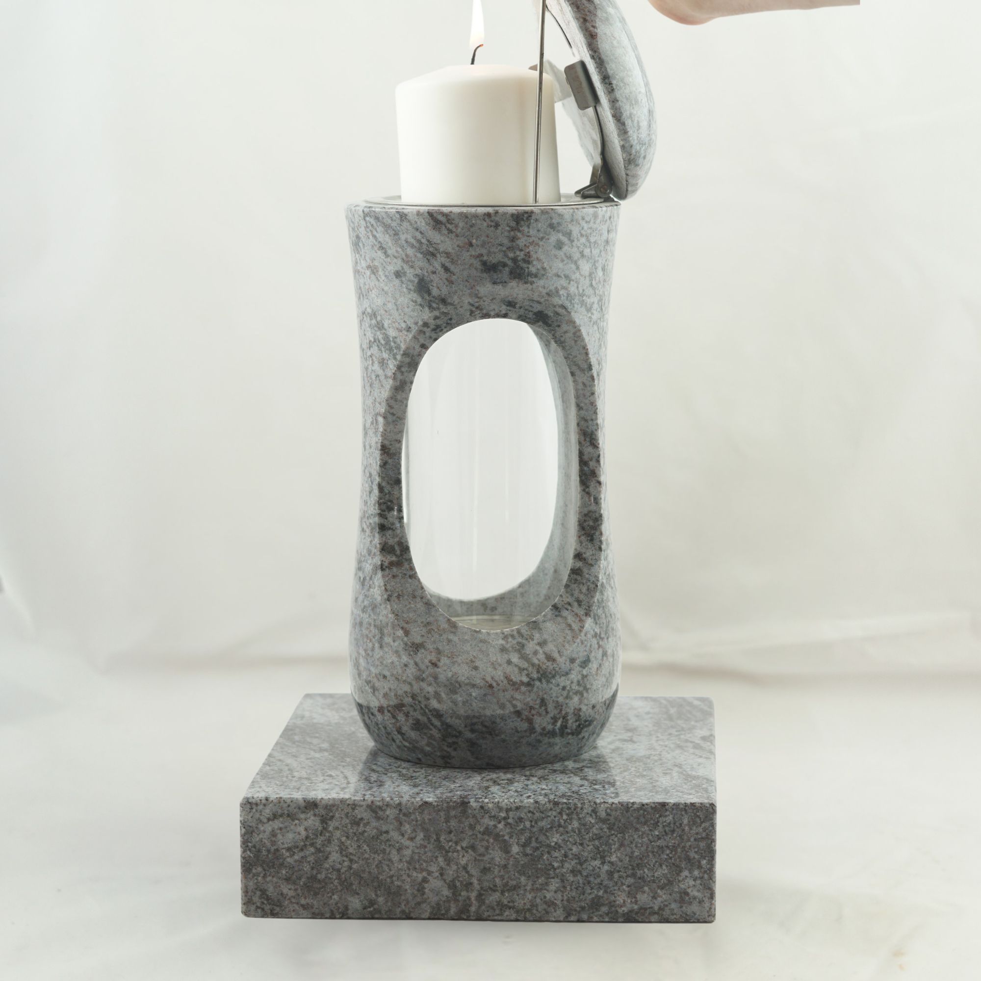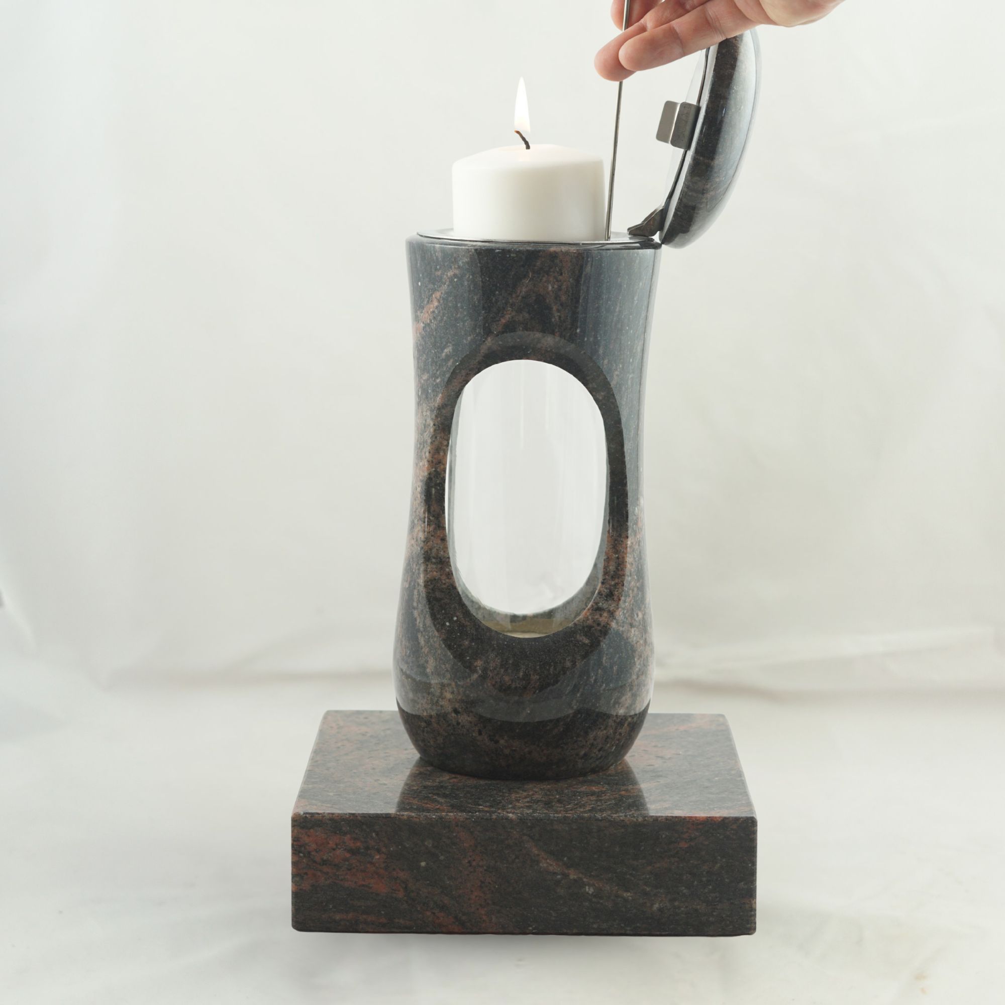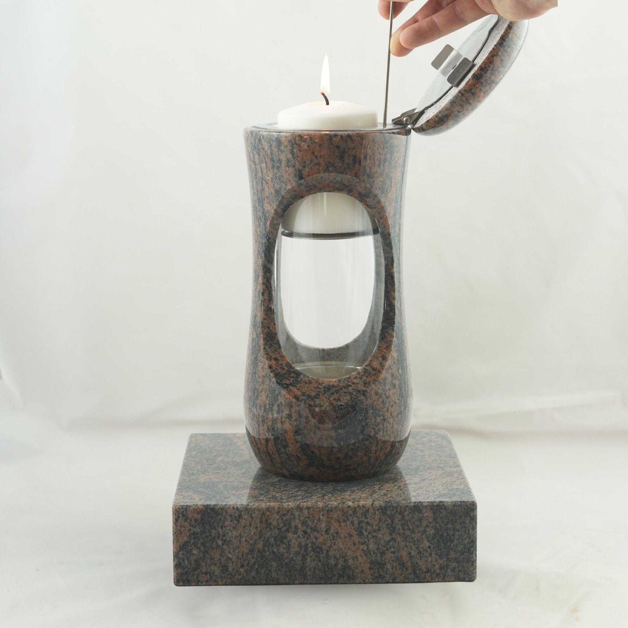 Dieses vierteilige Set in verschiedenen Granitfarben verbindet die kompakte Grablampe „Design-Small“ mit bauchigem Korpus und großzügiger Glasöffnung mit der Vase „Taille-Small“. Lampe und Vase stehen auf separaten Sockeln aus Granit, die nicht vorgebohrt sind. Wir empfehlen die Montage mittels Kleb