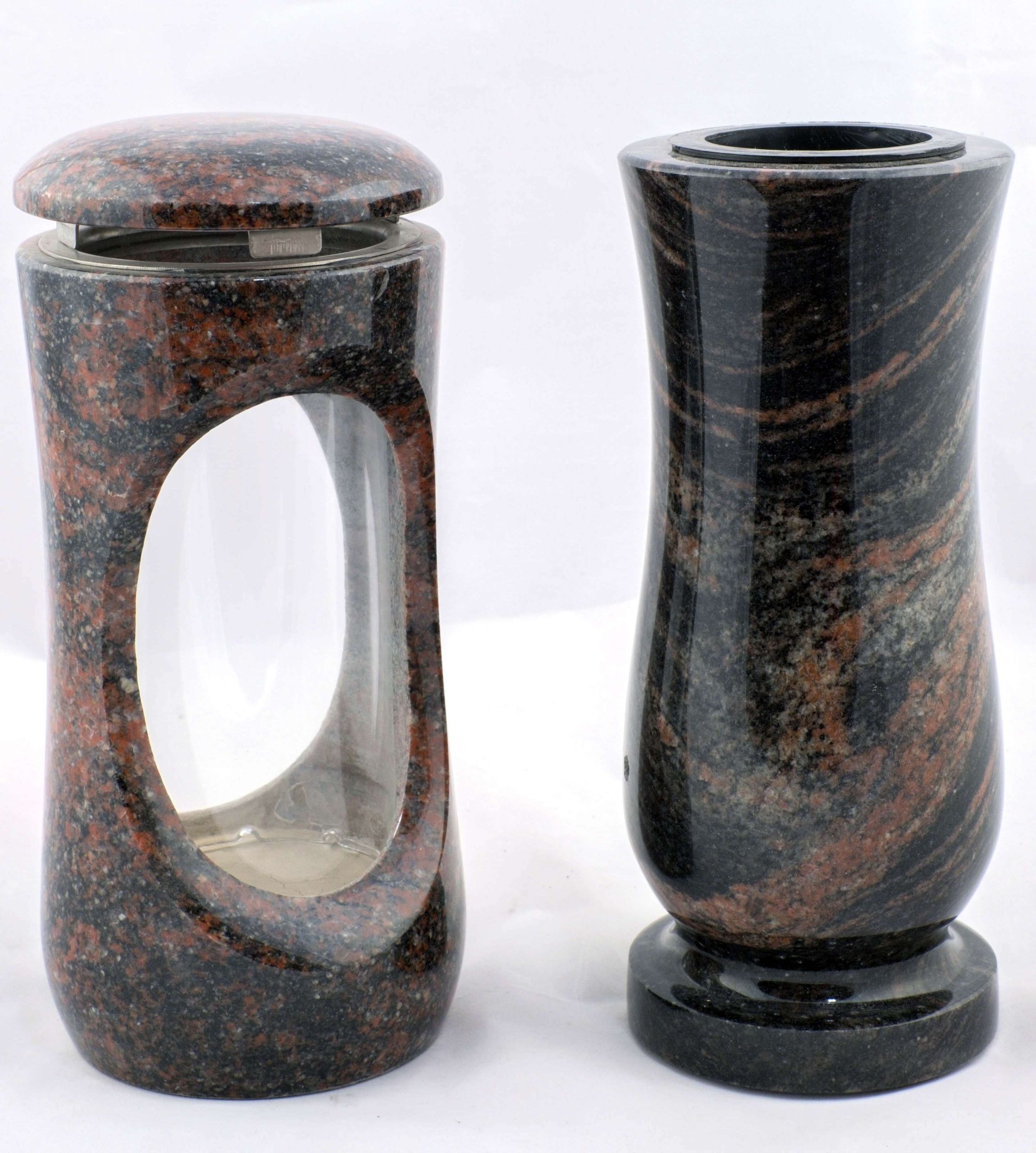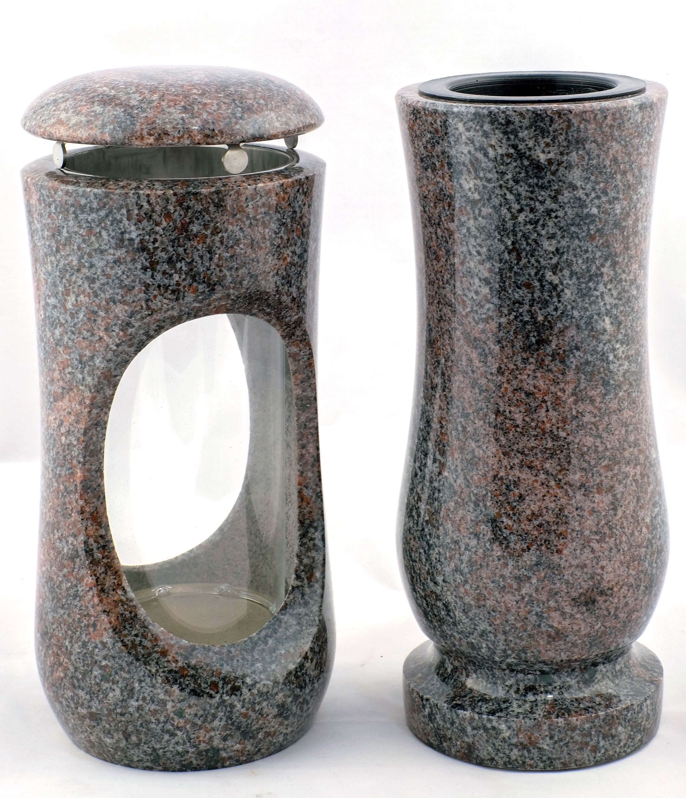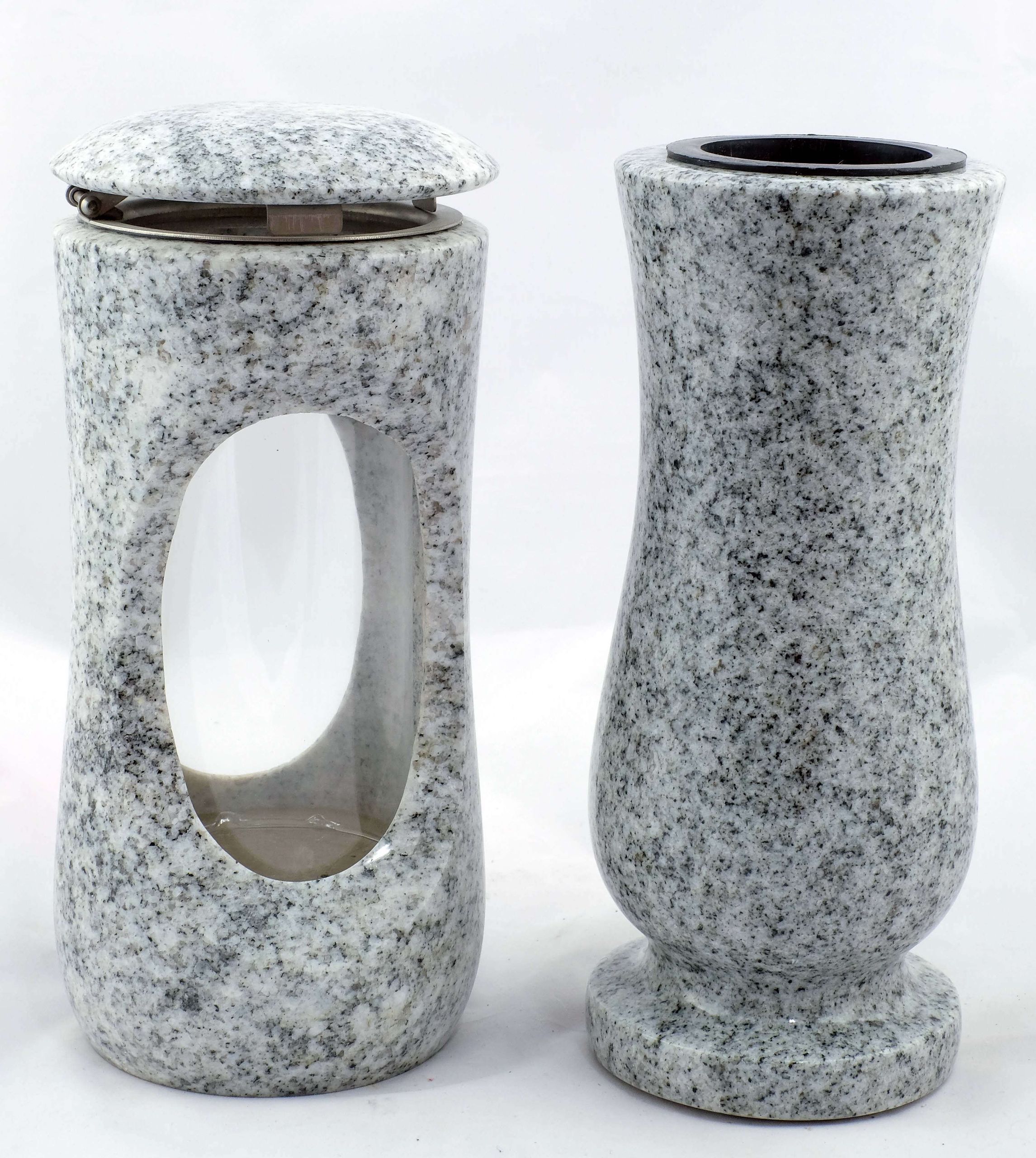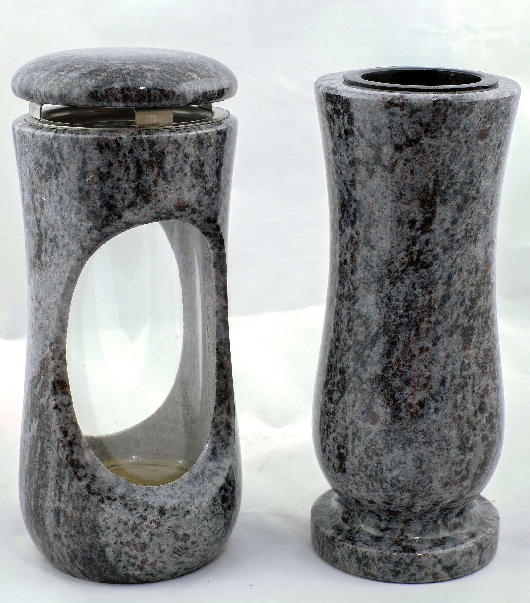 Dieses Set in verschiedenen Granitfarben kombiniert die kompakte Grablampe „Design-Small“ mit bauchigem Korpus und großzügiger Glasöffnung mit der Vase „Taille-Small“. Die Vase verfügt über einen herausnehmbaren Kunststoffeinsatz; im Winter wird der Einsatz entfernt, damit Wasser abfließen kann und