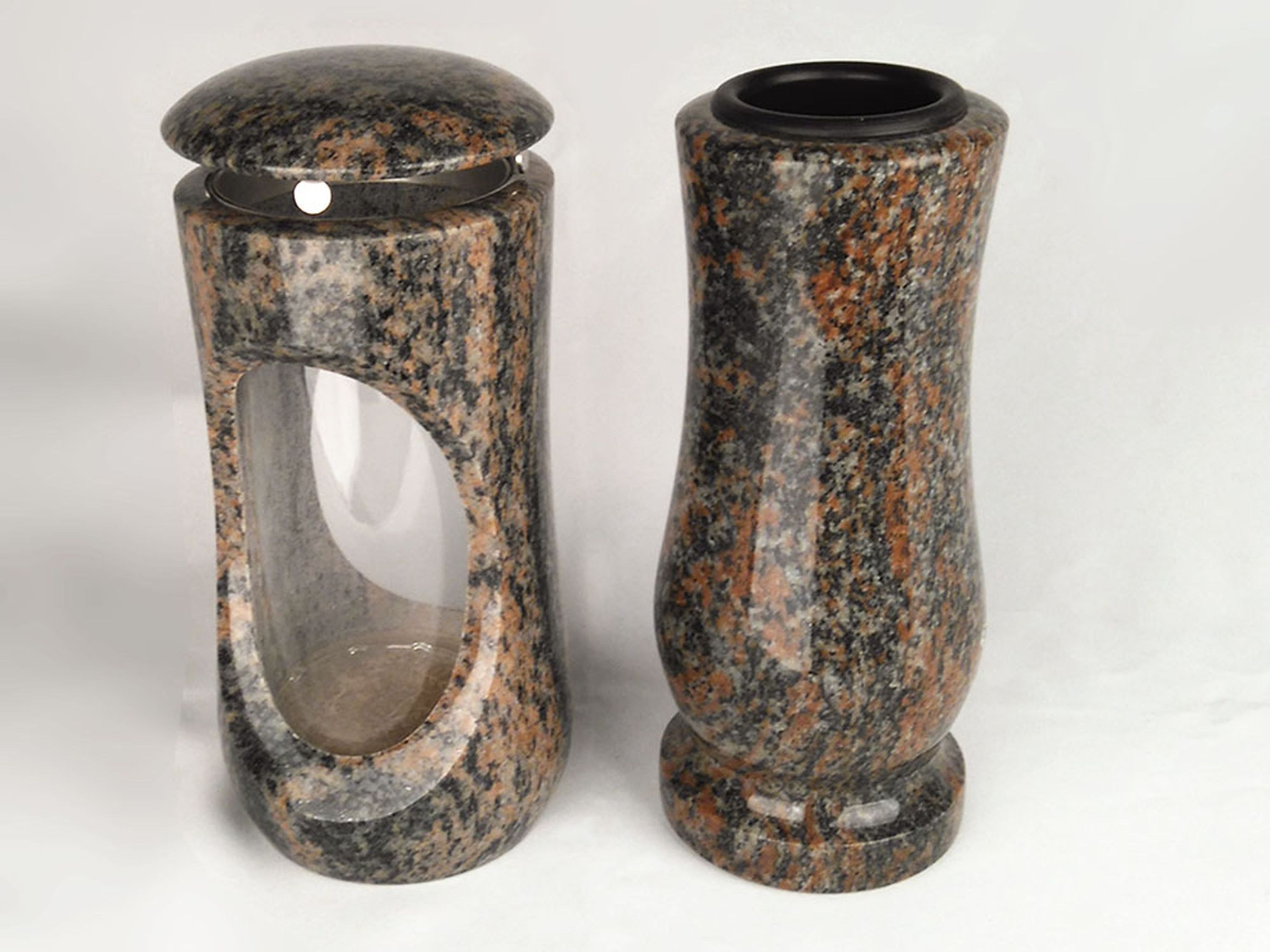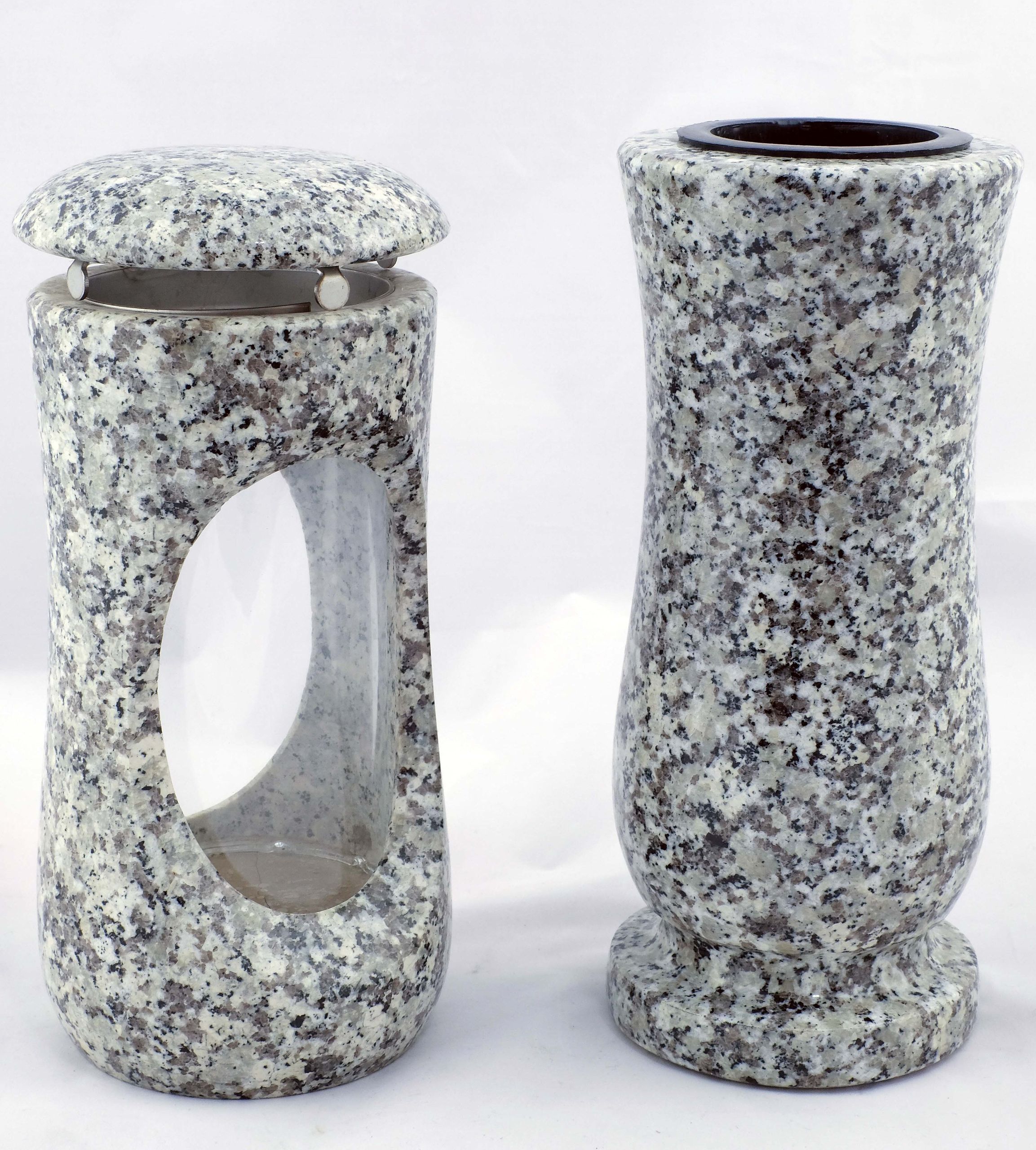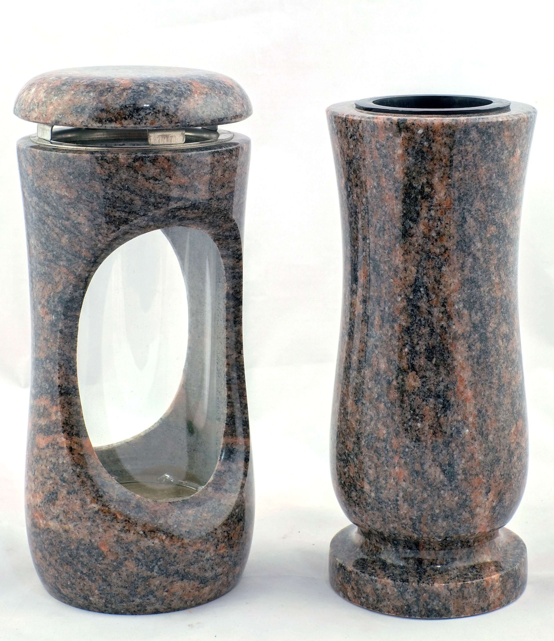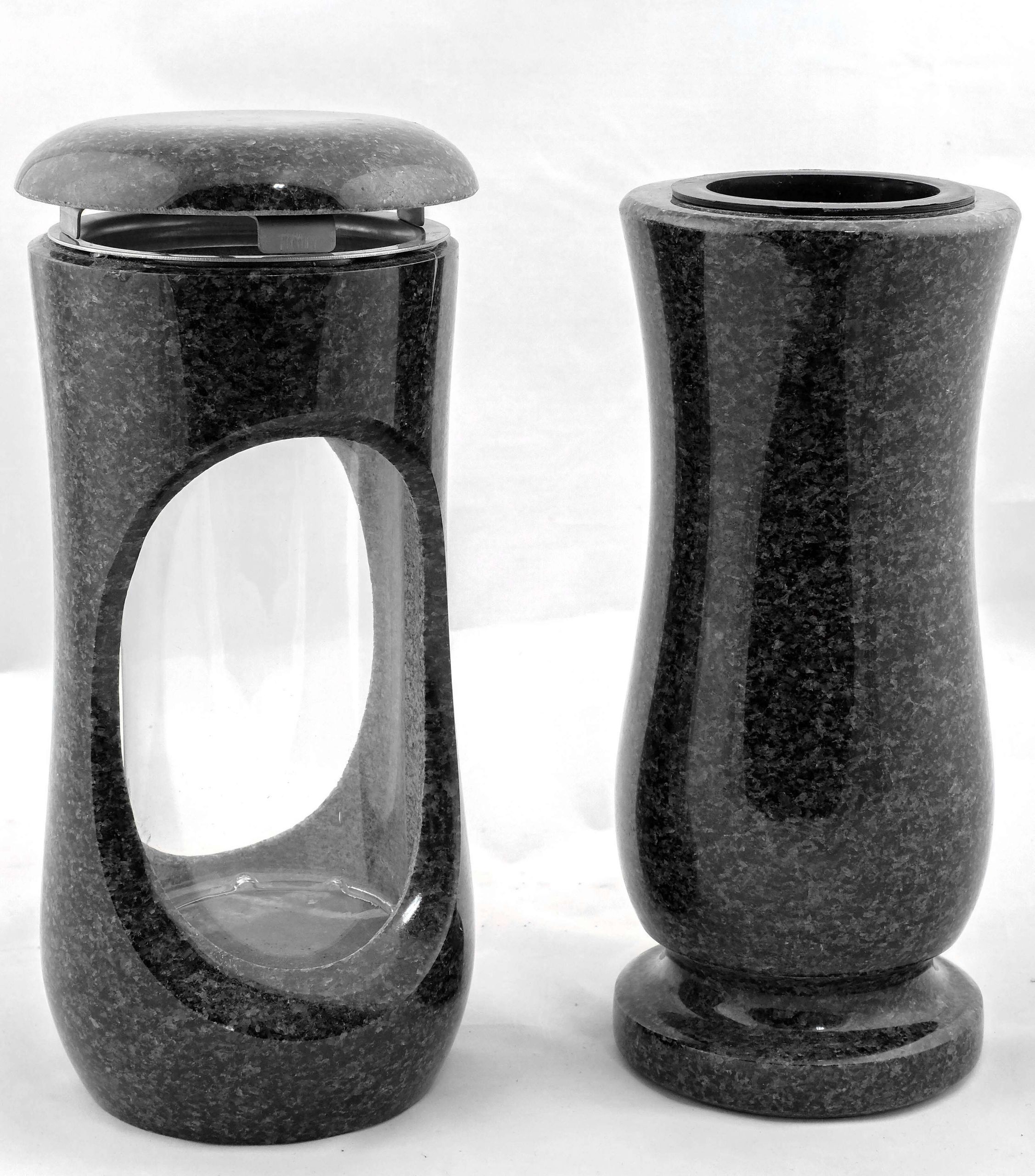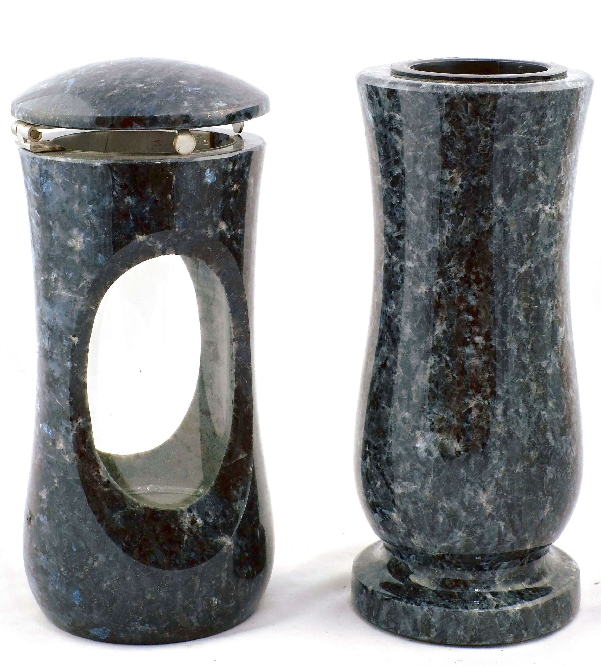 Dieses Set in verschiedenen Granitfarben kombiniert die kompakte Grablampe „Design-Small“ mit bauchigem Korpus und großzügiger Glasöffnung mit der Vase „Taille-Small“. Die Vase verfügt über einen herausnehmbaren Kunststoffeinsatz; im Winter wird der Einsatz entfernt, damit Wasser abfließen kann und
