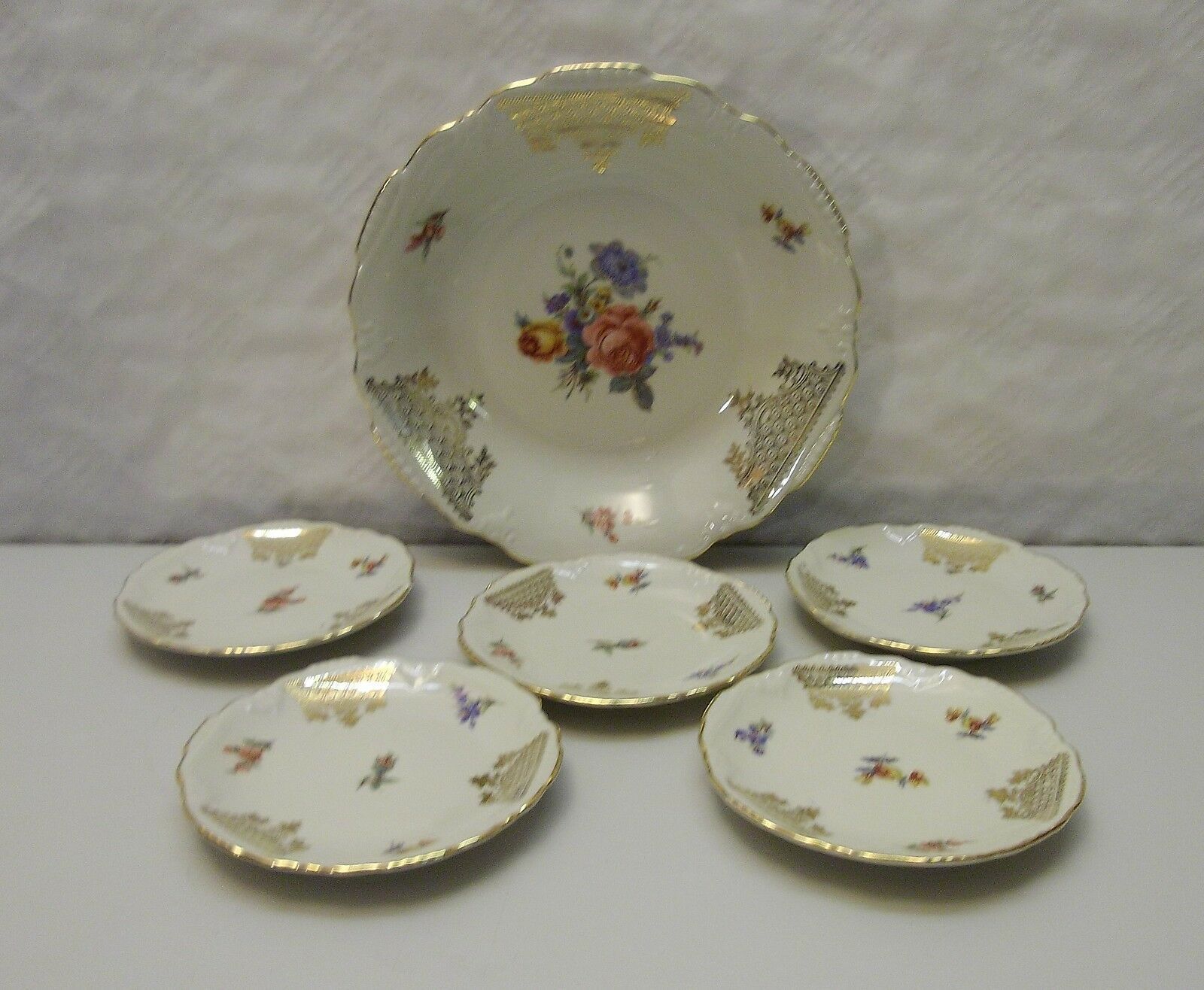 Dessert-Tellerset um 1930. Für fünf Personen. Marke: (siehe Foto). 1 grroßer und 5 kleine Teller. Maße: Durchmesser 20 bzw. 11 cm. Antikes am Deich - Inh: Oliver Kipp-Trense G M T Sprache erkennen Afrikaans Albanisch Arabisch Armenisch Aserbaidschanisch Baskisch Bengalisch Bosnisch Bulgarisch Burmes