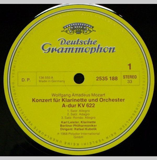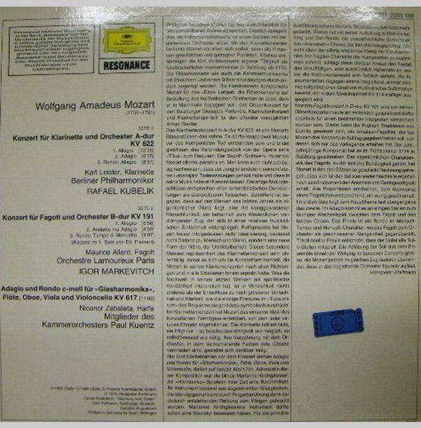 Condition Vinyl Very Good Plus (VG+) Condition Sleeve Very Good Plus (VG+) Tracks included: Konzert für Klarinette und Orchester A-dur KV 622 Karl Leister Berliner Philharmoniker Rafael Kubelik I 1 . > Allegro 2. > Adagio 3. > Rondo. Allegro Konzert für Fagott und Orchester B-dur KV 191 Mau