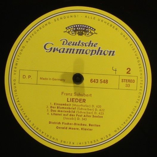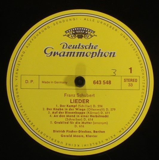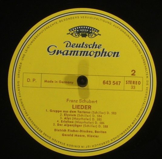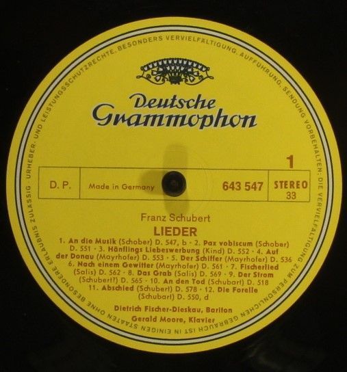 Condition Vinyl Near Mint (NM or M-) Condition Sleeve Very Good (VG) Tracks included: Die Lieder von 1817 bis 1828 I 1. An Die Musik D.547,b 2. Pax Vobiscum D.551 3. Hänflings Liebeswerbung D.552 4. Auf Der Donau D.553 5. Der Schiffer D.536 6. Nach Einem Gewitter D.561 7. Fischerlied D.562 8. Das Gr