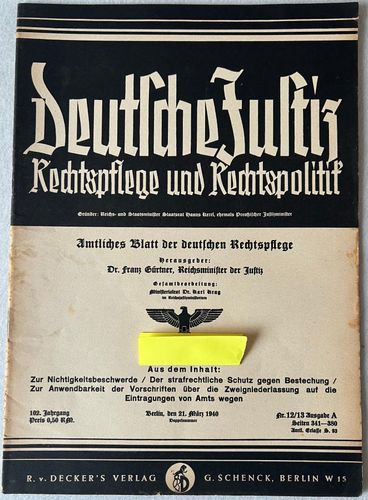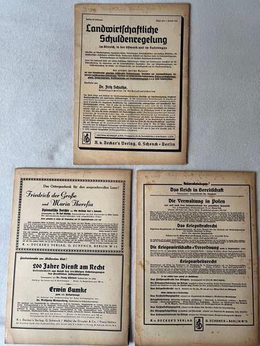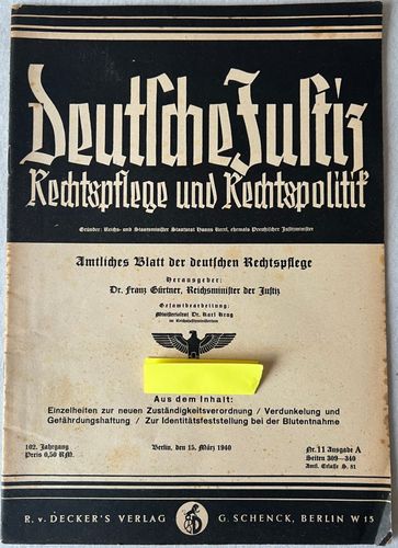Aus dem Nachlass meines Großvaters, biete ich hier folgende 3 Hefte an. Amtliches Blatt der Deutschen Rechtspflege Herausgeber: Dr. Franz Gürtner, Reichsminister der Justiz Gesamtbearbeitung: Ministerialrat Dr. Karl Krug im Reichsjustizministerium Verlag: R. v. Decker’s Berlin Lieferumfang: Heft Nr.