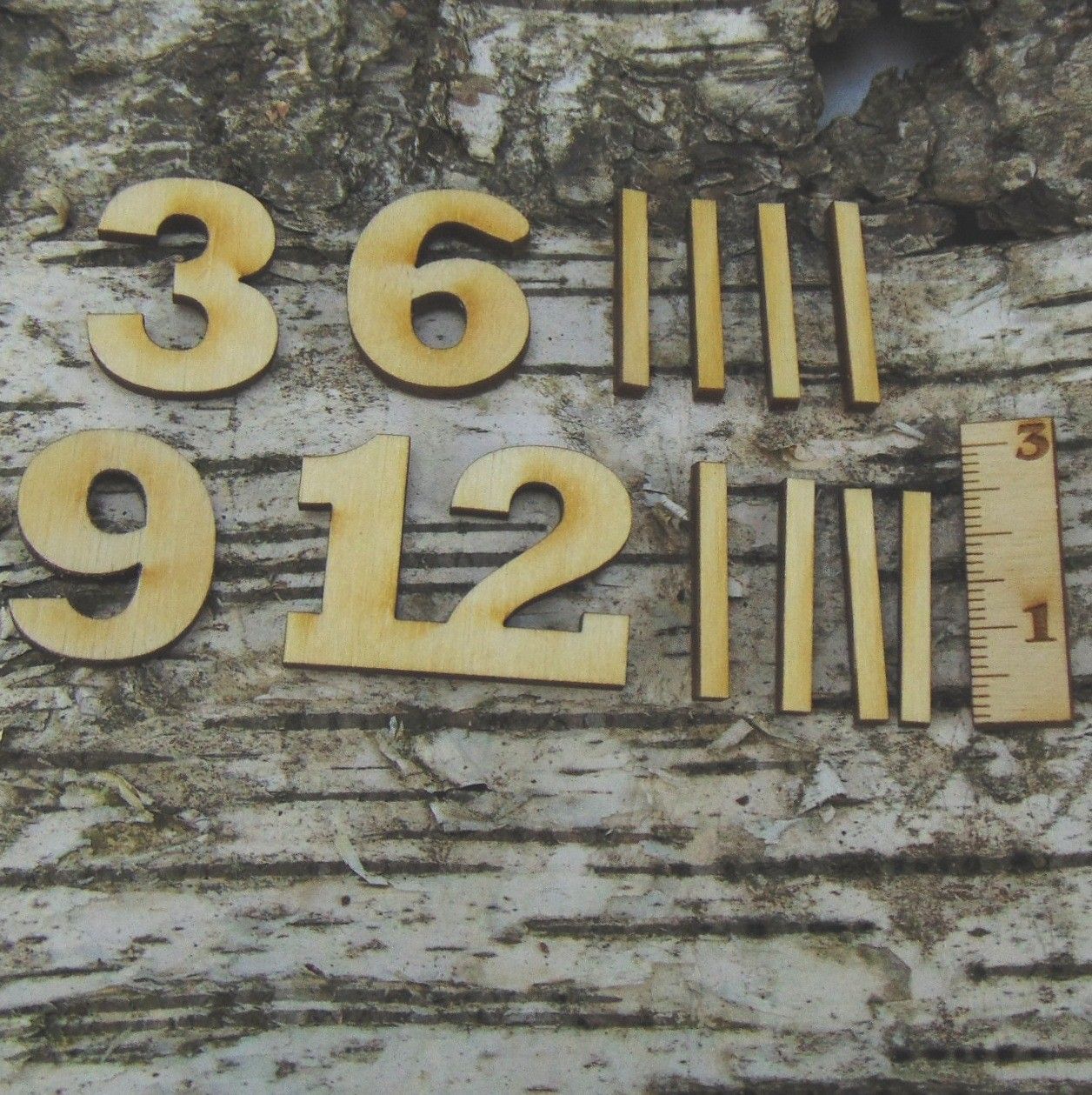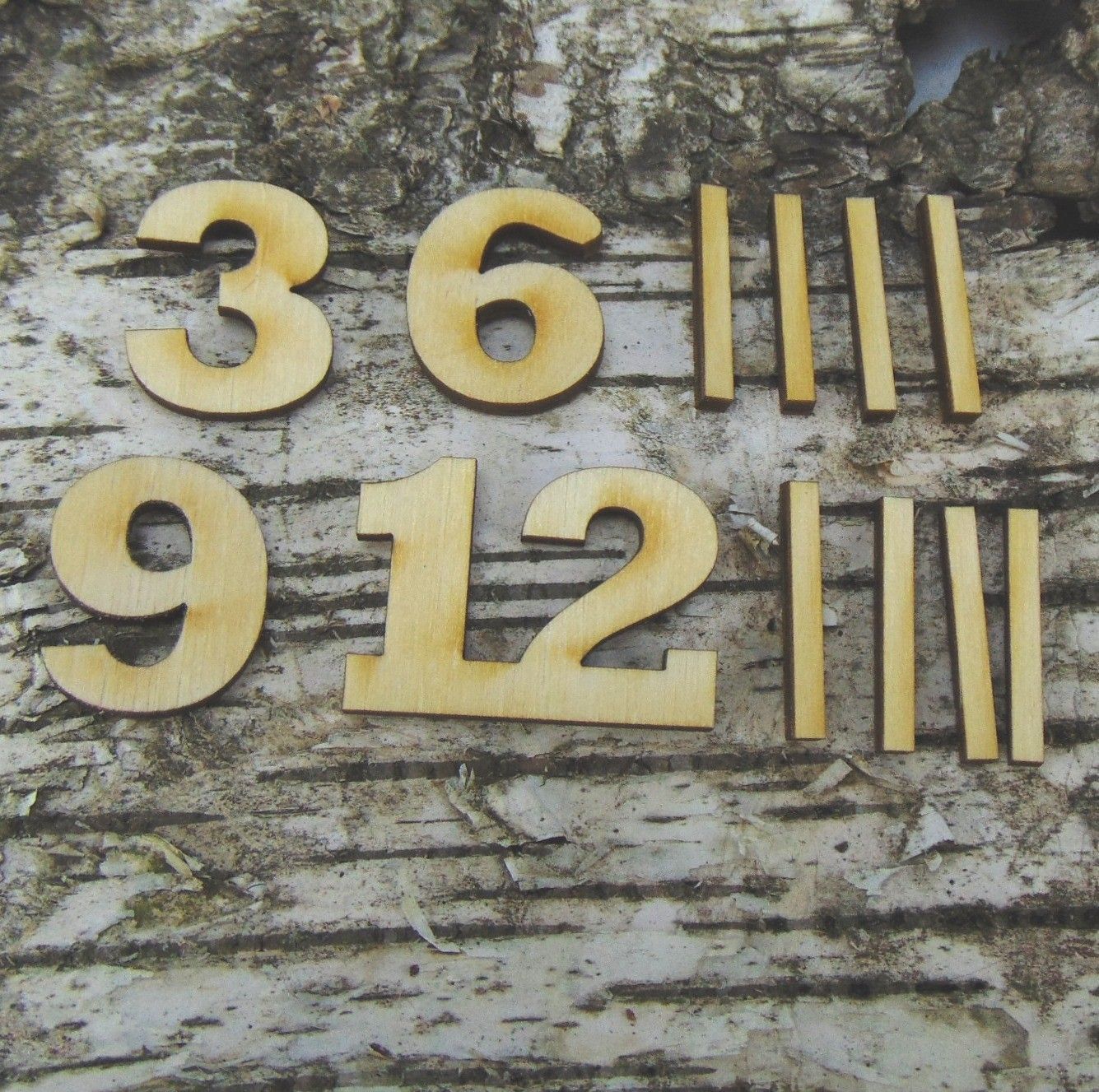 Deutsche Zahlen Ziffern 3 6 9 12 & 8 Striche Holz, in 25mm Höhe zum Basteln für Uhren