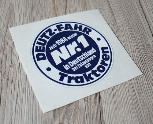 Deutz Fahr Nr1 1984 Aufkleber Hochwertiger Aufkleber Deutz Fahr auch 1984 wieder Nr.1 in Deutschland beim Zulassen von Traktoren Es handelt sich hierbei um eine gegossene Hochleistungsfolie. Die Aufkleber sind schrumpf und lichtecht und finden hauptsätzlich bei Fahrzeugbeschriftungen Verwendung. Höh