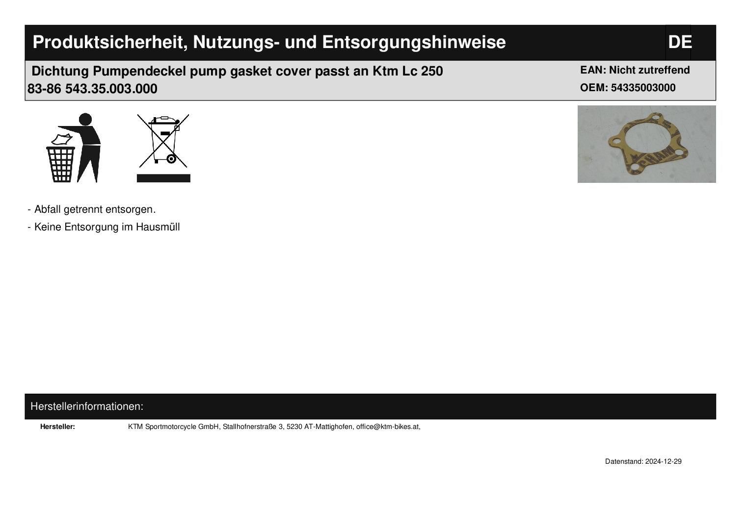 Dichtung Pumpendeckel pump gasket cover passt an Ktm Lc 250 83-86 543.35.003.000