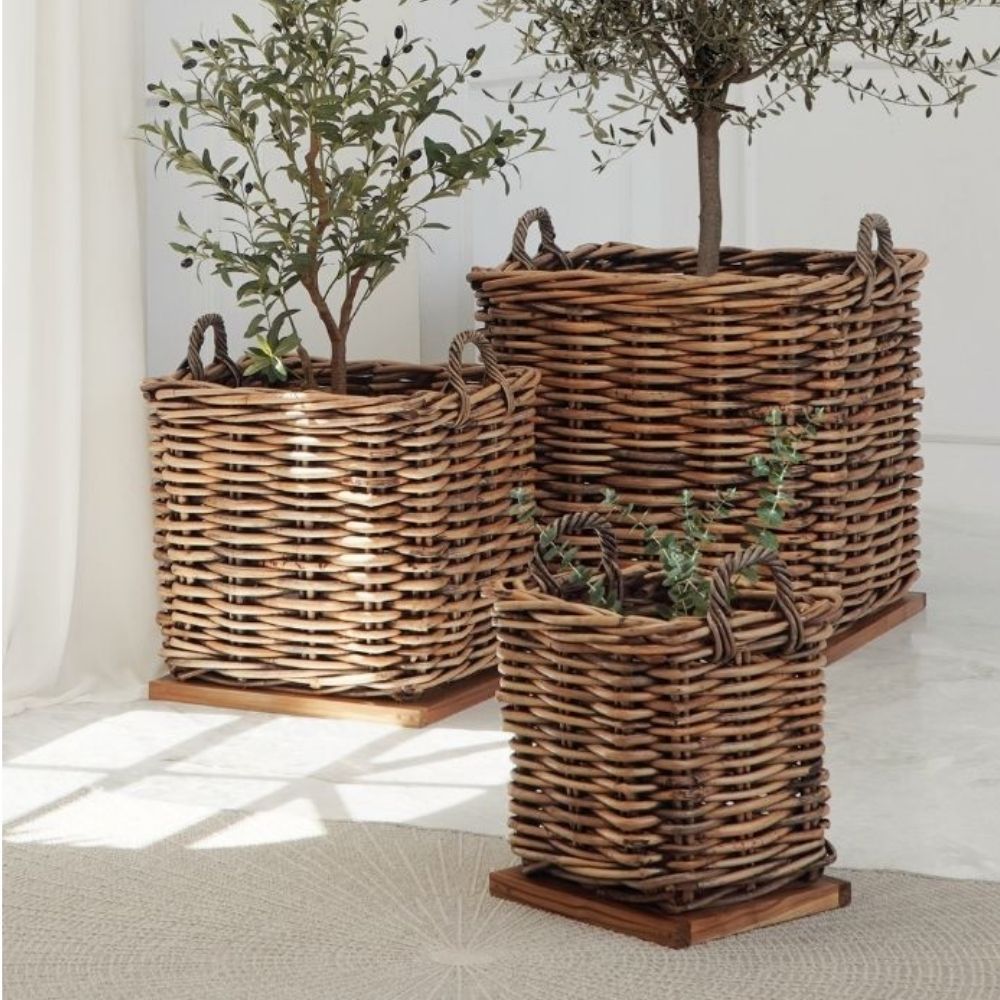 Dickes CL Rattan Korb Cestino braun ca.50cm Teakbodenplatte Pflanzkorb Griffe