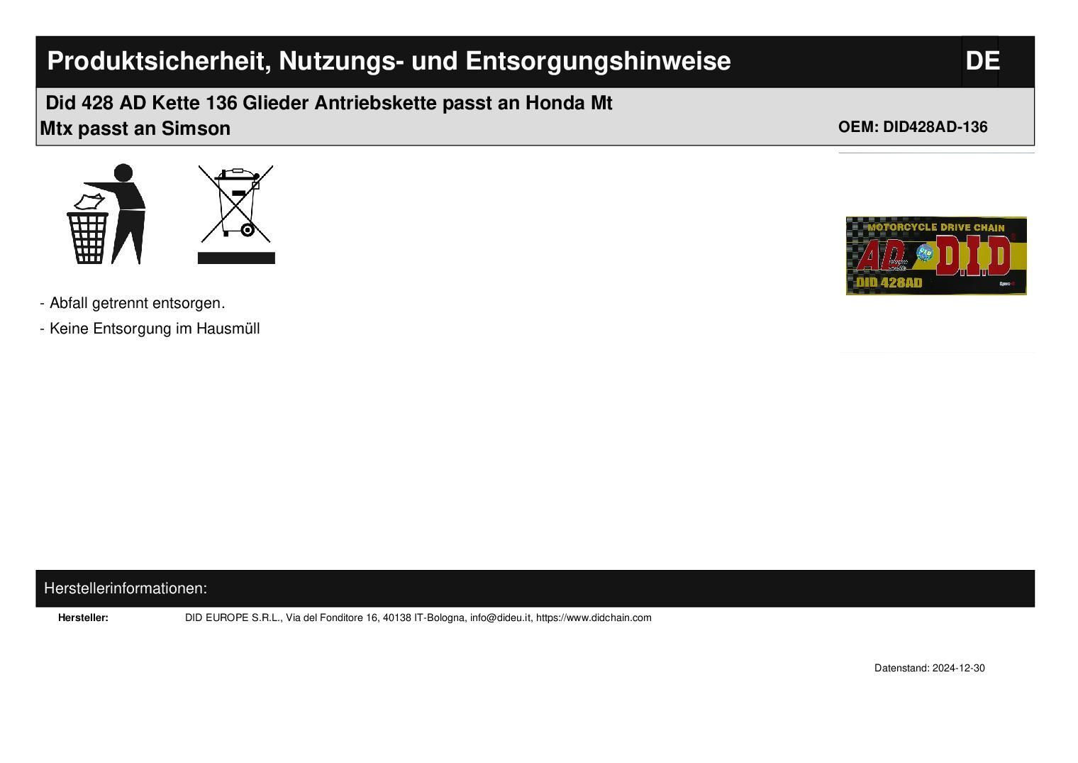 Did 428 AD Kette 136 Glieder Antriebskette passt an Honda Mt Mtx passt an Simson