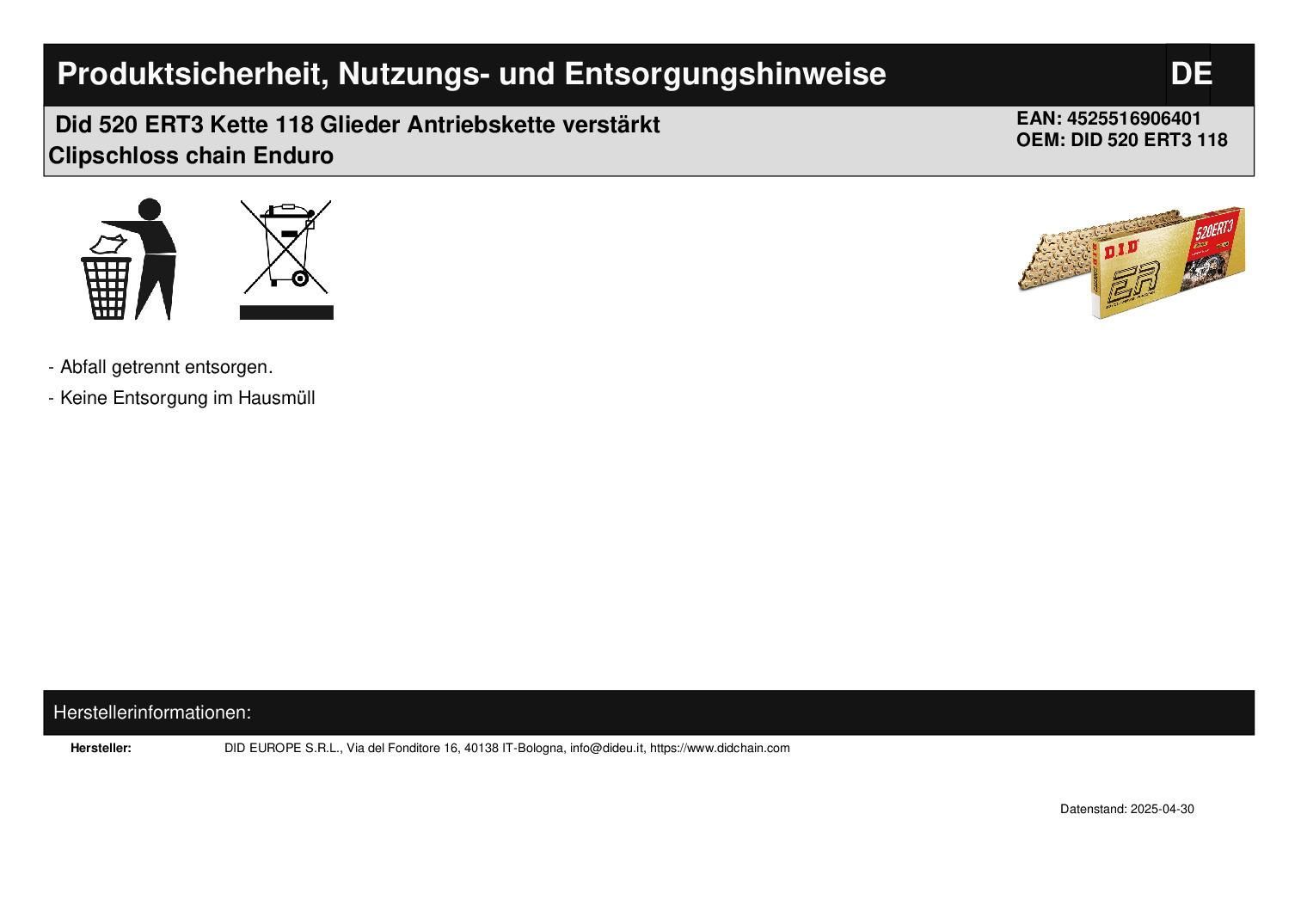 Did 520 ERT3 Kette 118 Glieder Antriebskette verstärkt Clipschloss chain Enduro