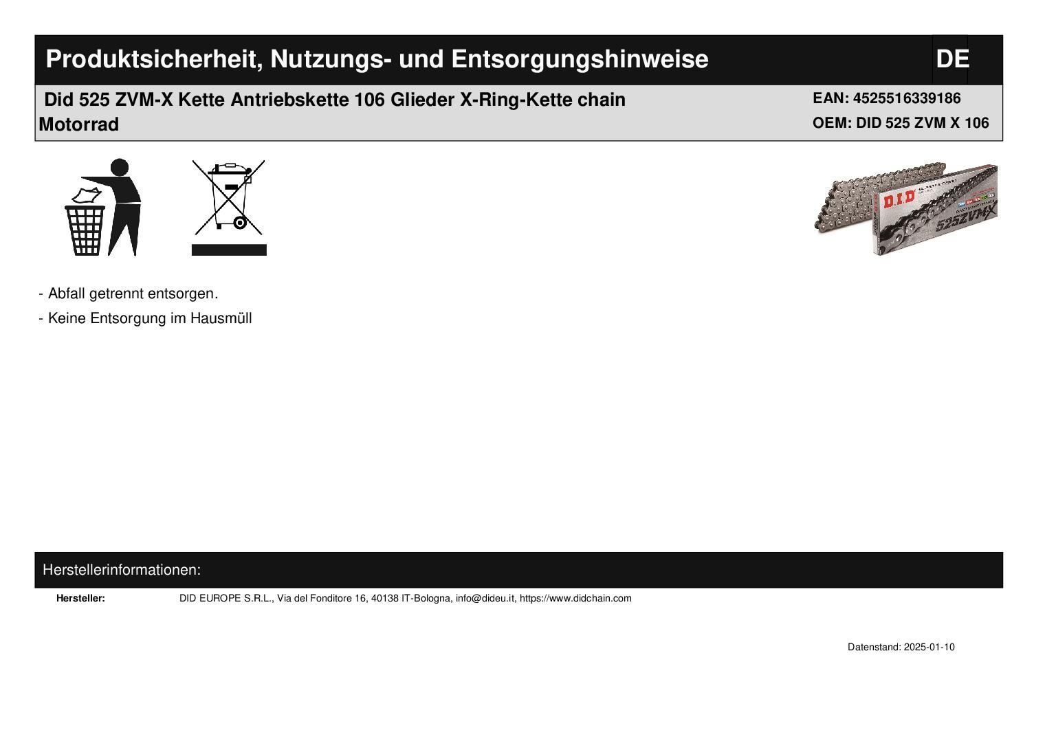 Did 525 ZVM-X Kette Antriebskette 106 Glieder X-Ring-Kette chain Motorrad