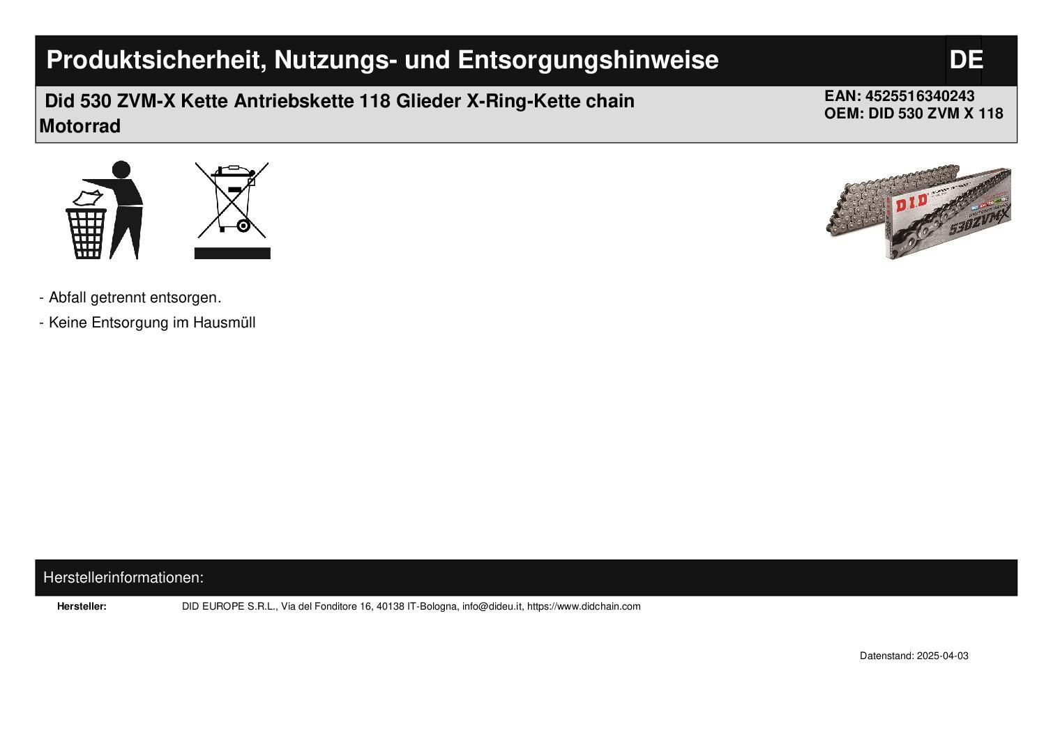 Did 530 ZVM-X Kette Antriebskette 118 Glieder X-Ring-Kette chain Motorrad