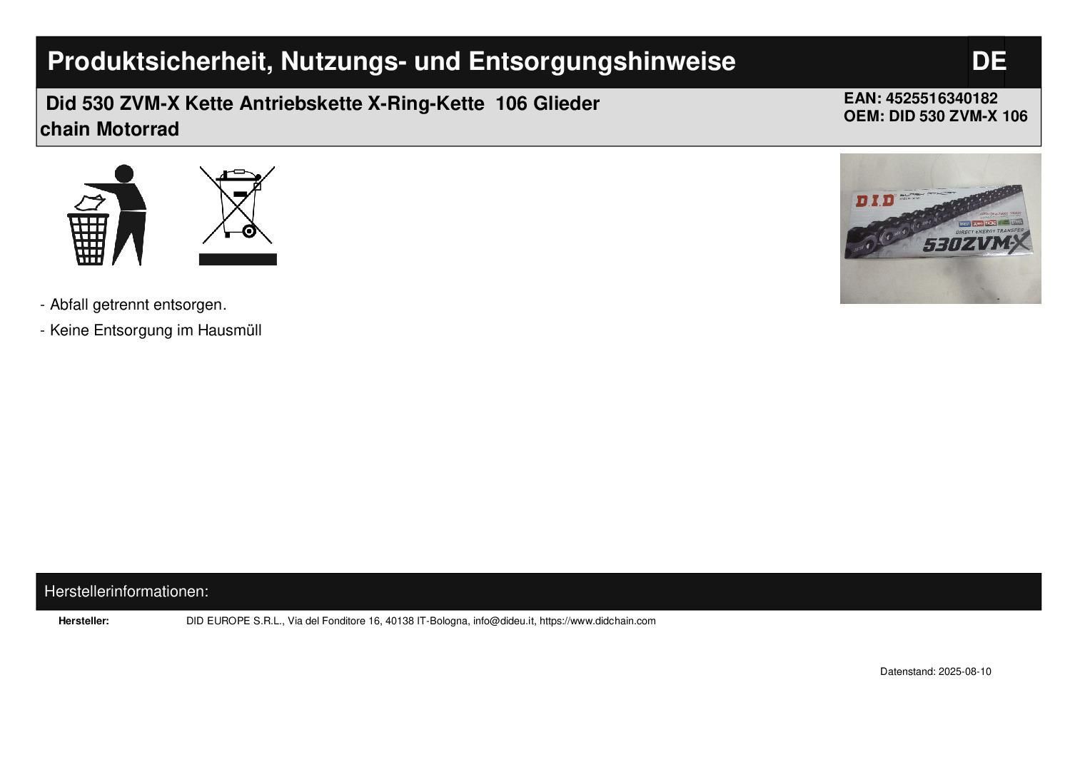 Did 530 ZVM-X Kette Antriebskette X-Ring-Kette 106 Glieder chain Motorrad