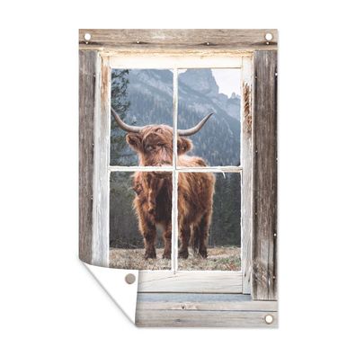 Gartenposter - Schottisches Hochlandrind - Aussicht - Berg - Bäume - 60x90 cm - Garte