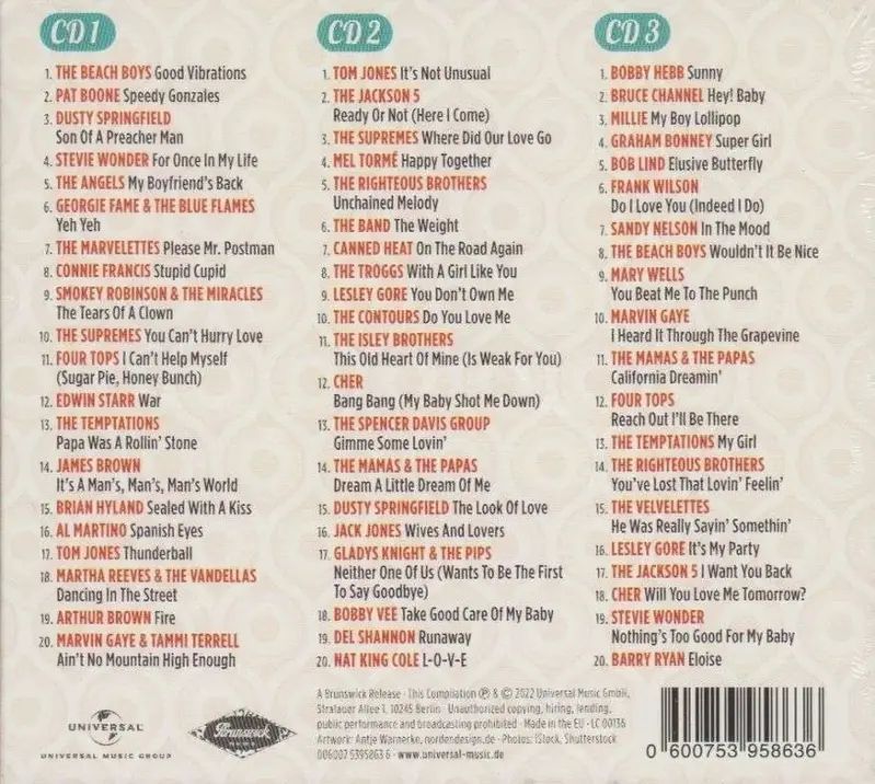 Die größten internationalen Hits der 60er Jahre (3CD) 3 CD (Neu + OVP) EAN: 0600753958636 Die zu sehenden Fotos dienen nur zur Orientierung für mögliche Kaufinteressenten, ist aber keine Veröffentlichung im Sinne des Urheberrechts. Alle Rechte daran bleiben dem Inhaber der Urheberrechte vorbehalten.
