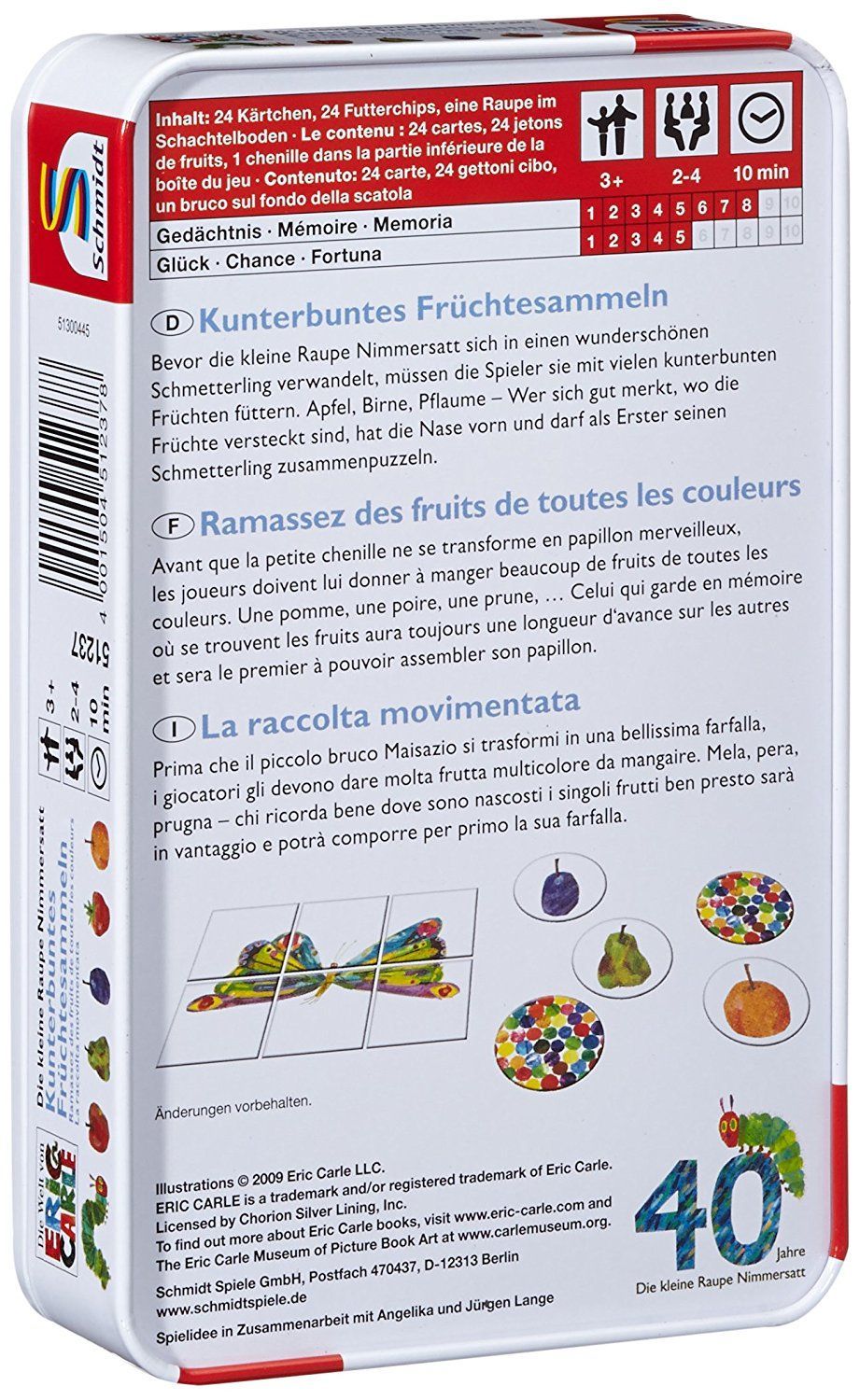 Die kleine Raupe Nimmersatt, Kunterbuntes Früchtesammeln Mitbringspiel in Metalldose