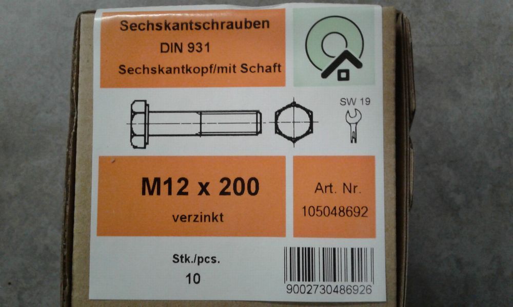 DIN 931 Sechskant-Schaftschraube M12x200 Stahl 8.8 galv. verzinkt 2 Stk
