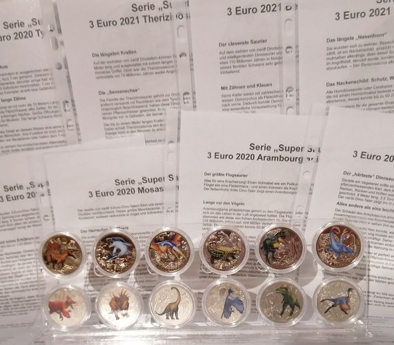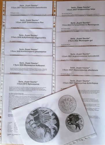 HERZLICH WILLKOMMEN ZU MEINER AUKTION !! GELEGENHEIT ! Ich gebe ab 12 Blatt mit den Beschreibungen jeweils in einer Klarsichtfolie zu den von der Münze Österreich in den Jahren 2019 bis 2022 ausgegebenen 3 Euro Münzen Serie SAURIER passend zu SPINOSAURUS AEGYPTIACUS MOSASAURUS HOFFMANNI ARAMBOURGIAN