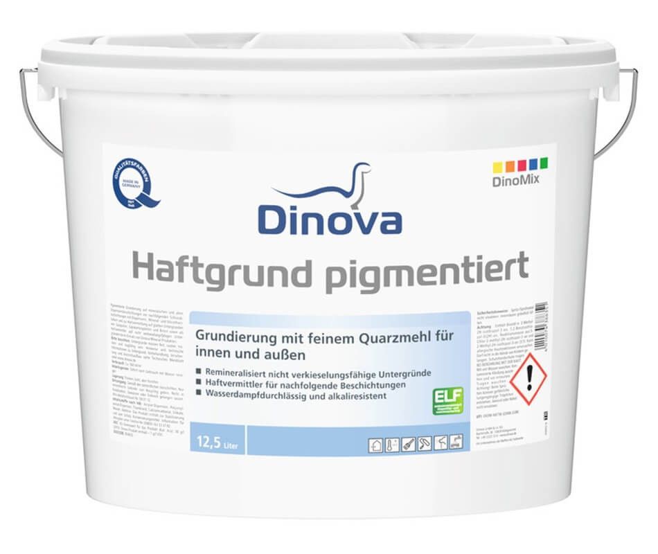 Dinova Haftgrund pigmentiert 12,5 Liter weiß Details für Haftgrund pigmentiert 12,5 Liter weiß: Pigmentierte Grundierfarbe mit feinem Quarzmehl für nachfolgende Anstriche, innen und außen Weiß pigmentierte Grundierung für deckende, glatte Grundanstriche für nachfolgende Schlussbeschichtungen mit Dis