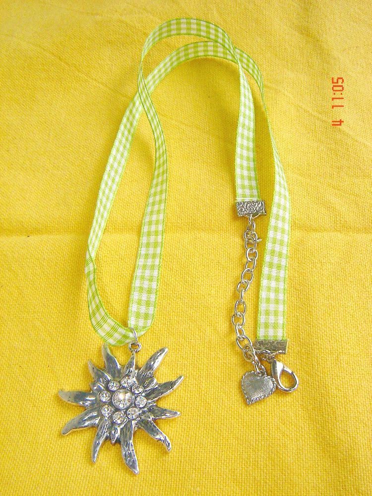 Trachtenschmuck , Dirndlschmuck , Landhausmode wunderschöne süße Dirndlkette mit einem Edelweiß Anhänger mit 9 Straßsteinen besetzt mit einem hellgrünweiß kariertem Bändchen , Länge ca. 54 + Verlängerungs Kettchen cm auf Wunsch auch gerne kürzer der Anhänger ist ca 3,5 cmim Durchmesser ausgezeichnet