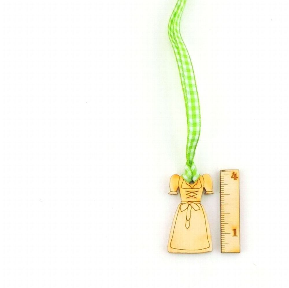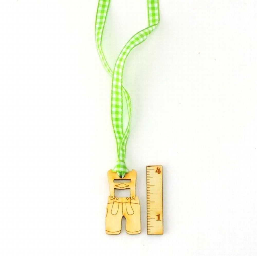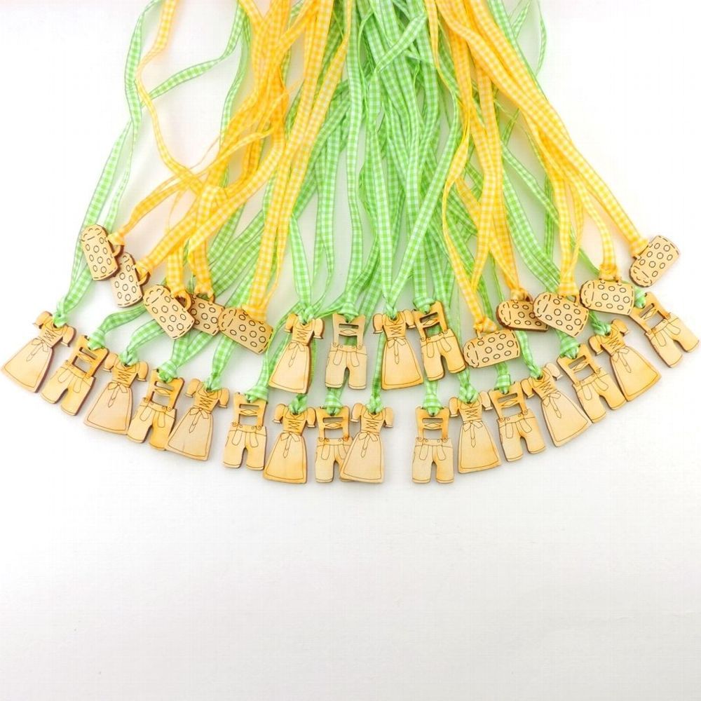um Oktoberfest aus 3mm starkem heimischem Birkenspeerholz: 10 Stück Maßkrug - mit gelb kariertem Band 10 Stück Dirndl - mit grün kariertem Band 10 Stück Lederhosen - mit grün kariertem Band Höhe Bierkrug: 3cm Dirndl: 4cm Lederhose: 4 cm