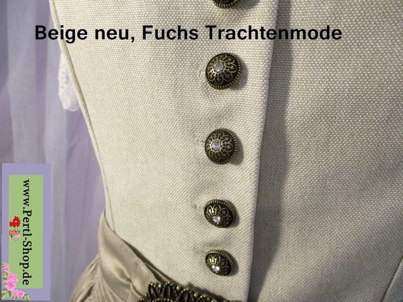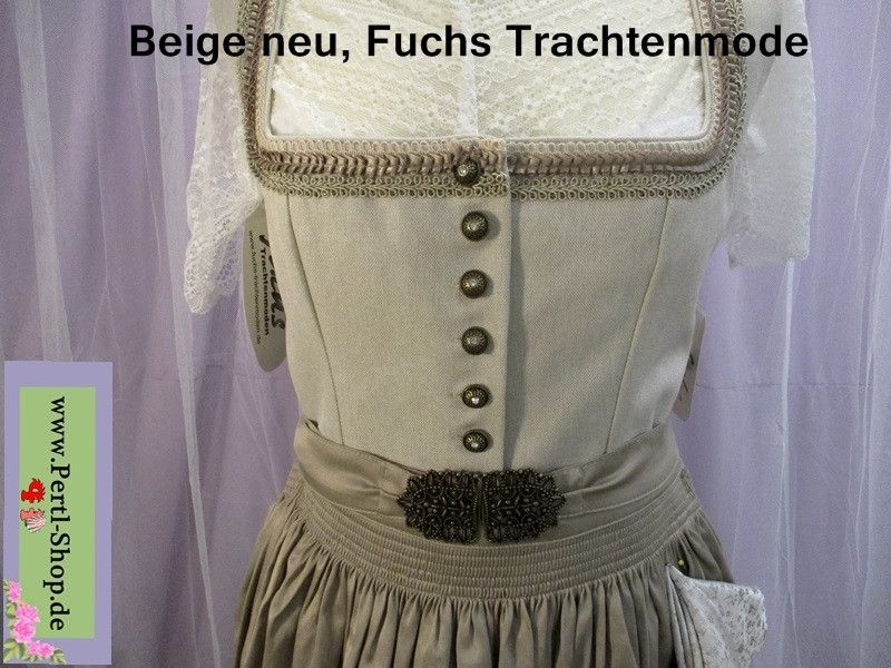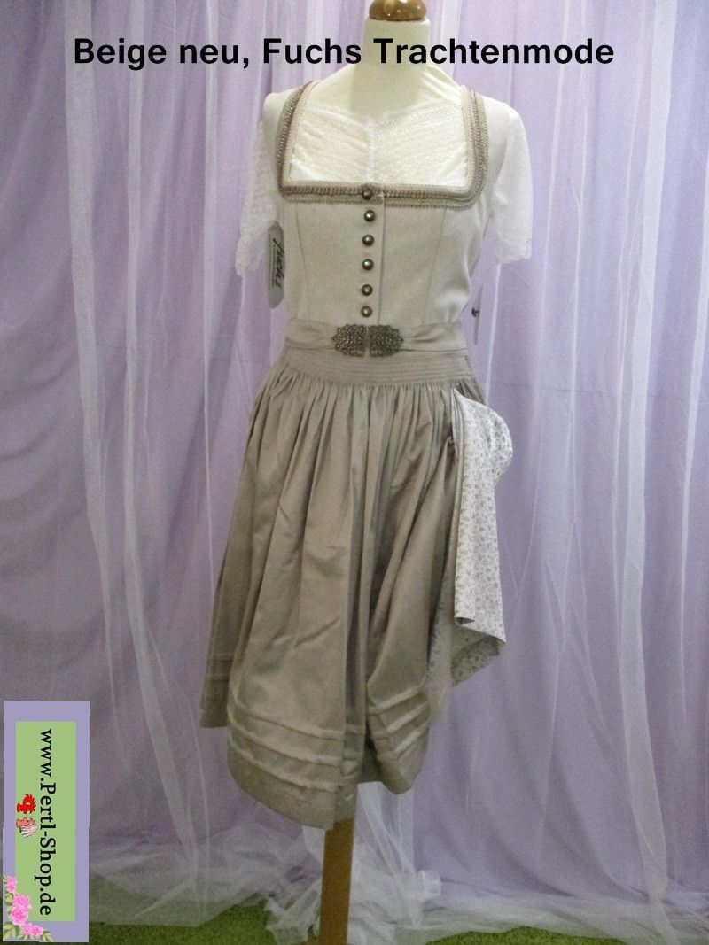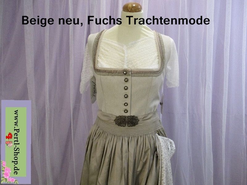 Dirndl mit Schürze. Schürze mit Spange Leinenoptik Farbe: Beige Fuchs Trachtenmode Neuware Gr. 44 Rocklänge 65 cm Rückenlänge 42 cm ab Schulternaht Taillenumfang 88 cm Brustumfang 106 cm Material: 100 % Polyester Kaufpreis ist ohne Dirndlbluse