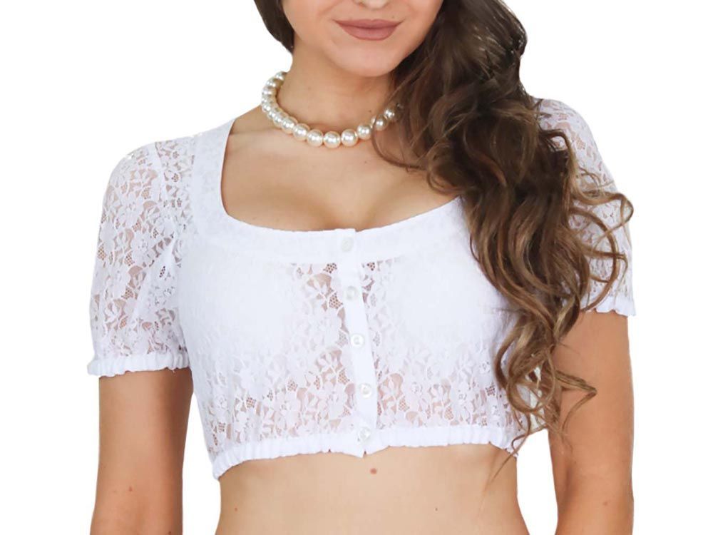 Dirndlbluse Marilyn weiß Süße Dirndlbluse aus Spitze in weiß. Die süße Dirndlbluse hat kurze Ärmel und einen runden Halsausschnitt, der sich super zu vielen Dirndln kombinieren lässt. Material: 89% Polyamid, 11% Elasthan Lieferumfang: Eine Dirndlbluse. Weiteres Zubehör ist nicht im Lieferumfang enthalten.