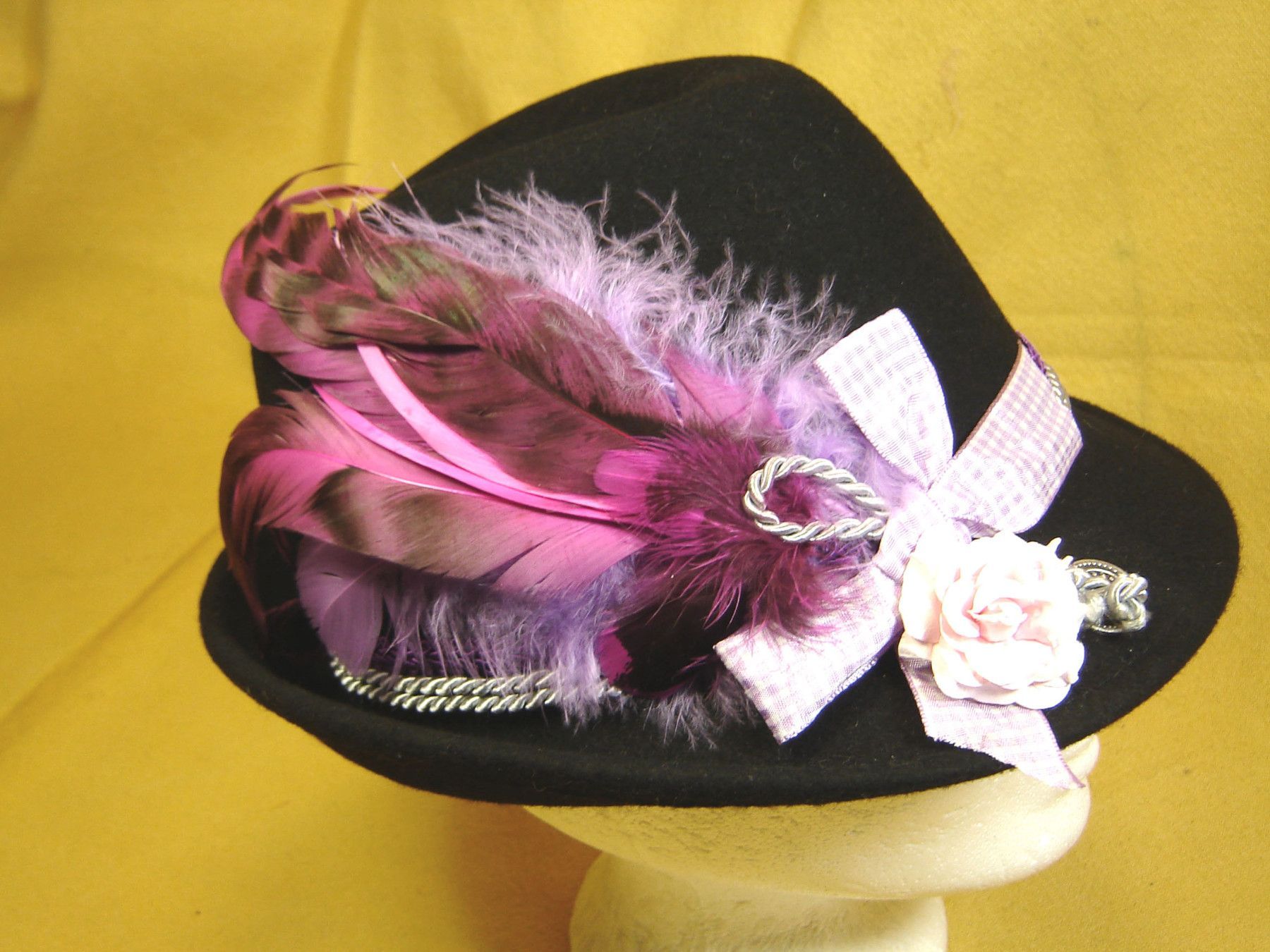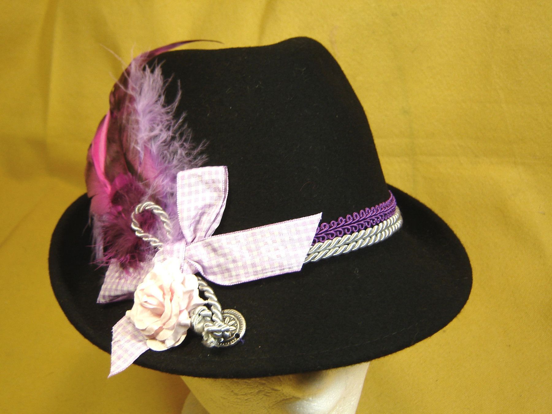 frecher kleiner Damenhut Trachtenhut Dirndlhut in der topaktuellen schmalen Form Einzelstücke aus meiner eigenen Kollektion aus strapazierfähigem 100% Wollfilz wetterfest in Farbe schwarz in 3 Varianten entweder mit Seidenkordel und Borte lila und lila Federgesteck , Größe 57 58 cm Kopfumfang oder m