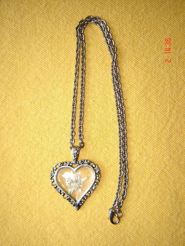 . Dirndlkette , Trachtenschmuck , Dirndlschmuck , Halskette ganz süße Dirndlkette im alten Stil , wie zu Großmutters Zeiten 48 cm lange altpatinierte Kette mit einem wunderschönen Herz Anhänger mit echtem Edelweiß unter Glas ( Plexiglas ) Durchmesser 3,5 cm ausgezeichnet verarbeitet aus deutscher He
