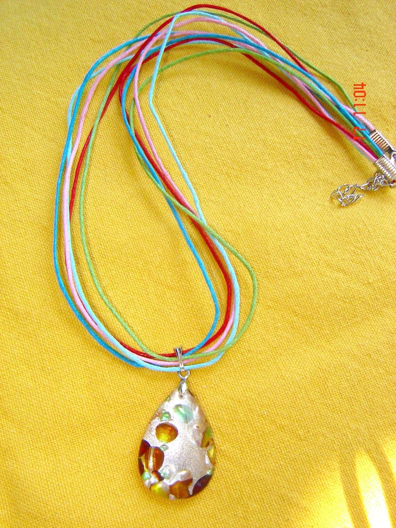 wunderschöne moderne Dirndlkette , die man auch zu anderen Anlässen tragen kann wie zum Sommerkleid oder um ein schönes Shirt aufzupeppen Glastropfen mit glitzernden bunten Einschlüssen der Anhänger ist ca 2cm breit und gesamt ca 4 cm lang ausgezeichnete Verarbeitung an 5 feinen bunten gewachsten Ko